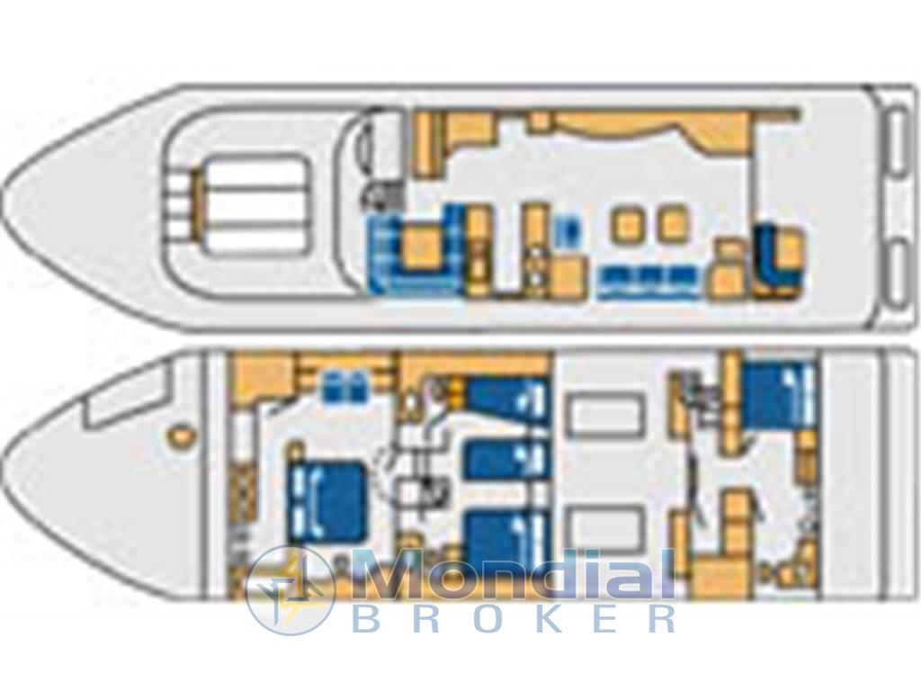 Notas internasNotas de la instrumentaciónAngolo barra, Antenna radar, Bussola, Comando motori elettronico, Computer di bordo, Contametri catena, Contamiglia, Cronometro, Display, Ecoscandaglio, GPS, Interfono, Pilota automatico, Plotter, Radar, Radio VHF, SSB, Stazione vento.Notas de armamentoAllestimento tecnico e di coperta:Allarme fumo/gas, Allarme motore, Allarme sentina, Autogonfiabile, 3 Caricabatterie, Doccia esterna, Doppia timoneria, Elica di poppa - stern thruster, Elica di prua - bow thruster, Faro orientabile, Flap idraulici (N°2), Gruette, Hard top, Impianto antincendio, Indicatori Flaps, Lavaggio catena, Luci di cortesia, Luci subacquee, Passerella (idraulica), Piattaforma, Pompa di sentina automatica, Pompa di sentina manuale, Porta laterale, Pozzetto Teak, Presa 220V banchina, Presa acqua banchina, Raddrizzatore, Rollbar, Salpa Ancore Elettrico, Scala reale, Scaletta da bagno, Sistema Depurazione acque nere, Stabilizzatori, Tavolo pozzetto, Tientibene con cancelletti, Tromba, T-Top, Winch, Winch tonneggio di poppa, Winch tonneggio di prua. Dotazioni domestiche di bordo: Aria condizionata, BBQ/ Grill, Impianto acque nere, Prese interne 12v, Prese interne 220v, Riscaldamento, 4 WC marino elettrico. Intrattenimento: Altoparlanti, Antenna Satellitare TV, Decoder satellite, Digitale Terrestre, DVD, Home Theater, Impianto TV, Radio AM/FM, Ricevitore satellitare, Stereo, 5 TV. Cucina ed elettrodomestici: Asciugatrice, Congelatore, Cucina, Fornello, Forno, Frigorifero esterno, Frigorifero interno, Ghiacciaia, ICE Maker, Lavastoviglie, Lavatrice, Macchina caffè, Microonde, Piastra in vetroceramica. Tappezzerie: Cappottina, Copripozzetto, Cuscineria completa, Cuscineria di poppa, Cuscineria di prua, Cuscineria fly, Teli chiusura T-Top, Teli copri finestra, Telo Copertura Fly, Telo copriconsolle, Telo coprisedile, Tendalino. |