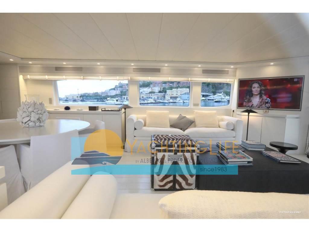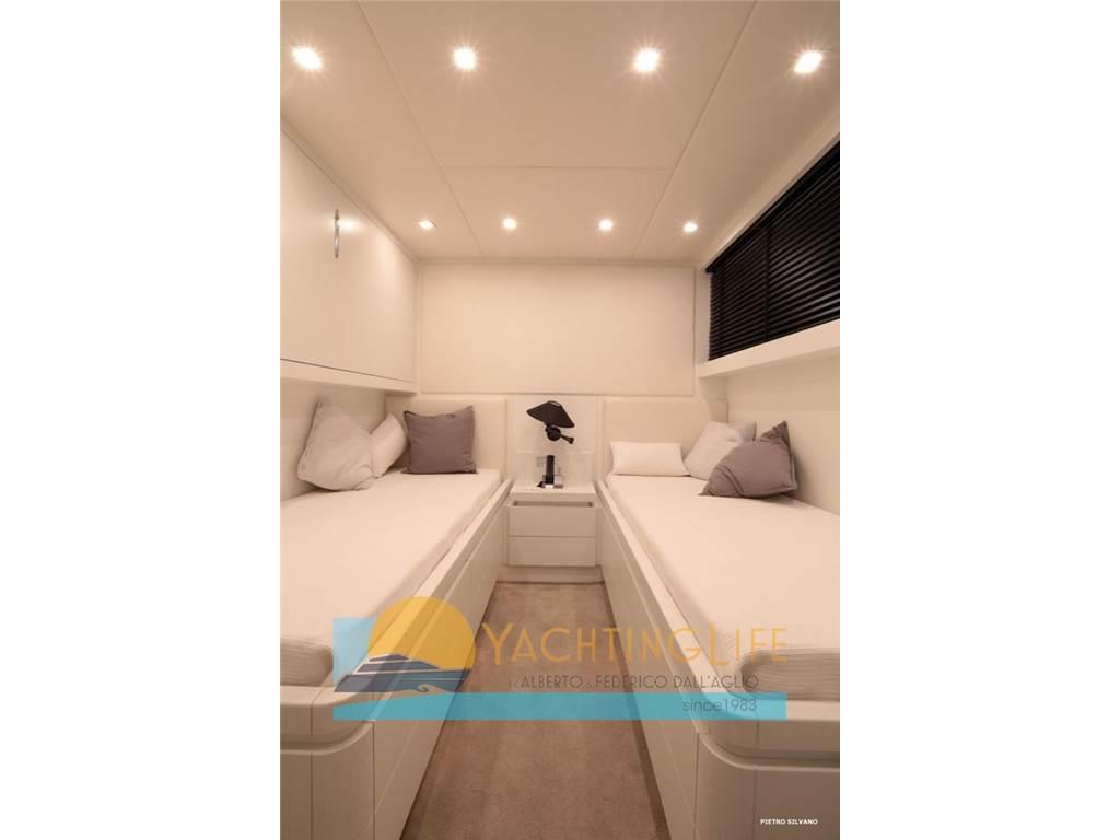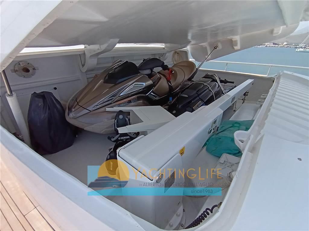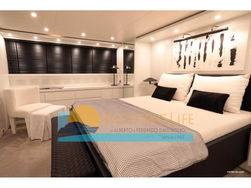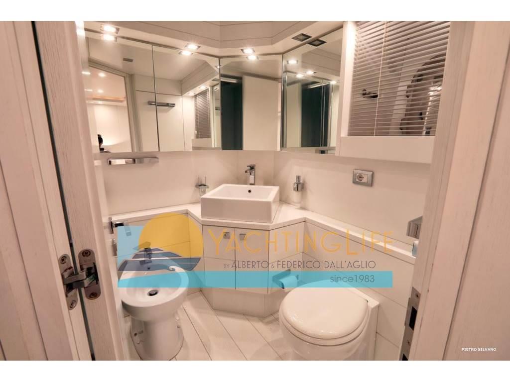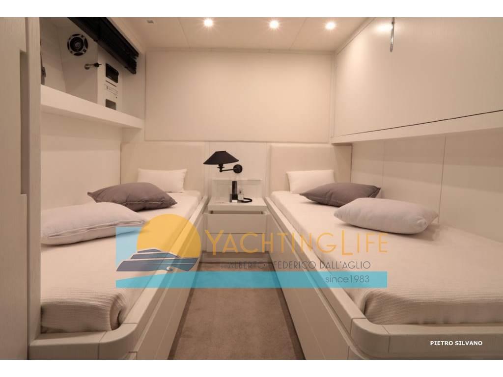 Notas de armamentoAltoparlanti, Antenna Satellitare TV, Aria condizionata, Asciugatrice, Aspirapolvere centralizzato, Bimini, Boiler, Cassaforte, Congelatore, Cucina, Cuscineria di poppa, Cuscineria di prua, Cuscineria fly, Decoder satellite, Digitale Terrestre, Dissalatore, DVD, Forno, Frigorifero esterno, Frigorifero interno, Ghiacciaia, ICE Maker, Impianto acque nere, Impianto TV, Lavastoviglie, Lavatrice, Meccanismo saliscendi per TV, Microonde, Pavimento interno in legno, Piastra in vetroceramica, Prese interne 12v, Prese interne 220v, Riscaldamento, Serbatoio Acque Nere, Stereo, Telecamera, Telo copriconsolle, Telo coprisedile, 5 TV, 6 WC marino elettrico