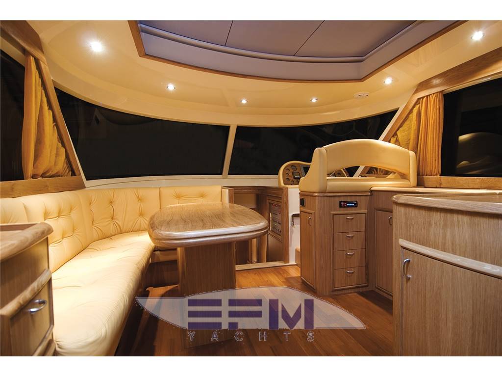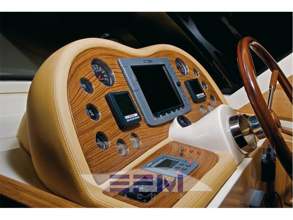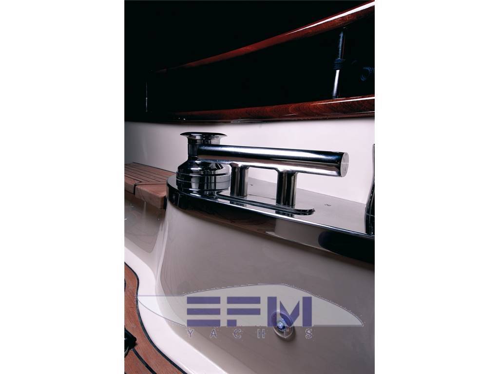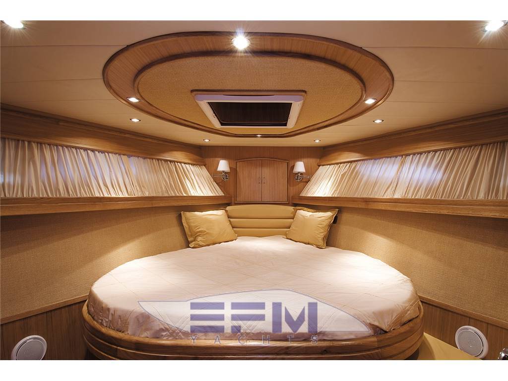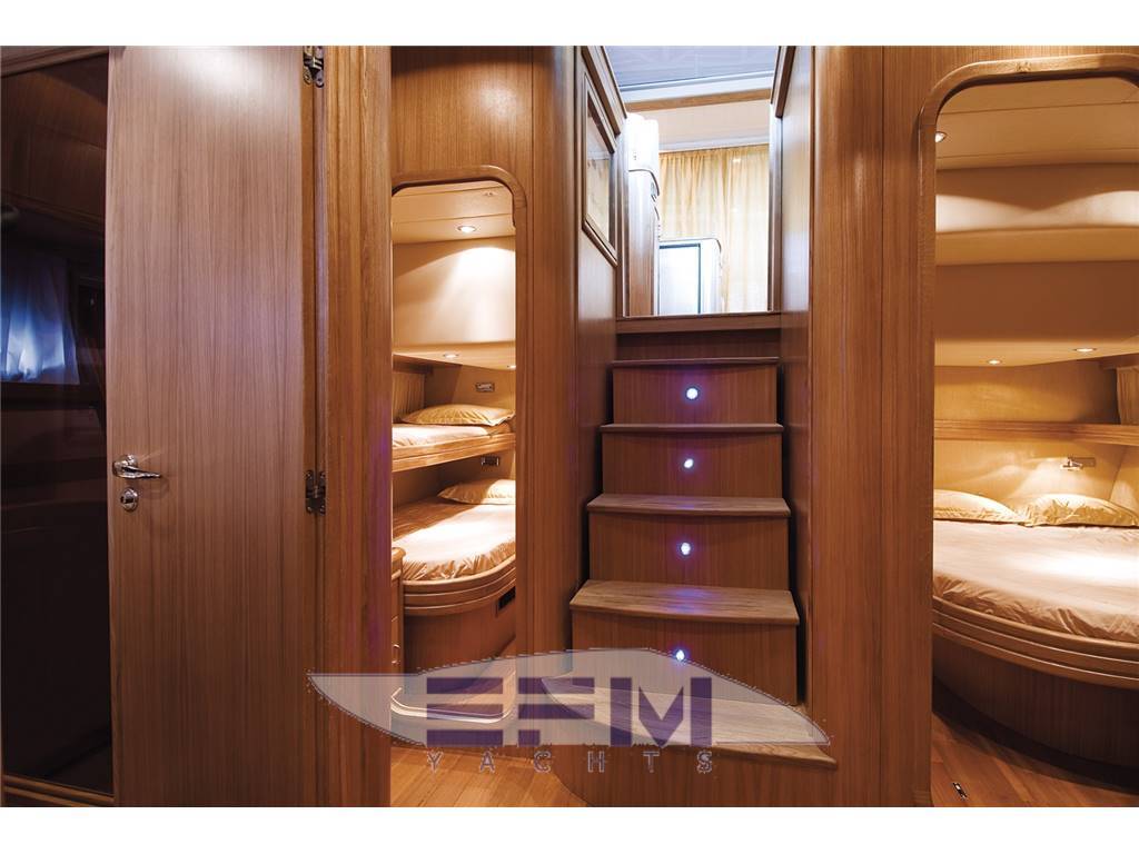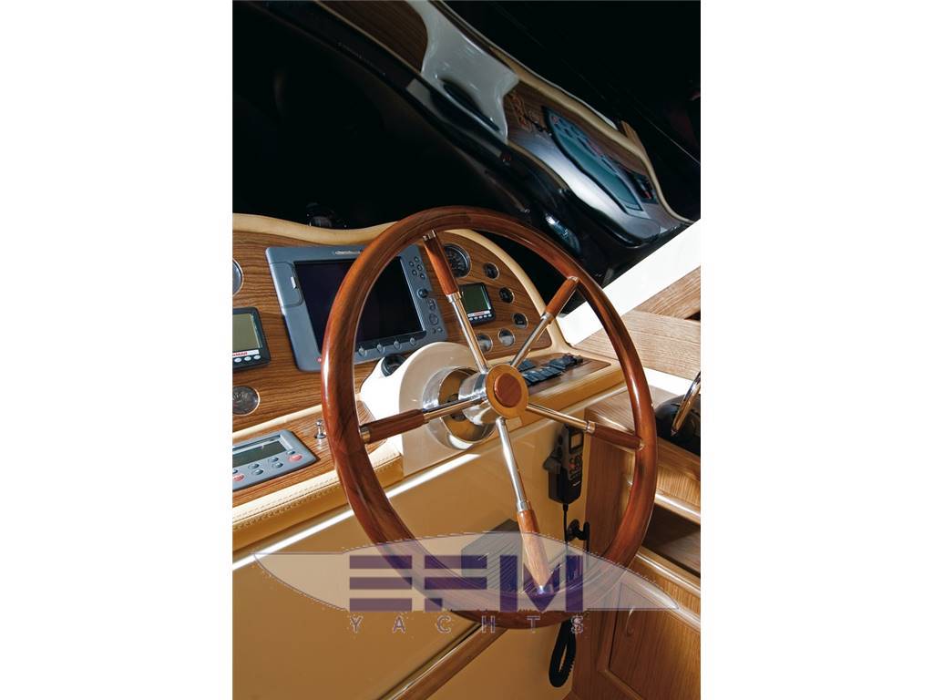 Plancia – Ruota timone in legno e acciaio inox – Plancia di comando con mobile ed alloggio del sedile guida – Cucina attrezzata – Zona giorno con divano con tavolo – Chiusura posteriore in acciaio inox con porte scorrevoli – Cabina armatore con locale bagno, 2 armadi e angolo sedile – Cabina vip con armadio e letto – Cabina ospiti con armadio e letto – Secondo locale con wc separato – 1 cabina equipaggio e servizi a poppa – Tutti gli interni sono realizzati con legni pregiati – Dotati di faretti alogeni.