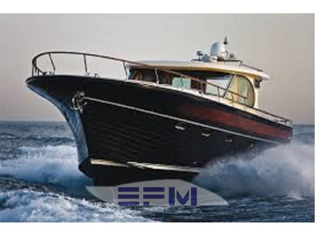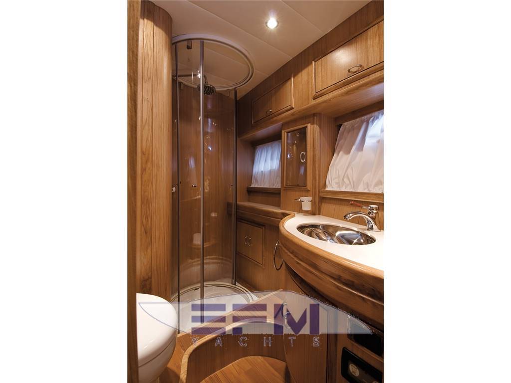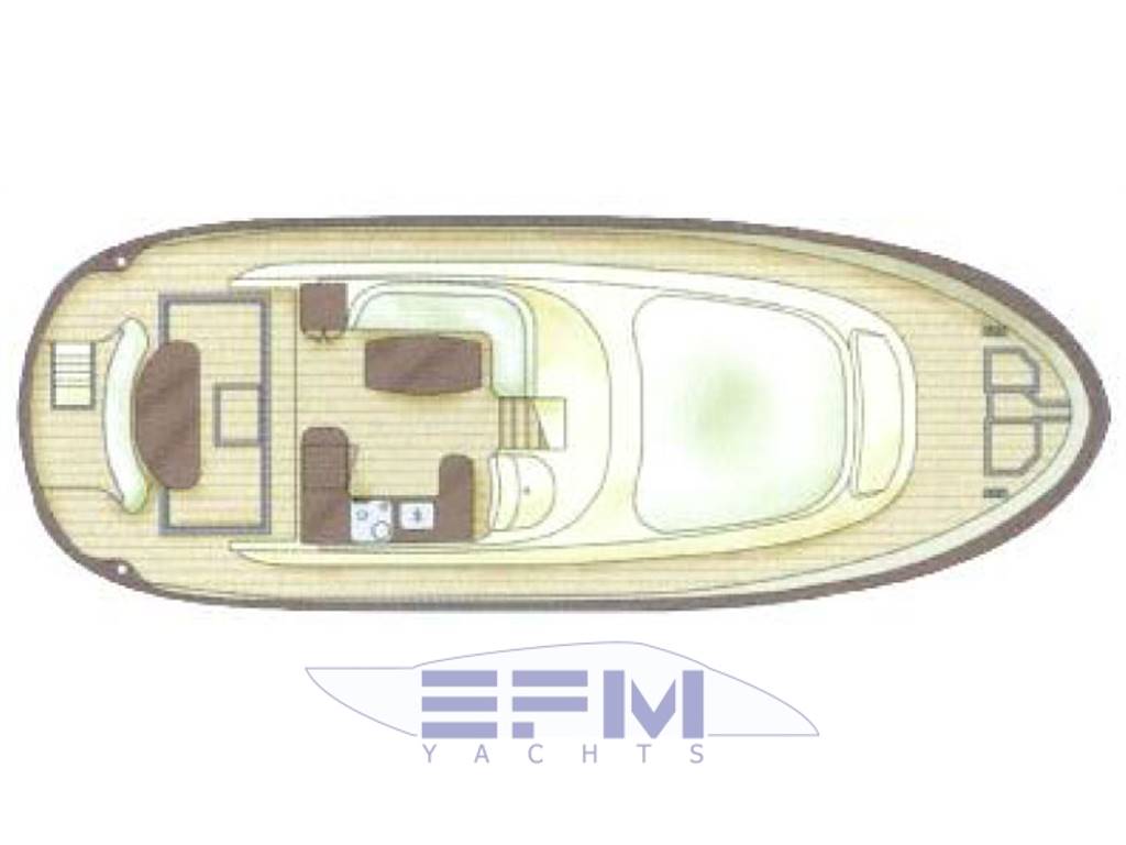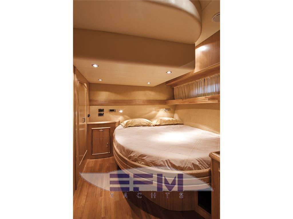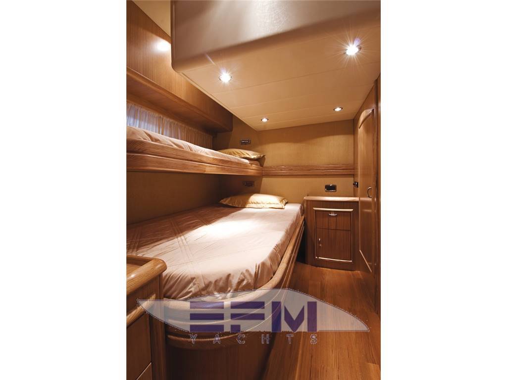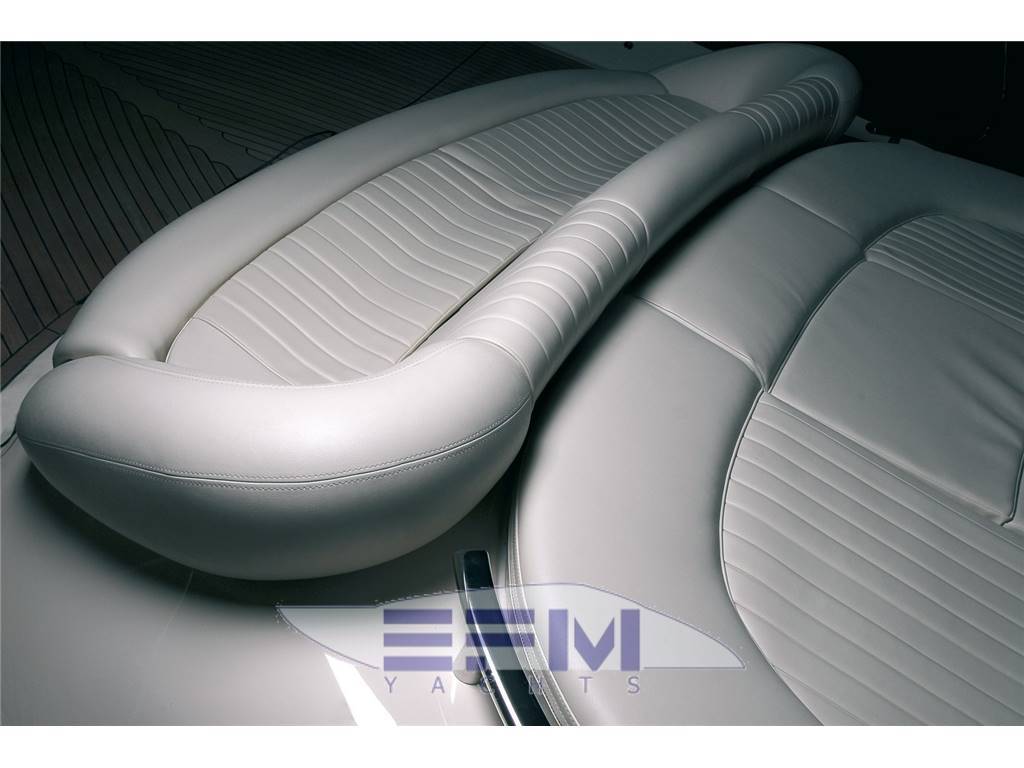 Plancia – Ruota timone in legno e acciaio inox – Plancia di comando con mobile ed alloggio del sedile guida – Cucina attrezzata – Zona giorno con divano con tavolo – Chiusura posteriore in acciaio inox con porte scorrevoli – Cabina armatore con locale bagno, 2 armadi e angolo sedile – Cabina vip con armadio e letto – Cabina ospiti con armadio e letto – Secondo locale con wc separato – 1 cabina equipaggio e servizi a poppa – Tutti gli interni sono realizzati con legni pregiati – Dotati di faretti alogeni.