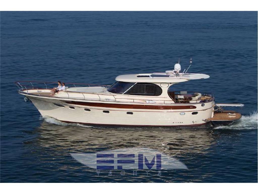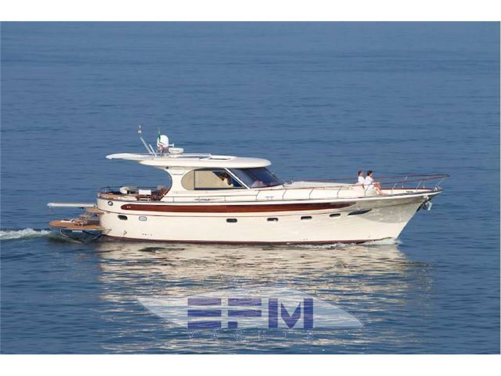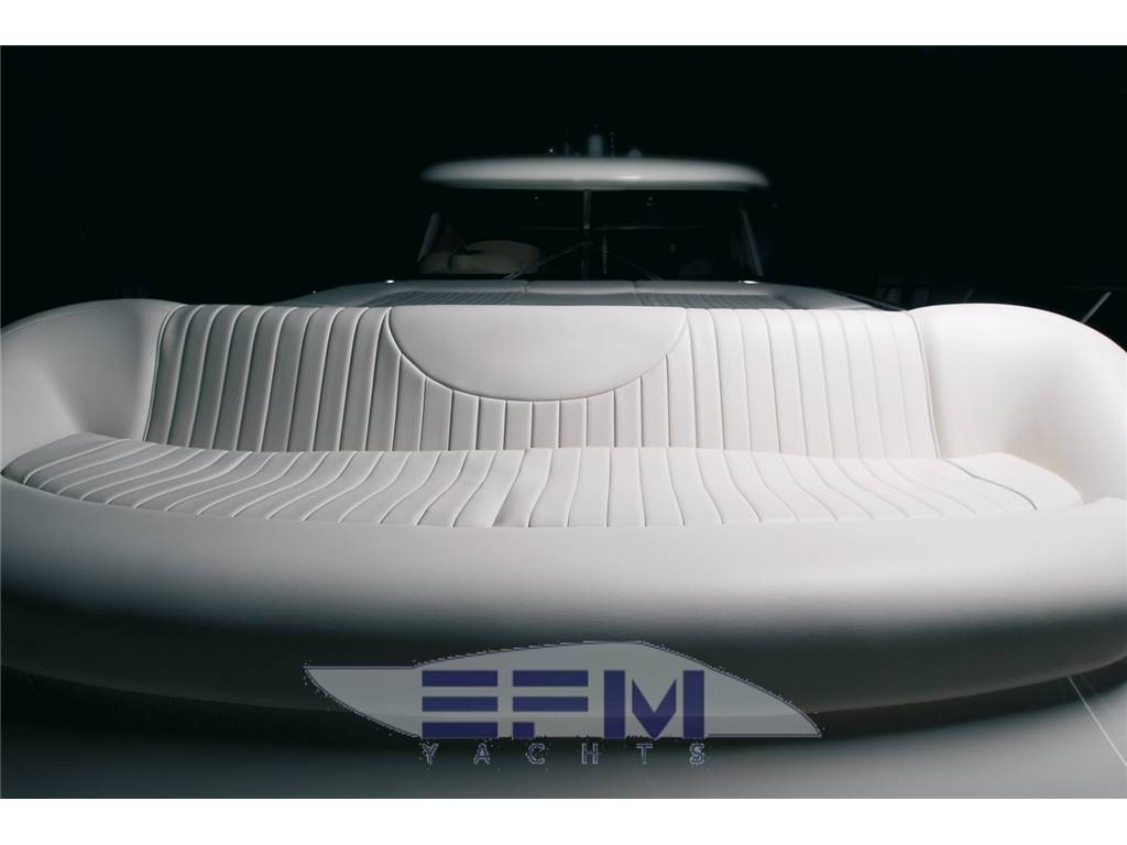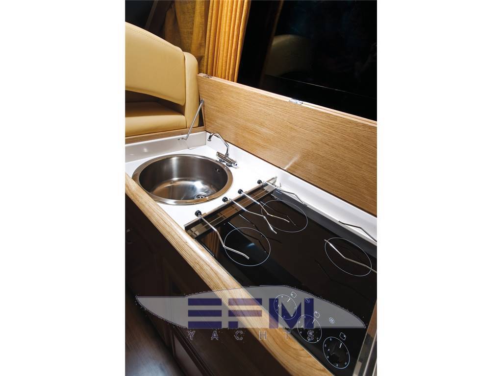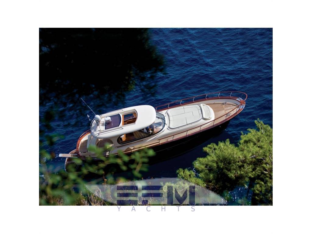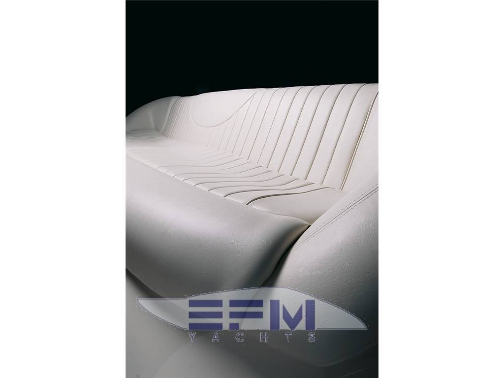 Plancia – Ruota timone in legno e acciaio inox – Plancia di comando con mobile ed alloggio del sedile guida – Cucina attrezzata – Zona giorno con divano con tavolo – Chiusura posteriore in acciaio inox con porte scorrevoli – Cabina armatore con locale bagno, 2 armadi e angolo sedile – Cabina vip con armadio e letto – Cabina ospiti con armadio e letto – Secondo locale con wc separato – 1 cabina equipaggio e servizi a poppa – Tutti gli interni sono realizzati con legni pregiati – Dotati di faretti alogeni.