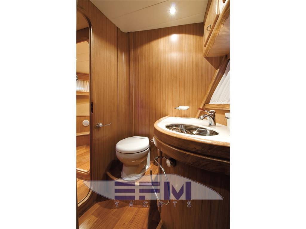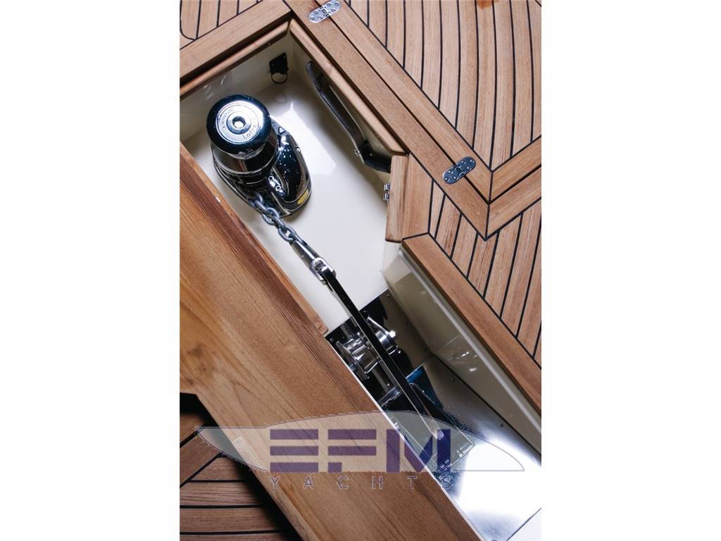 Notas de armamentoCoperta e pozzetto in teak – Falchetta e trincarini in mogano verniciati – Verricello elettrico Salpancora 1500 w con doppio comando ponte e plancia – Ancora in acciaio da 30 Kg. con catena da Mt. 75 – Asta portabandiera.- Aspiratori elettrici – Autoclave – Boiler 220 v capacità 75 lt. – Casse carburante comunicanti 2.700 lt. acciaio inox – Cassa acqua dolce 800 – Cassa acque nere lt. 200 – Flaps – Comandi e indicatori in ogni bagno – Filtri a cestello acqua mare motori e gruppo generatore Filtri gasolio “RACOR” per motori e generatore – Gruppo elettrogeno da 12 Kw con cassa insonorizzante – Impianto antincendio manuale centralizzato e automatico – Impianto di sentina con n° 3 porte a comando automatico – Impianto nafta con comandi intercettazione casse e stop alimentazione – Impianto scarico acque nere centralizzato con sfiato e tubazioni antiodore – Impianto timoneria idraulica comandato dalla ruota del timone in plancia – Insonorizzazione termoacustica – Livello visivo combustibile – Plaffoniere illuminazione – Pompa maceratore scarico acque nere – Scala discesa in acciaio – Scarichi subacquei gas motori – Scarico gas Gruppo Elettrogeno con marmitta separatore – Sonda livello acque nere con allarme troppo pieno solo visivo – Wc elettrici con funzionamento ad acqua salata – Vasca decantatrice per gasolio – Vano impianti con banco officina.