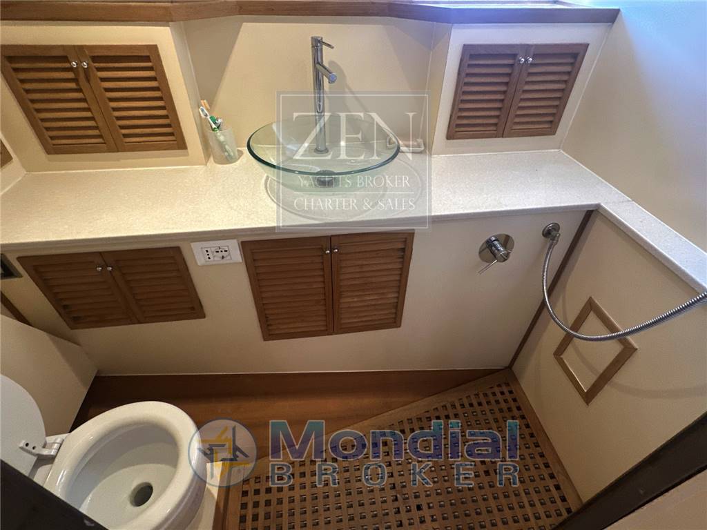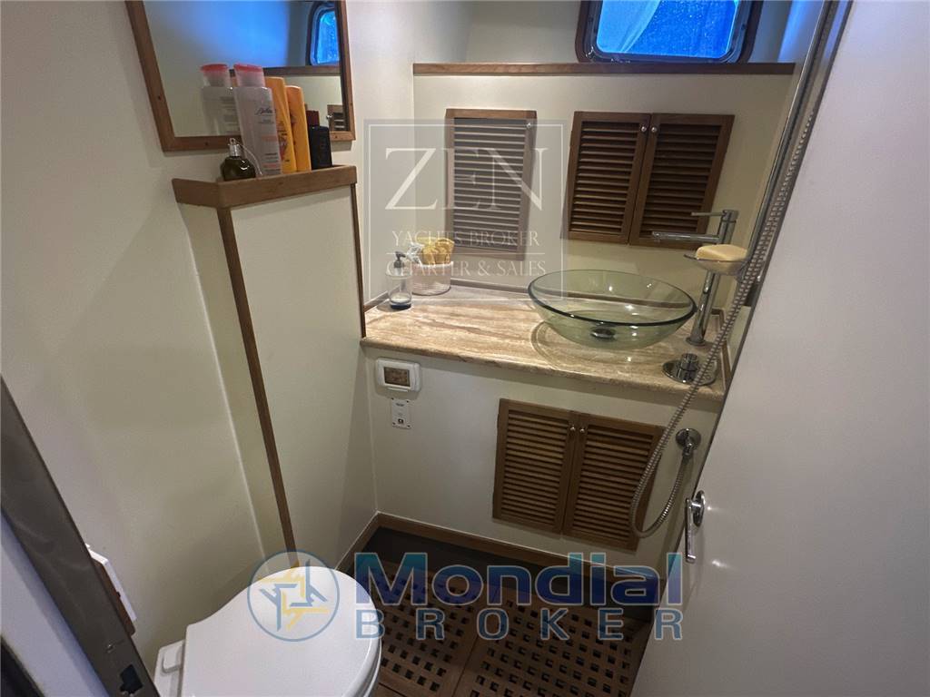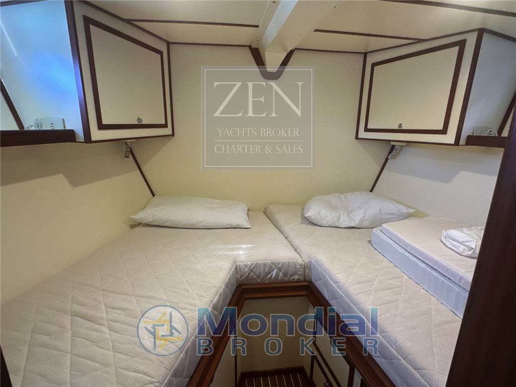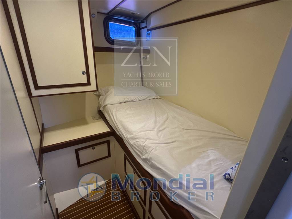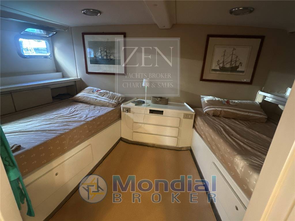 Notas internasSalone (deck saloon) con divano e tavolo. Cucina a prua via ben attrezzata. A prua via si trovano le cabine degli ospiti con la toilette. Le cabine degli ospiti sono due: una con letti singoli affiancati ed una con un letto singolo. Cabina armatore a poppa via con disimpegno anticamera con divano. Cabina con due letti extralarge singoli posizionati a paratia. Toilette privata. Cabina marinaio a prua Notas de la instrumentaciónAutopilota AP3003, GPS Raymarine hybridtouch, VHF, 3 carica batterie (uno per l'elica di prua).Notas de armamentoElica di prua, generatore 17 Kw, carica batterie, passerella, tender con motore FB, forno, piano cucina a 4 fuochi, frigo, |