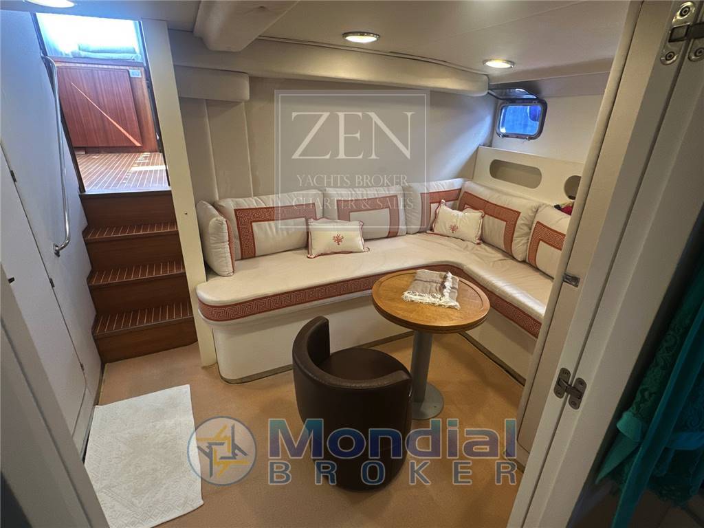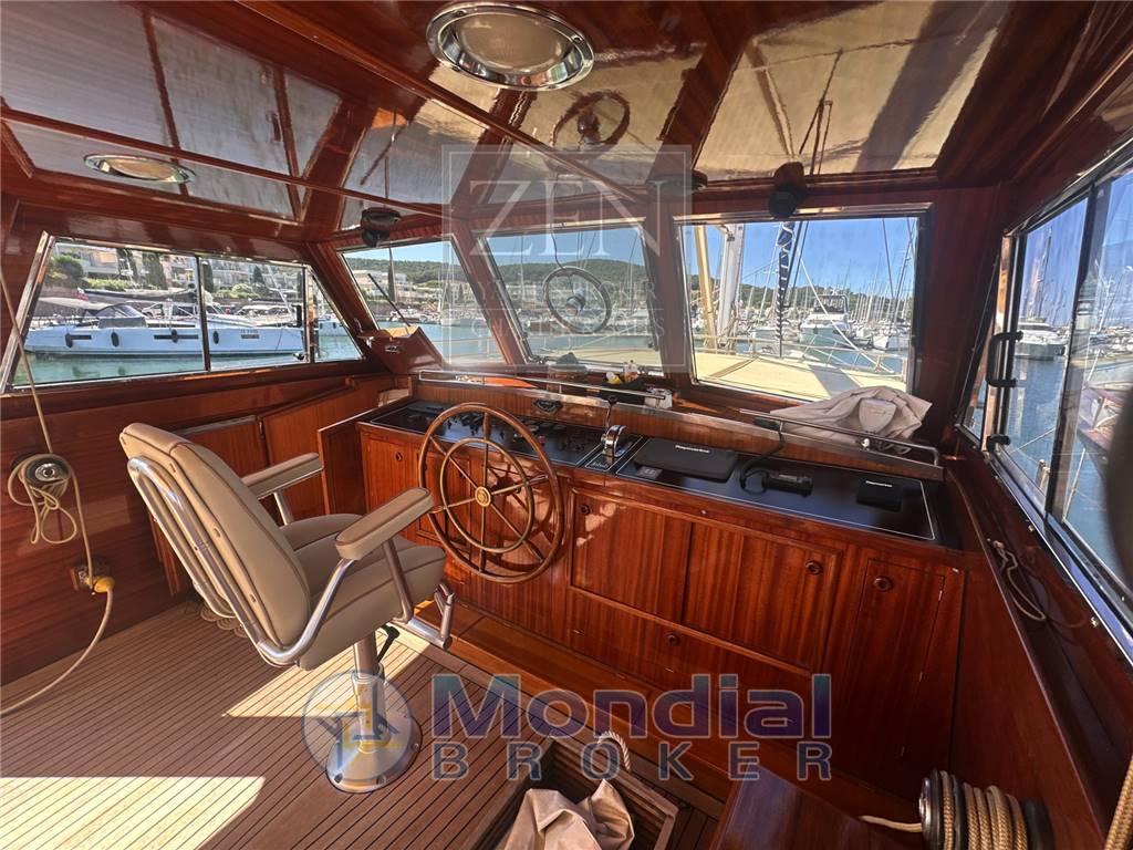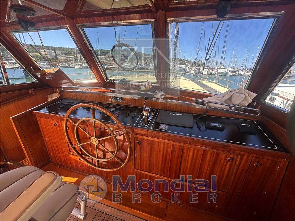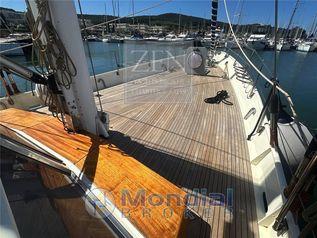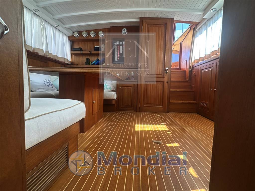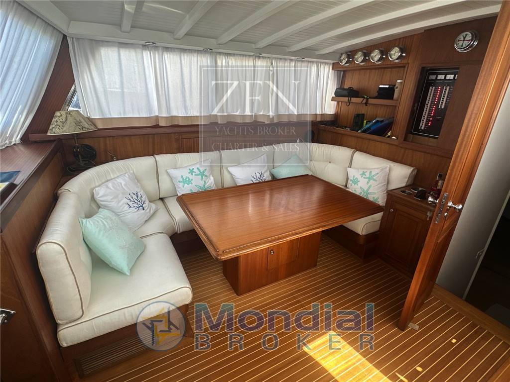 Notas internasSalone (deck saloon) con divano e tavolo. Cucina a prua via ben attrezzata. A prua via si trovano le cabine degli ospiti con la toilette. Le cabine degli ospiti sono due: una con letti singoli affiancati ed una con un letto singolo. Cabina armatore a poppa via con disimpegno anticamera con divano. Cabina con due letti extralarge singoli posizionati a paratia. Toilette privata. Cabina marinaio a prua Notas de la instrumentaciónAutopilota AP3003, GPS Raymarine hybridtouch, VHF, 3 carica batterie (uno per l'elica di prua).Notas de armamentoElica di prua, generatore 17 Kw, carica batterie, passerella, tender con motore FB, forno, piano cucina a 4 fuochi, frigo, |