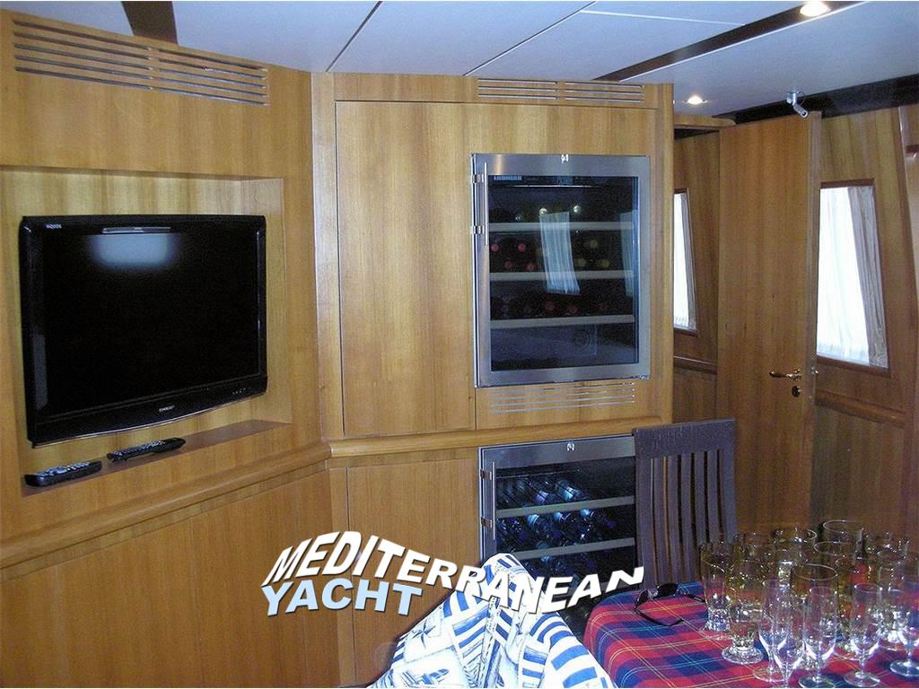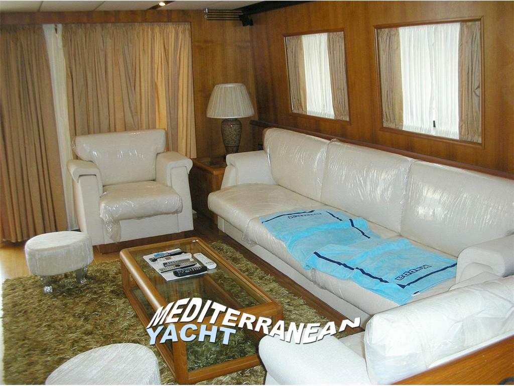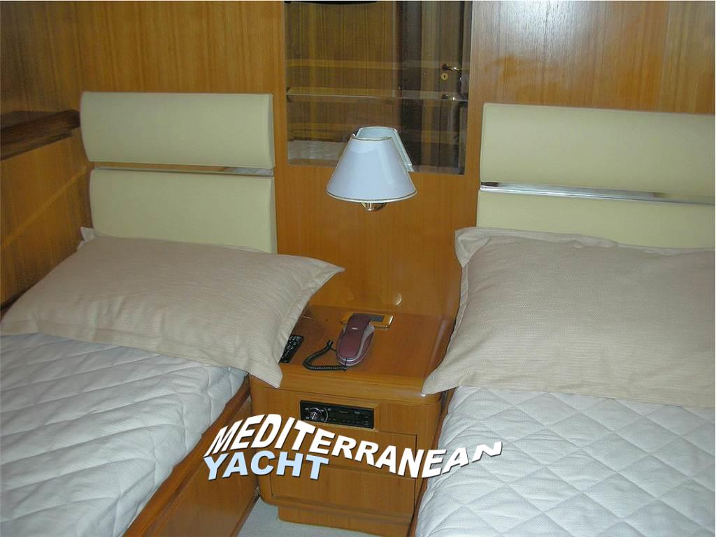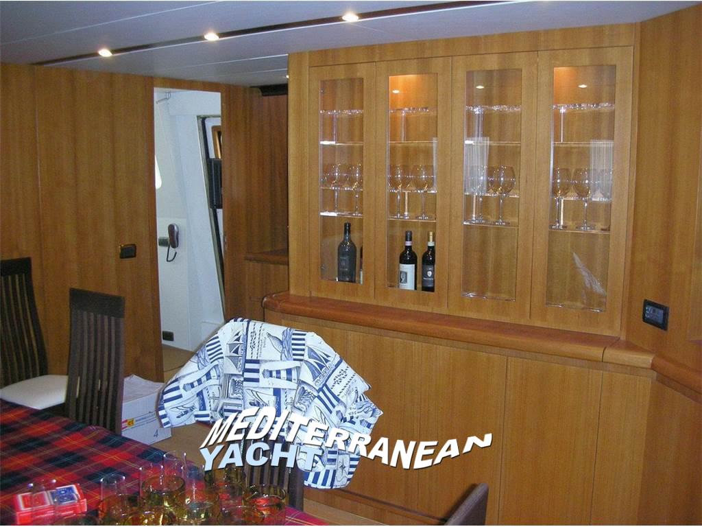 Notas internasInterni: PONTE FLY BRIDGE: - Timoneria, dinette con divano, tavolo e mobile contenitore - Prendisole a poppa e prua. PONTE PRINCIPALE: - Pozzetto con divano, tavolo pranzo e sedie - Salone con divano, tavolino e due poltrone, divano contrapposto - Zona pranzo separata con divano a "L", tavolo, sedie e mobile/vetrina - Disimpegno con scala salita al fly, bagno di servizio, scala discesa al ponte inferiore e porta uscita laterale - Cucina in locale separato con piano cottura in vetroceramica, frigo/freezer Whirpool, forno elettrico Bosch, lavastoviglie Miele,doppio lavello inox, dinette equipaggio e scala discesa alle cabine equipaggio - Interni in teak, divani in pelle, pavimento in parquet. PONTE INFERIORE: - Cabina armatore a tutto baglio con letto matrimoniale, bagno con box doccia e cabina armadio - Due cabine doppie con letti in piano, ognuna con bagno e box doccia - Cabina vip a prua con letto matrimoniale e bagno con box doccia. EQUIPAGGIO: - Una cabina singola con bagno - una cabina doppia con bagno Notas de la instrumentación- Due monitor multifunzione Furuno da 16"- Computer di bordo - Radar - Autopilota Furuno - GPS/plotter - Ecosonda - VHF - Stazione del vento - Due monitor Caterpillar controllo motori - Interfonico interno Notas de armamento- Generatori Kohler, 2X27 Kw- Aria condizionata doppio ciclo - Dissalatore 250 lt/h - Elica di manovra a prua - Elica di manovra a poppa - Comandi elettronici - Stabilizzatori "Zero Speed" Rodriguez - Passerella idraulica a scomparsa Besenzoni - Teder Zodiac 3,85 con idrogetto - Due verricelli salpancora con campane di tonneggio - Verricelli di tonneggio a poppa - Terza stazione di manovra - Impinto acque nere - Impianto TV circuito chiuso con telecamere in sala macchine, pozzetto e passavanti laterali - Antenna TV satellitare SeaTel - TV LCD in salone, zona pranzo e in tutte le cabine - Due cantinette vini refrigerate in zona pranzo - Fabbricatore ghiaccio - Lavasciugatrice Miele |