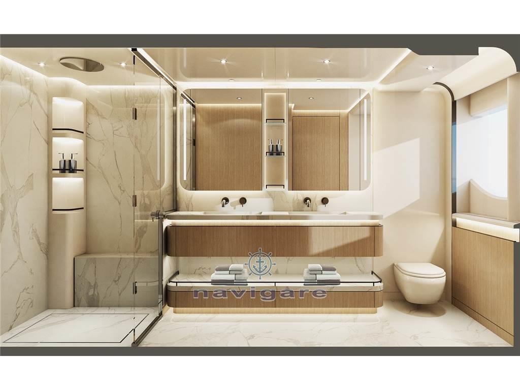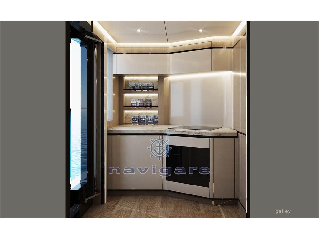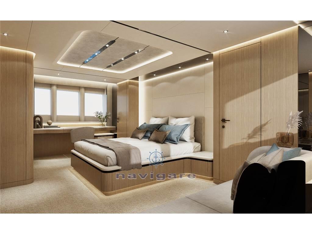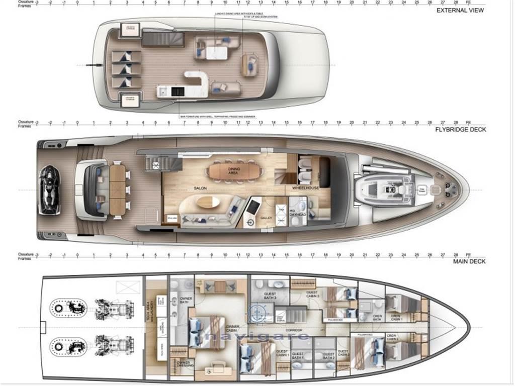 Notas internasNotas de la instrumentaciónAIS (SIMRAD), Allarme fumo/gas, Allarme motore, Allarme sentina, Ancora, Antenna radar, Autoclave, Batterie, Bussola, Caricabatterie, Comando motori elettronico, Computer di bordo, Contamiglia (SIMRAD), Doccia esterna, Ecoscandaglio (SIMRAD), Elica di poppa - stern thruster, Elica di prua - bow thruster, Fari fissi a poppa, Faro orientabile, Flap idraulici, GPS (SIMRAD), Impianto antincendio, Indicatori Flaps, Lavaggio catena, Luci di cortesia, Luci subacquee, Passerella, Pilota automatico, Plotter con antenna GPS (SIMRAD), Porta ingresso, Porta laterale, Radar (SIMRAD), Radio VHF (SIMRAD), Salpa Ancore Idraulico, Winch tonneggio di poppaNotas de armamentoAltoparlanti, Aria condizionata, BBQ/ Grill, Congelatore (Miele), Cucina (Miele), Cuscineria completa, Forno (Miele), Frigorifero interno (Miele), Ghiacciaia (Miele), Impianto TV, Lavastoviglie (Miele), Lavatrice (Miele), Microonde, Piastra elettrica, Prese interne 220v, Radio AM/FM, Stereo, TV, WC marino elettrico, In the fly bridge will be installed:N° 1 Simrad Multifunction display, NSO evo3S, 16”, N° 1 Simrad Tridata, IS42 INSTRUMENT, Engine monitoring panels, Analogue port and starboard engine RPM gauges, Main engines control levers and push buttoms, Search light control panel, Intruder control panel with position indicator, Bow thruster control panel, Horn control. |