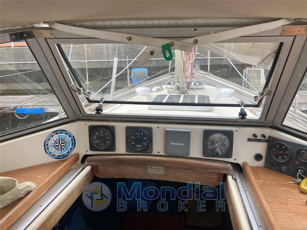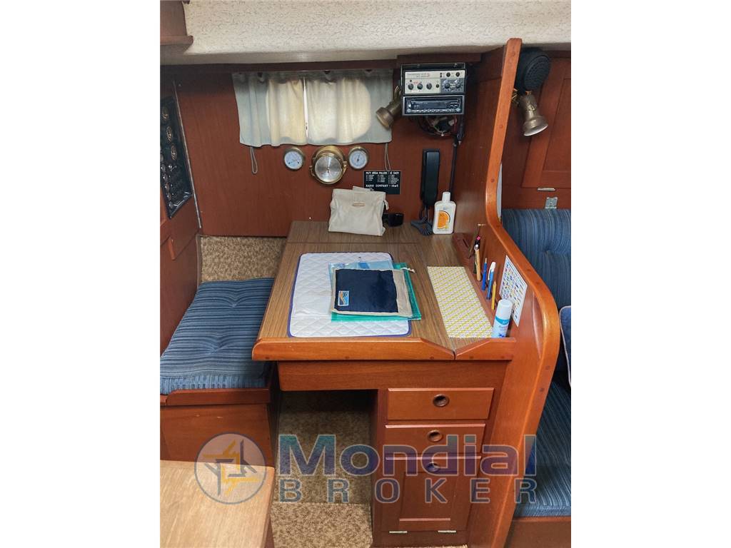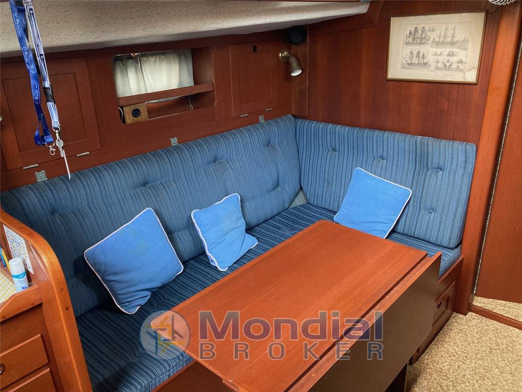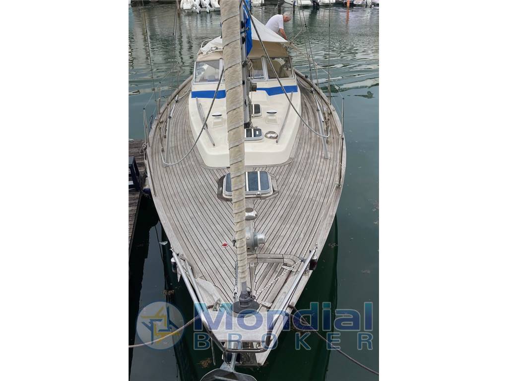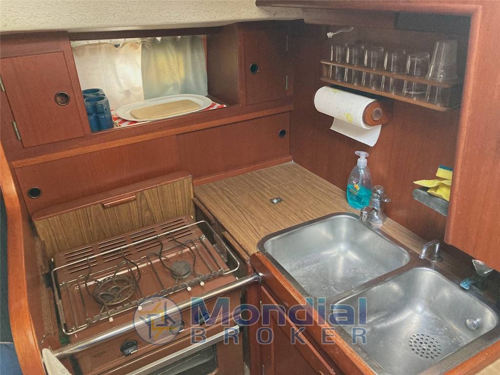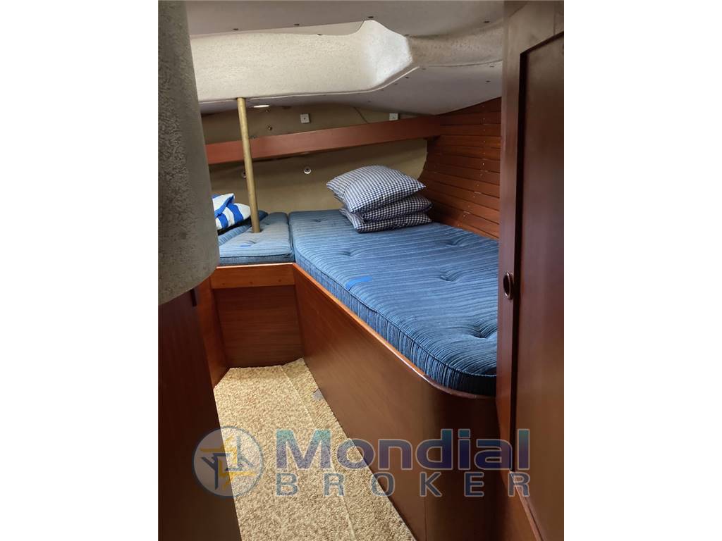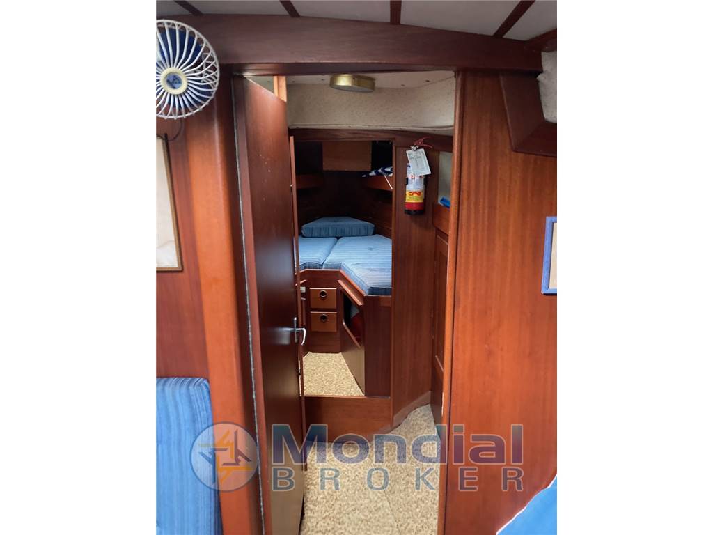 Notas internasCabina di prua con due comode cuccette (lunghezza 2,05m) Nel passaggio verso il salone, due armadietti pensili a dritta e a babordo una cabina toilette con wc marino, lavandino in porcellana, e pavimento realizzato come cabina doccia con griglia in teak su una parete drenante (h 1,85m). In salone divano a L a sinistra e dritto a destra (convertibili in cuccette - lunghezza 2m) e grande tavolo con ali pieghevoli. Cucina a L con piano cottura a 2 fuochi e forno a cardano, frigorifero 80lt, doppio lavello inox con pompa acqua dolce. Tavolo carteggio sul lato opposto con alloggio per carte nautiche, cassetti, quadro elettrico con contatori di tensione, acqua dolce e carburante. Banco di lavoro con armadietti nel passaggio verso la cabina di poppa. Cabina di poppa con due cuccette, con cassetti di stivaggio sotto e armadiature sopra le cuccette.