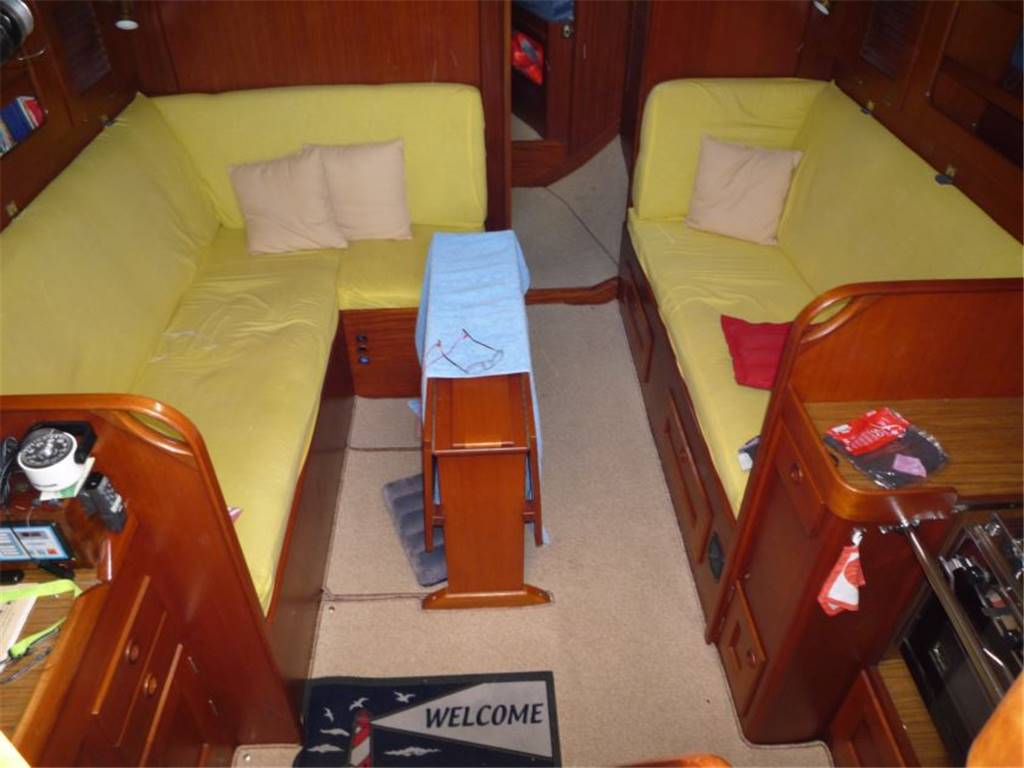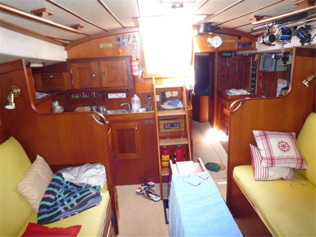 Grande dinette avec canapé'' L'' en tissu bleu avec table en teck et en face de canapé et ouvert avec le dos tourné en couchette double cabine avant avec lit transformable en lit scission et salle de bain privée avec douche avec accès de l'extérieur - à tribord l-dinette dans la cuisine avec réchaud 3 avec cuisine Tecnimpex four et les frais généraux, coffre grand réfrigérateur, évier avec double vasque en inox, pompe à eau de mer x - a quitté la table à cartes avec une instrumentation complète, traceur, radar, VHF et armoire. - Sous les escaliers menant à la salle des machines et dinette cabine invités à l'arrière avec 1 lit double et un lit simple pour accueillir 3 personnes séparées-