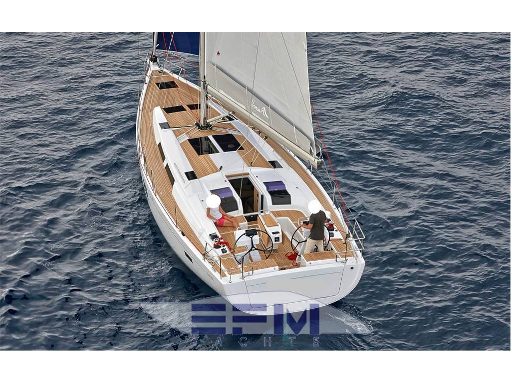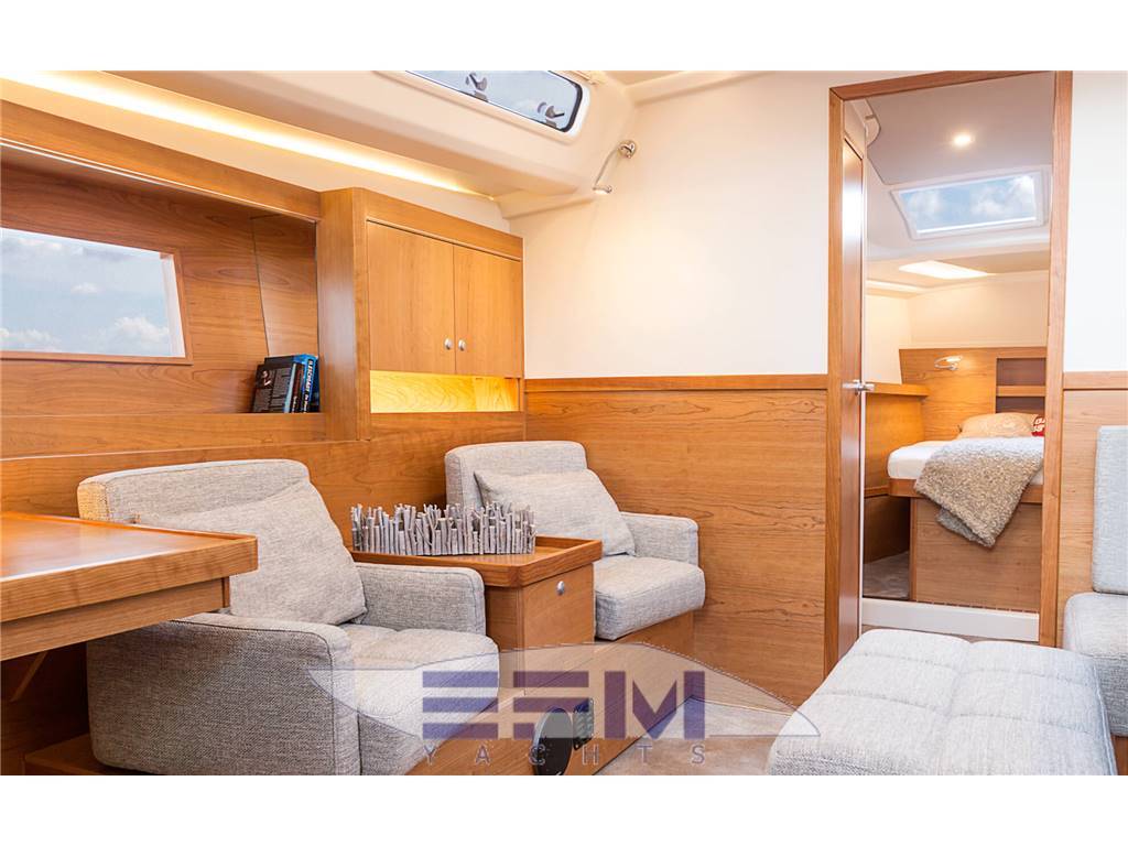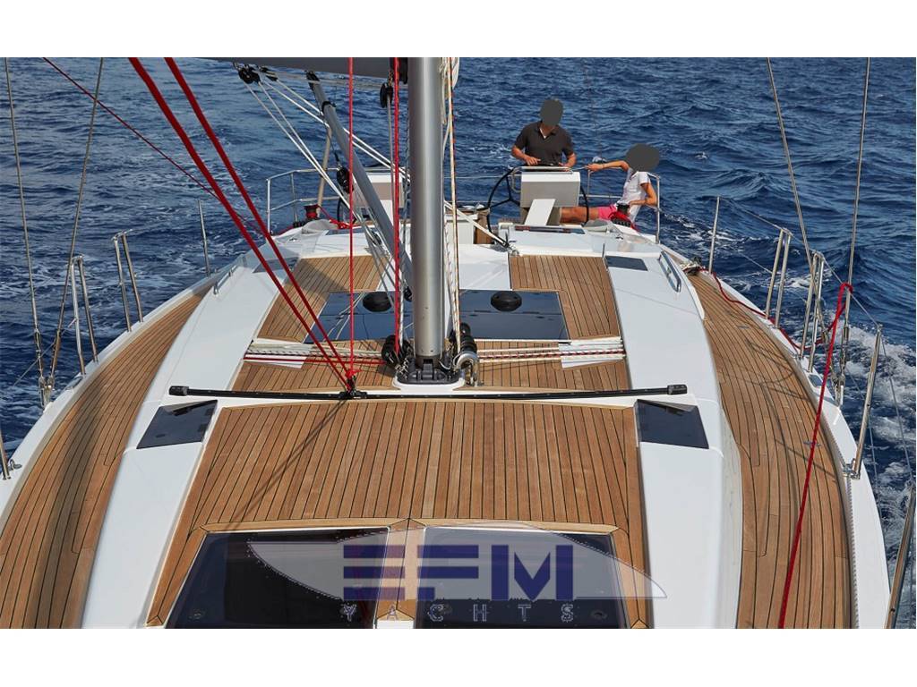 Notas de armamentoDECK & OUTSIDE EQUIPMENT - GRP deck with antislip surface, isophthalic gelcoat, colour: Signal White (RAL 9003), 1st layer vinyl ester resin with balsa sandwich core. 1 cockpit locker on port and stb, stern locker port and stb, stowage for running rigging at helm position, anchor locker at bow. - Teak on cockpit benches - Teak on bathing platform - Twin wheel steering system with emergency tiller - 2 stainless steel steering wheels with leather cover - Cockpit table, stainless steel with folding teak tops - Pulpit and pushpit, stainless steel - Railing, incl. stanchions and stainless steel wire - Covered halyards and control lines lead to cockpit helm position, organizers and jammers, 6 retractable mooring cleats, handrail on coach roof, bow anchor fitting with step - 2 LEWMAR 45 ST EVO manual halyard winches - Bathing platform, manual fold-out with swimming ladder - Life raft storage - Self tacking jib system -Mainsheet system - 7 large and 6 small deck hatches - openable, anchor locker hatch, stowage on coach roof with acrylic glass hatch - 4 deck coach roof windows - 4 openable, acrylic glass next to companionway RIG & SAILS - Rig, anodized aluminium, deck stepped, with kicker, standing and running rigging and 2 reefs - ELVSTRÖM Dacron sails - full battened, main and jib