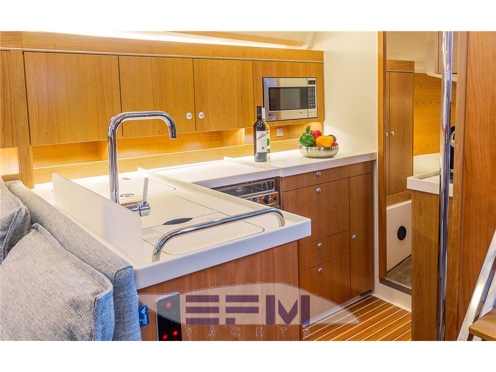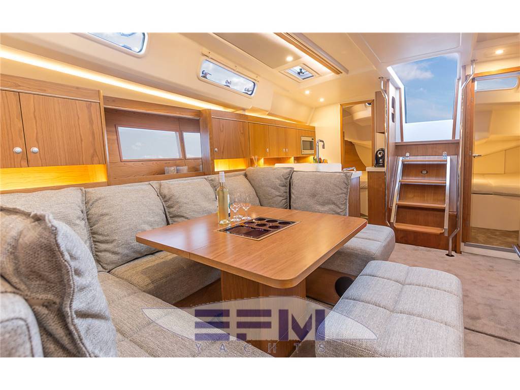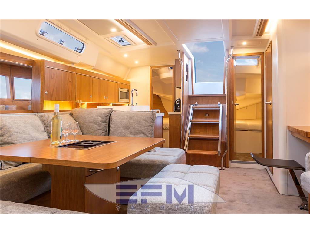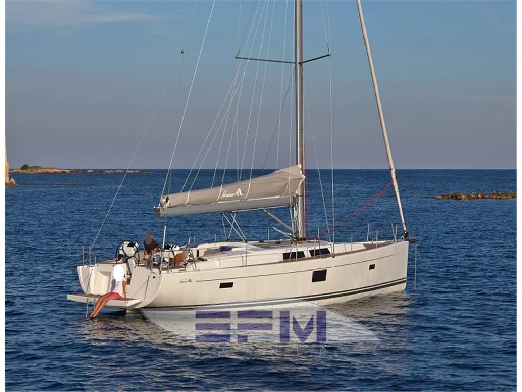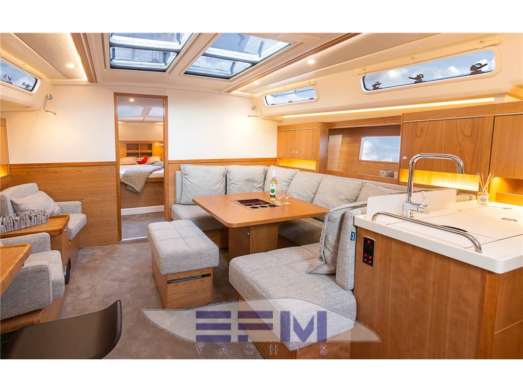 Master cabin with island double berth, storage space and a head with separate shower stall - Saloon with L-galley and dining area on stb, lounge area with chart table and head with separate shower on port - 2 aft cabins with double berth and storage space - 3-burner gas stove with oven, waste bin, 12 V fridge approx. 130 l, double stainless steel sink with mixing tab -Interior furniture in high quality marine plywood, Satin Varnish - Hanse companionway closing system - Saloon table, folding -Worktop in galley - Black Quartz WOOD (FURNITURE, FLOORBOARD) - Furniture - Mahogany Style, Satin Varnish - Floorboard - Acacia UPHOLSTERY, CARPETS & CURTAINS -Mattrasses for all berths - Upholstery - Monte Carlo, colour: Cream