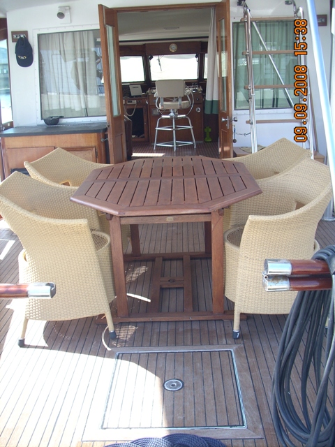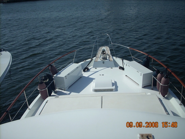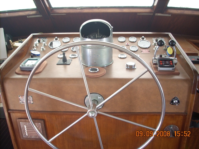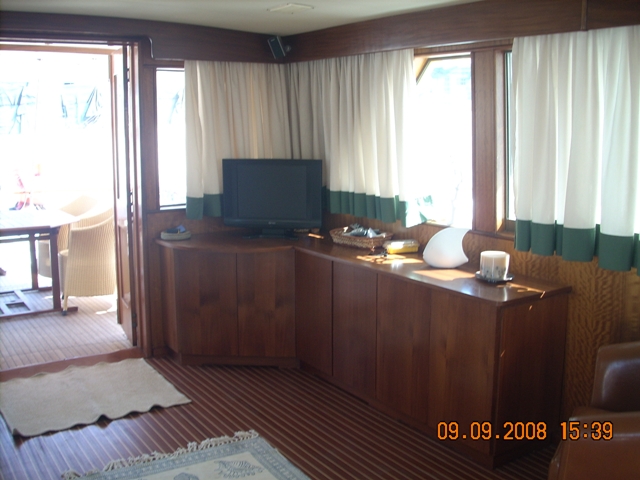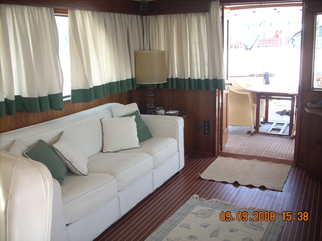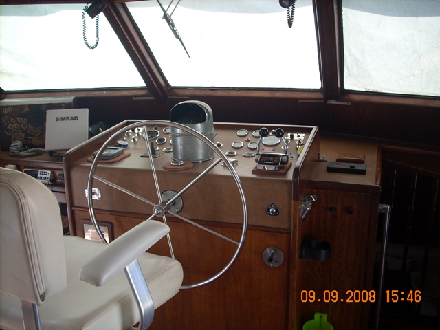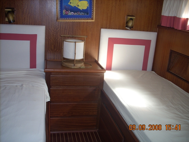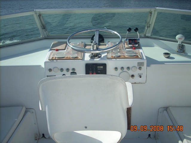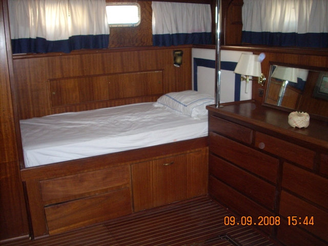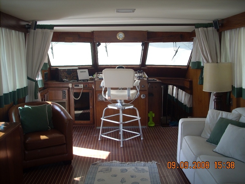 barco en buen estado, con cubierta de teca maciza de cerezo en el interior de satén de América con pisos de madera con incrustaciones de arce (2006) en la revisión de 2002 de los motores a cero el total de horas volver a montar en el año 2006: revisión completa del sistema eléctrico, eliminación de la pintura del casco y el tratamiento sistema occidental, instale la hélice de proa, pasarela hidráulica y aceleradores electrónicos, además de la fibra de vidrio plataforma de popa, el radar y la instalación de televisión vÃa satélite, el reemplazo del generador, la tapicerÃa de renovación interna, mosquitero de cama nueva, nueva estufa y horno, en sustitución de todos los ojos de buey 'refrigerador de acero inoxidable en 2009, en sustitución de la reconstrucción interna de cojines al aire libre y el toldo de la marcha, pulir el casco |