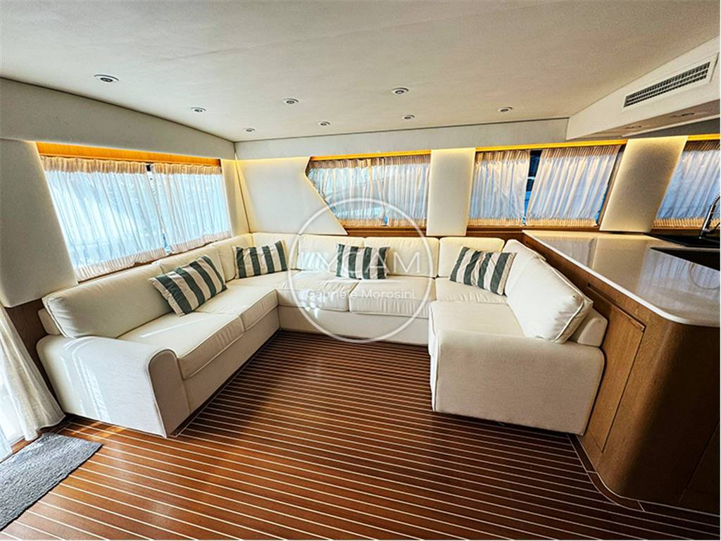 Notas internasAttraverso l’ampia plancetta poppiera si accede al classico pozzetto di grandi dimensioni ed attrezzato per la pesca sportiva. A dritta, una scaletta esterna collega il flybridge totalmente chiuso allestito con timoneria e piccola dinette. Internamente, il ponte di coperta presenta un salone luminosissimo con divano a L a sinistra e mobile bar sul lato opposto. Procedendo verso prua si trovano l’attrezzata cucina a U lungo la murata di sinistra mentre su quella di dritta una classica dinette a C. Sottocoperta la zona notte è composta da 1 cabina VIP a prua, a seguire la cabina armatoriale e verso poppa 2 cabine di cui 1 matrimoniale mentre l’altra con letti a castello