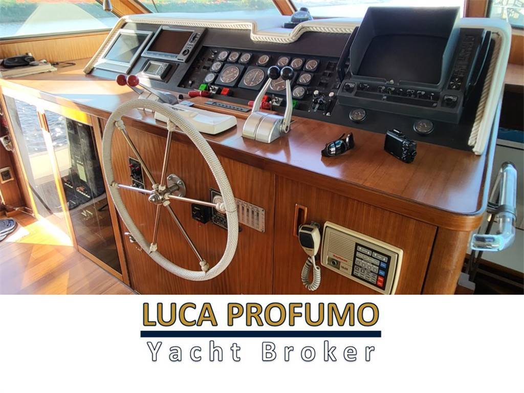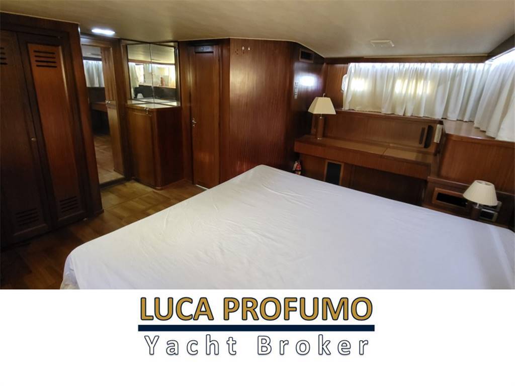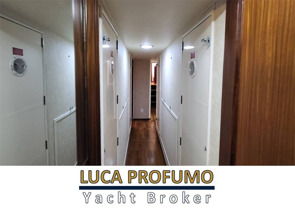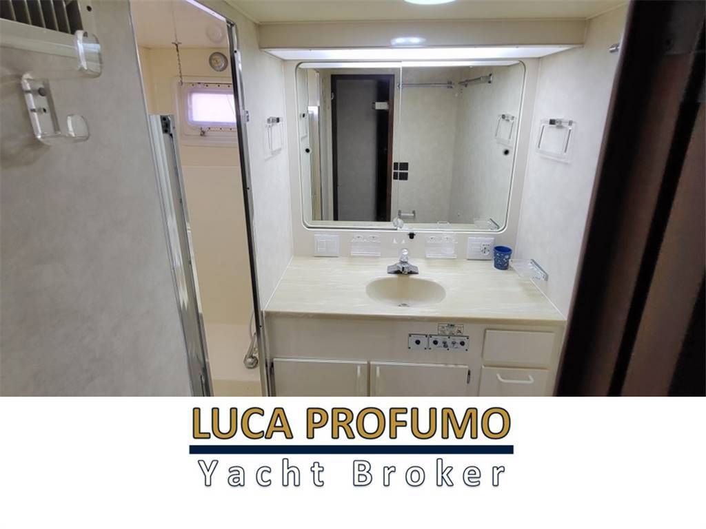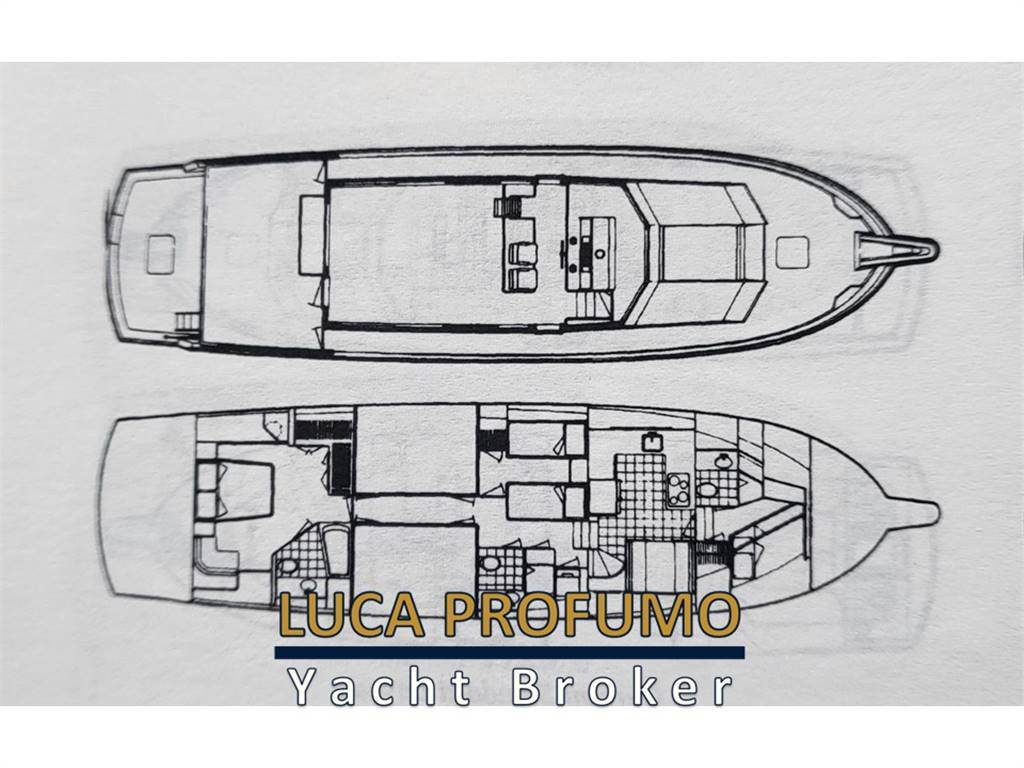 Notas internasCabina armatore a poppa con bagno Cabina ospiti a centro barca con due letti in piano con bagno Cabina a prua con due letti sovrapposti con bagno Cucina e dinette nel lower deck Notas de la instrumentaciónPlotter raymarineRadar Furuno open array Pilota automatico Robertson AP200DL Loudhailer Raymarine RAY410 VHF SEA 156 SSB SEA 322 GPS Furun0 Scandaglio strumentazione Datamarine Notas de armamentoverricello ancora idraulico, due tonneggi elettrici a poppa, passerella idraulica, tendalino pozzetto fisso, Gruetta per tender, hard top con tendalini, Antenna TV SAT, TV a scomparsa nel salone, frigorifero doppio nel salone, Cucina completa di quattro fuochi elettrici, frigorifero, forno elettrico, microonde, cappa aspirante, lavastoviglie, lavasciuga.Climatizzazione, dissalatore, compressore aria, comandi motori pneumatici, pompe spurgo gasolio motori, pompa trasferimento gasolio. |