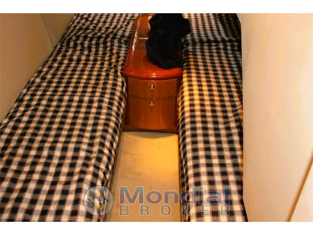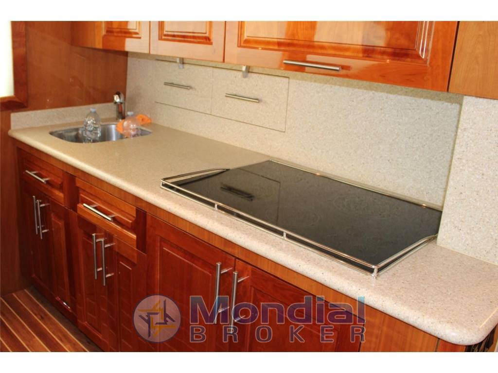 DOTAZIONI DI BORDO: CUCINA: piano cottura in Vetroceramica 4 fuochi - Forno Sharp - Integrati nel mobile cucina due cassettoni frigo e due cassettoni Freezer - Lavastoviglie - ICE Maker - SISTEMI: Aria condizionata con pompa di calore in tutti gli ambienti - Generatore Onan 17.5 kw - Speciali WC Headhunter con scarico a depressione nelle toilettes - Grande TV Sharp in Salone - TV in cabina armatoriale - Caricabatterie Mastervolt - Inverter Mastervolt - 6 batterie Mastervolt - Sistema audio DENON per stereo e TV con altoparlanti interni ed esterni - Impianto acque nere - Lavasciuga -