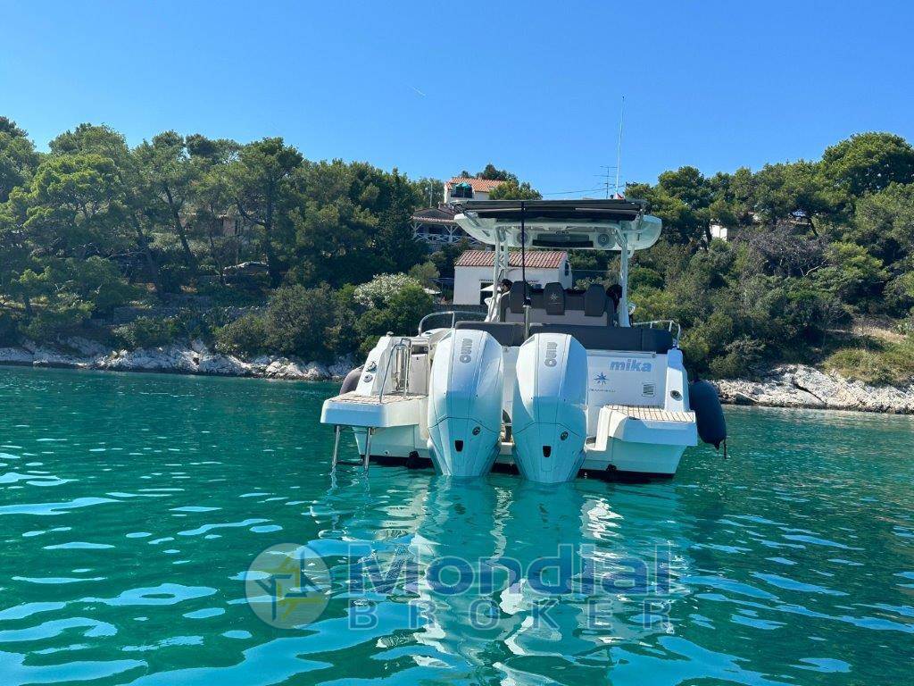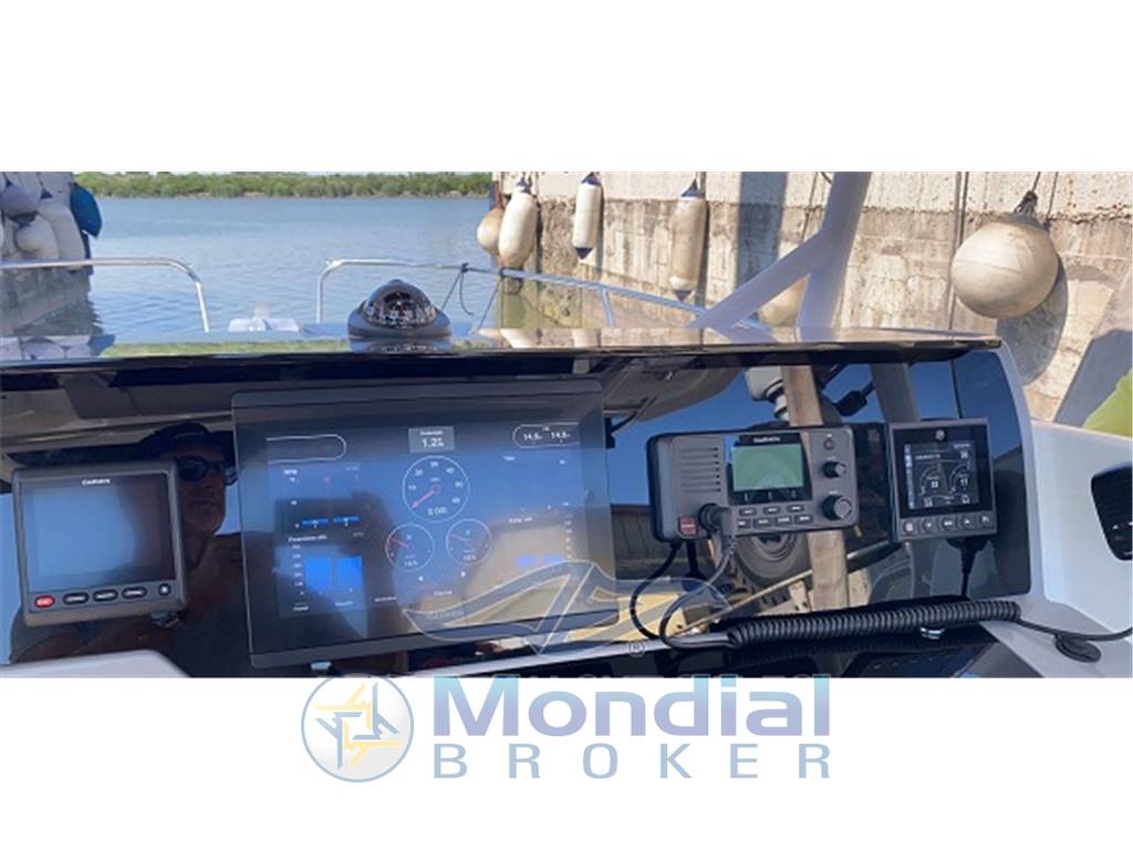 Allestimento • Angolo barra • Comando motori elettronico • Computer di bordo • Ecoscandaglio • GPS • Pilota automatico • Plotter con antenna GPS • Radio VHF • Sedile Copilota • Allarme motore • Allarme sentina • Ancora • Auto-Trim • Batterie • Elica di prua - bow thruster • Faro orientabile • Flap elettrici • Indicatori Flaps • Luci di cortesia • Pompa di sentina automatica • Pompa di sentina elettrica • Pompa di sentina manuale • Porta ingresso • Presa 220V banchina • Salpa Ancore Elettrico • Scaletta da bagno • Tavolo pozzetto • Tromba • T-Top • Impianto acque nere • Prese interne 12v • Prese interne 220v • Serbatoio Acque Nere • WC marino elettrico • Dotazioni di sicurezza entro 12 miglia • Radio AM/FM • Portacanne • Congelatore • Cucina • Fornello • Frigorifero esterno • Copripozzetto • Copriscafo • Cuscineria completa • Cuscineria di poppa • Cuscineria di prua • Teli chiusura T-Top • Teli copri finestra • Telo copriconsolle • Possibilita Subentro Leasing |
