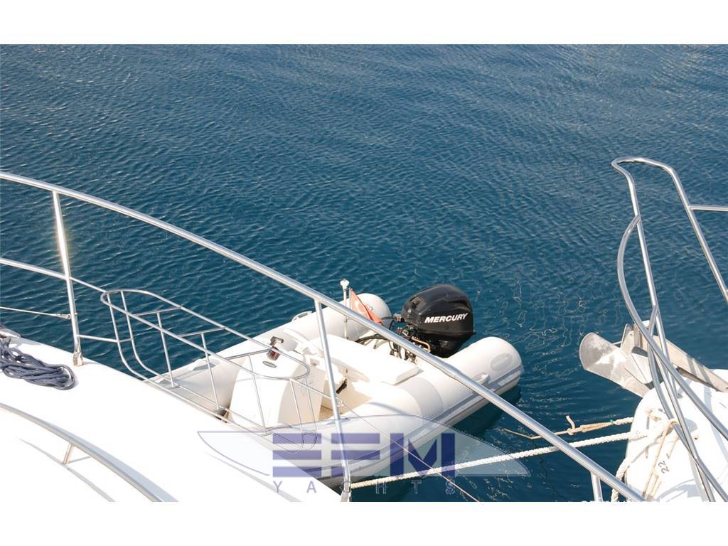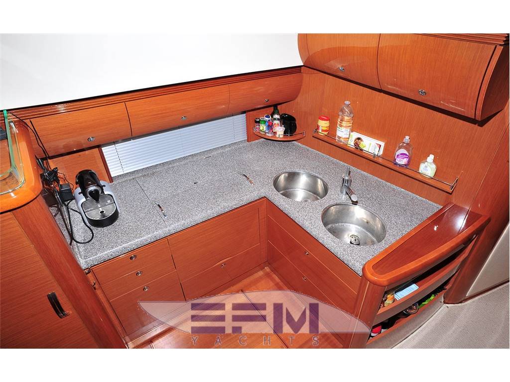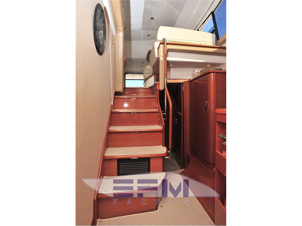 Notas internasLa Vip e la armatore matrimoniali e una doppia a due letti affiancati, sono piuttosto ampie e piacevoli da vivere, nonché dotate di bagno privato. La day toilet è a dritta verso prua, in comune con la cabina ospiti doppia. Colori chiari, molto legno dalle tonalità calde e moquettes crema che si abbinano ai rivestimenti panna dei divani creano ambienti luminosi e allegri. Il salone è articolato su diversi livelli e in zone distinte: salotto, zona pranzo sopraelevata, mobile soggiorno bar e in prua la plancia di comando. INTERNI - una porta scorrevole a tripla sezione divide il pozzetto dal salone. L’ambiente unico presenta una zona salotto con divano a C sulla dritta e tavolo apribile in tre sezioni. Di fronte un divanetto dritto completa la sala; dietro al divano una struttura ospita un TV LCD a scomparsae il mobile all’ingresso ospita un frigo. A proravia, più rialzata, troviamo la zona pranzo, con doppio divano e tavolo,a dritta una piccola zona è dedicata a bar con mobile a L con frigo, lavello e stipetti per stoviglie, più in prua la plancia di comando. Il salone è quasi completamente finestrato con veneziane alle finestre. Scese le scale troviamo la cucina sulla sinistra, un bancone a L ha incassato un lavello doppio e la piastra di cottura, sotto la piastra è sistemato il forno a microonde, diversi sono i cassetti e gli stipetti, nei pensili c’è anche la cappa aspirante. Il frigo è alto e situato verso poppa. La zona del corridoio/cucina beneficia della luce proveniente dal parabrezza superiore e da un passauomo apribile verso prua. Oltre il frigo si trova la cabina armatore, con letto obliquo, armadi alle pareti, mobile toilette con piano a ribalta e televisore a movimentazione elettrica a scomparsa. Il bagno ha mobile lavello in vetroresina con piano in legno e vetro, wc elettrico con panca e box doccia tondo girevole in plexiglas con carabottino a pavimento. Sotto la scala di accesso in zona cucina uno stipo ospita la lavatrice. Verso prua dal corridoio sulla dritta si trova una cabina ospiti a due letti affiancati, armadio e bagno con porta anche sul corridoio. Il bagno ha wc elettrico con panca,mobile lavello in vetroresina con top in legno e vetro, il box doccia è tondo e scorrevole in plexiglas verde. La cabina di prua è costituita da un letto centrale con cassetti sottostanti, due armadietti e due comodini alti con luci letto. Il bagno è situato sulla sinistra; offre un mobile lavello in vetroresina con piano in legno e vetro, wc elettrico con panca e box doccia circolare e girevole con carabottino a pavimento. Notas de la instrumentaciónStrumentazione elettronica Raymarine completa e ripetuta sul fly , indicatore flaps, autopilota ST600, radar, interfaccia PC Raymarine, Vhf ,pacchetto strumenti navigazione, kit ancoraggio, kit ormeggio, TV 20” in ogni cabina, aria condizionata,radio stereo cd , antenna gps, antenna tv, antenna vhf.Posto di pilotaggio Il posto interno è dotato di un divano doppio, il cruscotto è in vetroresina con due piani diversi, quello superiore ha gli strumenti motori incassati, quello basso un cartografico Raymarine E120, il pilota automatico e gli interruttori delle utenze. Le monoleve sono su una struttura a murata insieme ai joystick delle eliche di prua e poppa. Un poggiapiedi in teak è sistemato in giusta posizione. La postazione del fly, sebbene più semplice, è comunque dotata di tutto quello che serve alla navigazione. Un cruscotto in VTR monta un cartografico Raymarine E120, i joystick del bow e stern thruster, il pilota, un tridata, interruttori delle utenze e gli strumenti dei motori. Notas de armamentoDotazioni di serie: monoleve elettroniche, pannello strumenti elettrico, tergicristalli, faro diprofondità, bussola, tromba, disappannamento parabrezza, elica di prua, ventilazione naturale e forzata sala macchine, tagliacime sull’elica, trattamento antiscivolo ponte, pulpito aperto inox, verricello ancora, prendisole poppa, chiusura cruscotto, piattaforma bagno teak, tavolo pozzetto teak, doccetta, presa acqua banchina, prese 12 V e 220 V, lettore CD/DVD/MP3/radio, cassaforte, tavolo salone legno, tende, microonde, scaldaacqua, fornelli a gas, frigo, lavello, frigo e fornello fly, wc elettrici, caricabatteria - |