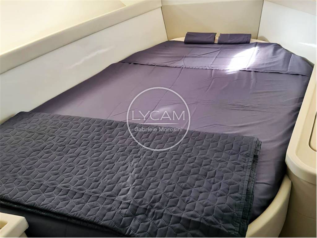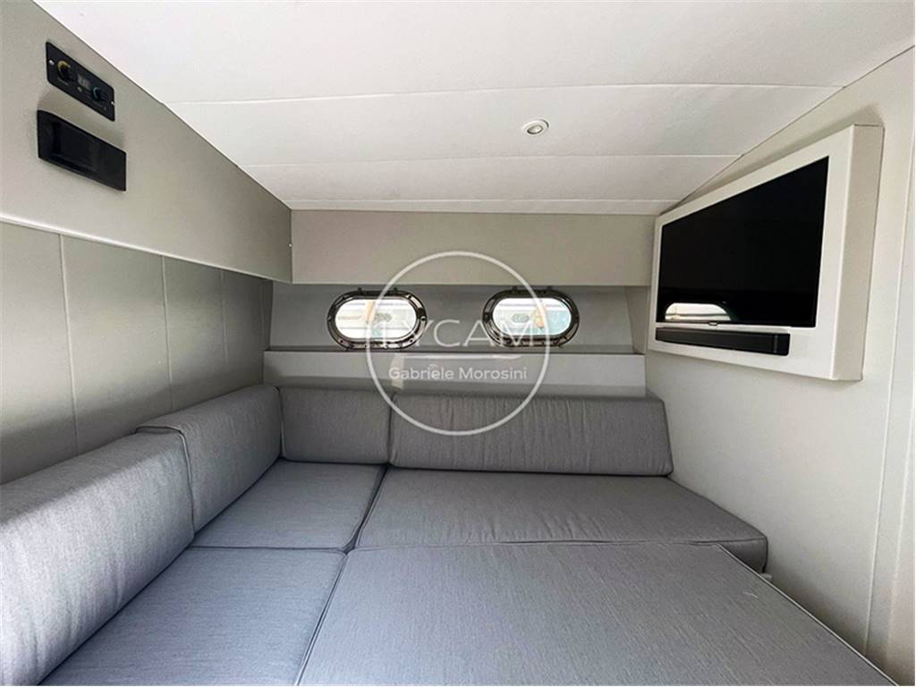 Notas internasIl grande pozzetto è accessibile attraverso una spiaggetta poppiera mobile per l’alaggio e il varo del tender di bordo. Il cockpit si caratterizza per un ampio prendisole poppiero e, proseguendo verso prua, per un divano a L; mentre la timoneria con le sedute di pilota e copilota sono situate a sinistra del tambuccio. Internamente lungo la murata di sinistra trova posto la dinette interna con tavolo a U convertibile in letto mentre la cucina è collocata nella murata opposta. A prua vi è la cabina armatoriale con bagno en-suite