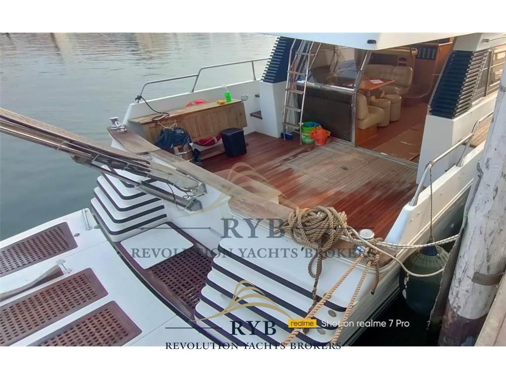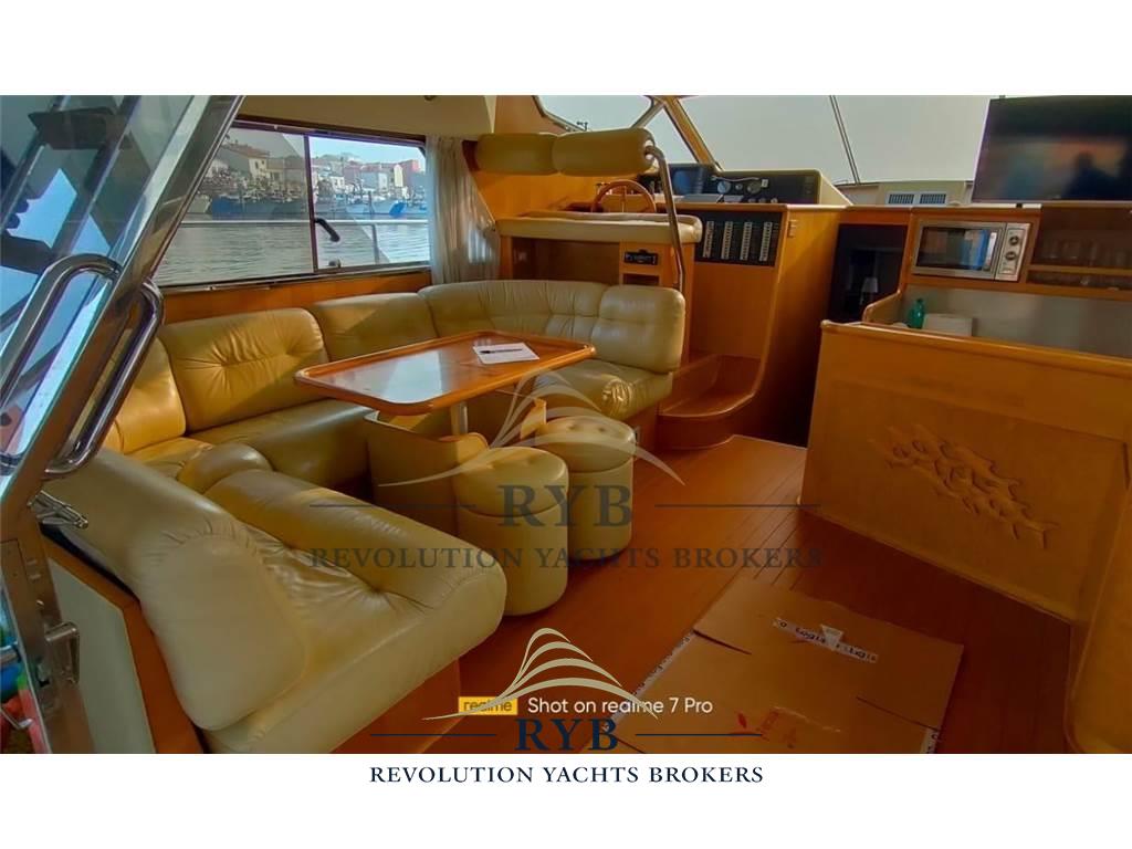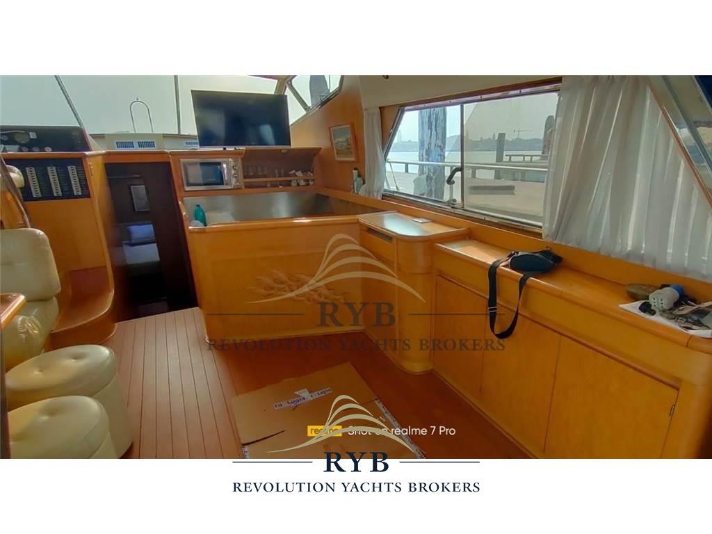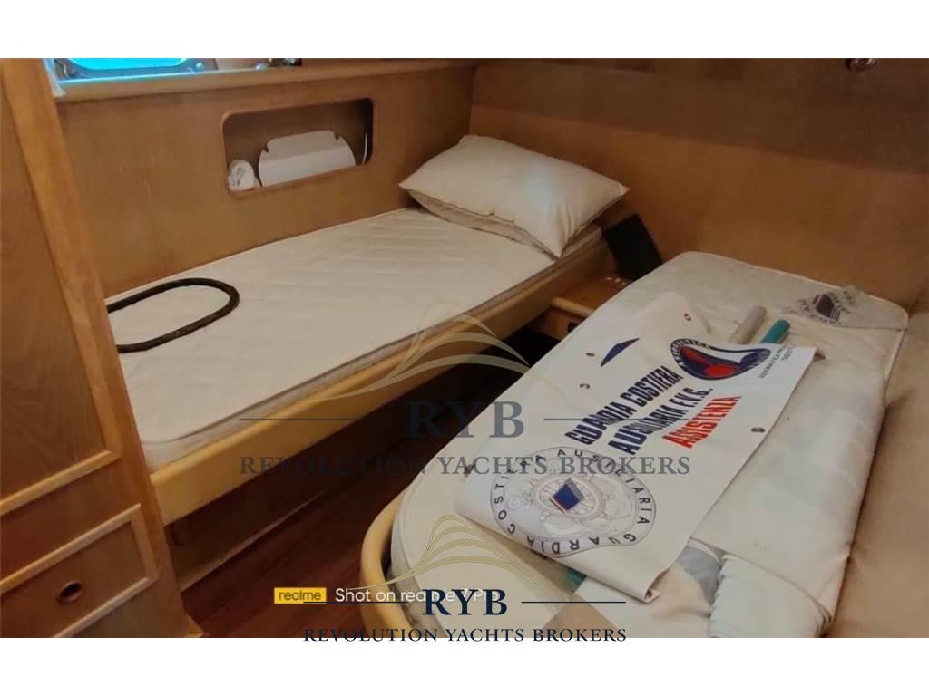 Notas internasNotas de la instrumentaciónAngolo barra, Bussola, Comando motori elettronico, Contamiglia, Ecoscandaglio, GPS, Pilota automatico, Radar, Radio VHF.Notas de armamentoAllestimento tecnico e di coperta:Allarme sentina, Camminamenti laterali in teak, Doccia esterna, Elica di poppa - stern thruster, Elica di prua - bow thruster, Flap idraulici, Lavaggio catena, Lavandino nel Pozzetto, Luci di cortesia, Passerella (idraulica), Piattaforma (tenderlift), Pompa di sentina automatica, Porta ingresso, Pozzetto Teak, Presa 220V banchina, Raddrizzatore, Ripetitore strumentazione, Salpa Ancore Elettrico, Scaletta da bagno, Tavolo pozzetto, Winch tonneggio di poppa. Dotazioni domestiche di bordo: Aria condizionata, BBQ/ Grill, Pavimento interno in legno, Riscaldamento, Serbatoio Acque Nere, WC marino elettrico. Intrattenimento: Altoparlanti (pozzetto), Impianto TV, Radio AM/FM, Stereo, TV. Cucina ed elettrodomestici: Congelatore, Cucina, Fornello, Forno, Frigorifero esterno, Frigorifero interno. Tappezzerie: Cuscineria completa, Cuscineria di poppa, Cuscineria di prua, Cuscineria fly, Cuscineria Pozzetto, Tendalino. |