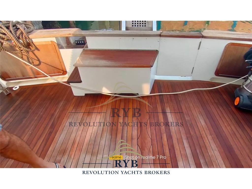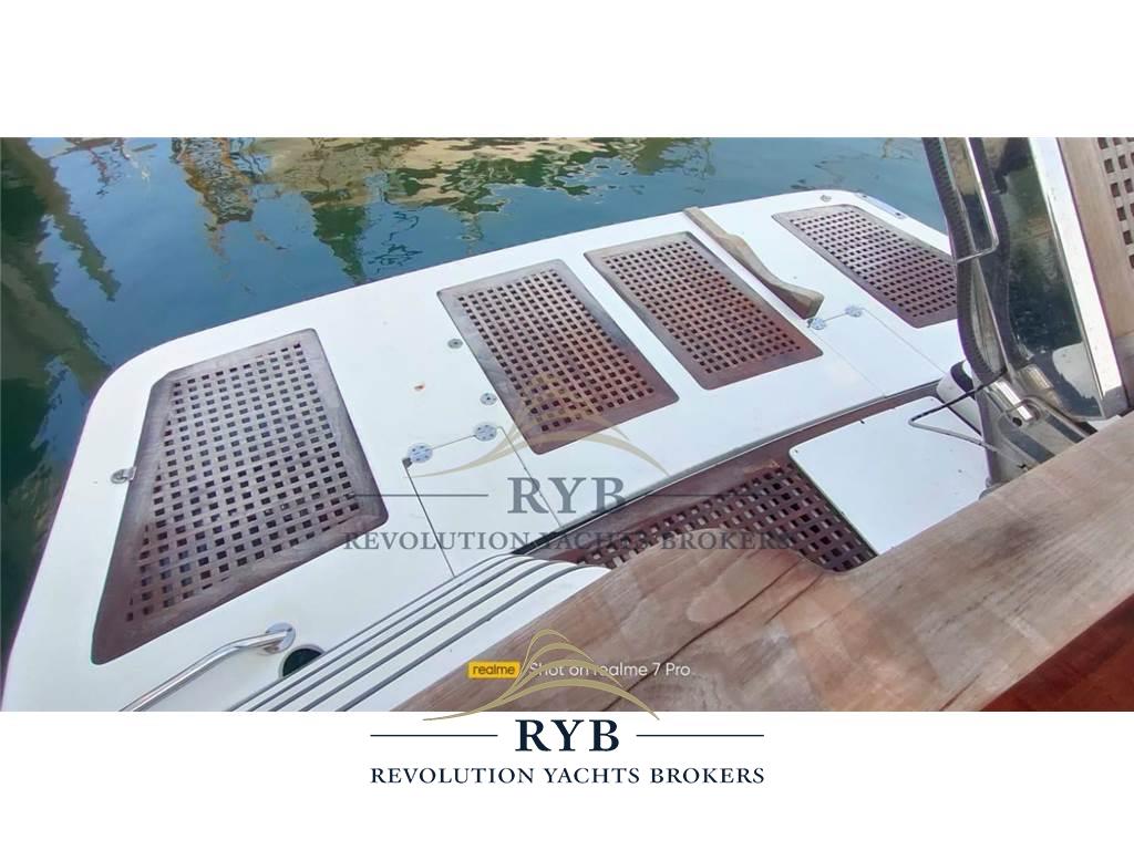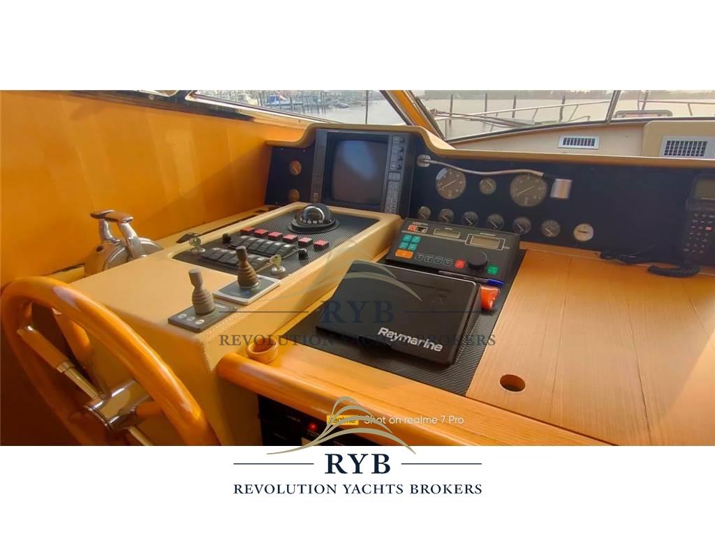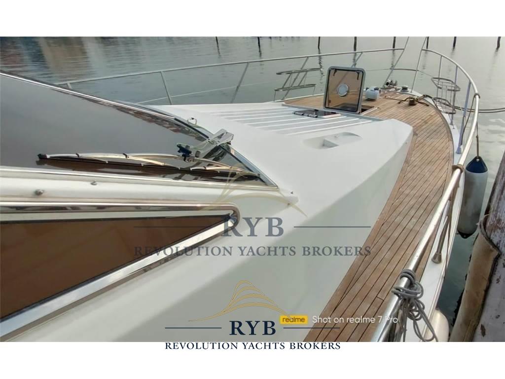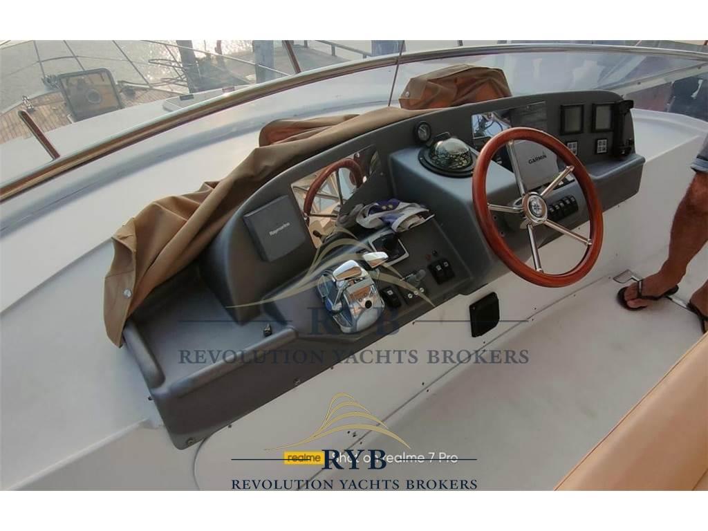 Notas internasNotas de la instrumentaciónAngolo barra, Bussola, Comando motori elettronico, Contamiglia, Ecoscandaglio, GPS, Pilota automatico, Radar, Radio VHF.Notas de armamentoAllestimento tecnico e di coperta:Allarme sentina, Camminamenti laterali in teak, Doccia esterna, Elica di poppa - stern thruster, Elica di prua - bow thruster, Flap idraulici, Lavaggio catena, Lavandino nel Pozzetto, Luci di cortesia, Passerella (idraulica), Piattaforma (tenderlift), Pompa di sentina automatica, Porta ingresso, Pozzetto Teak, Presa 220V banchina, Raddrizzatore, Ripetitore strumentazione, Salpa Ancore Elettrico, Scaletta da bagno, Tavolo pozzetto, Winch tonneggio di poppa. Dotazioni domestiche di bordo: Aria condizionata, BBQ/ Grill, Pavimento interno in legno, Riscaldamento, Serbatoio Acque Nere, WC marino elettrico. Intrattenimento: Altoparlanti (pozzetto), Impianto TV, Radio AM/FM, Stereo, TV. Cucina ed elettrodomestici: Congelatore, Cucina, Fornello, Forno, Frigorifero esterno, Frigorifero interno. Tappezzerie: Cuscineria completa, Cuscineria di poppa, Cuscineria di prua, Cuscineria fly, Cuscineria Pozzetto, Tendalino. |
