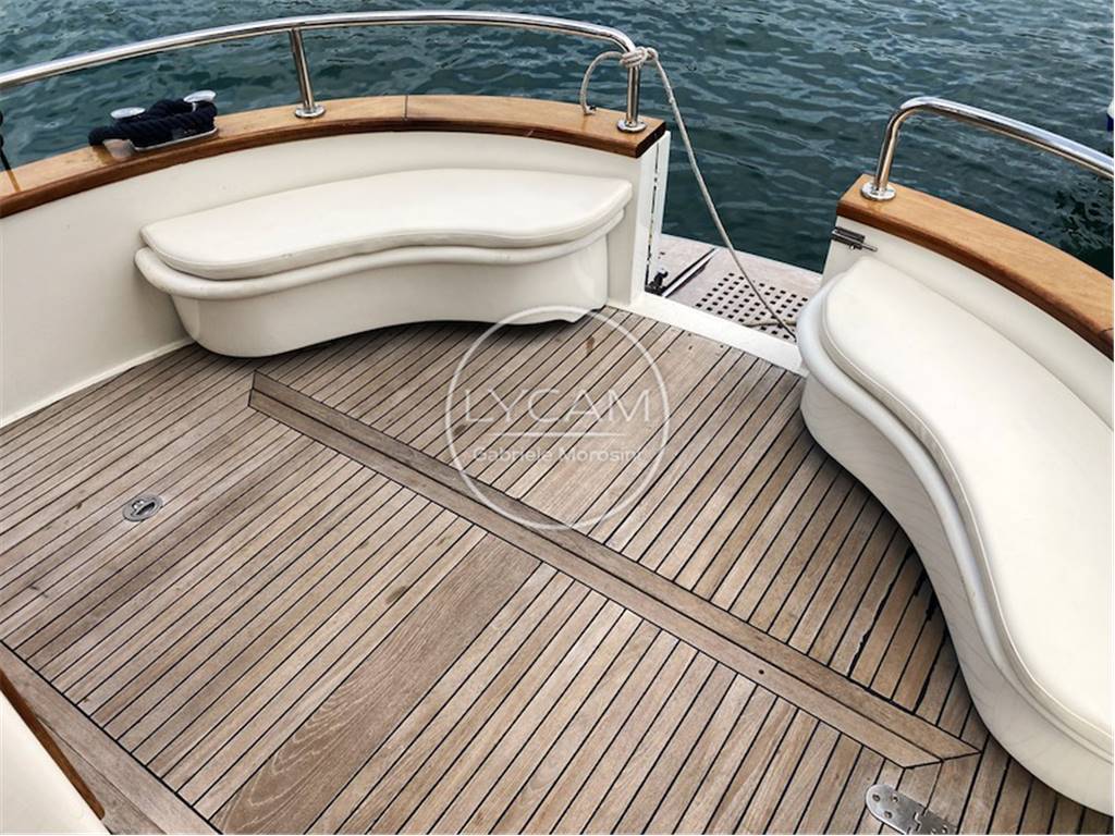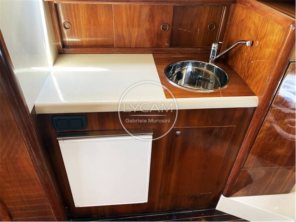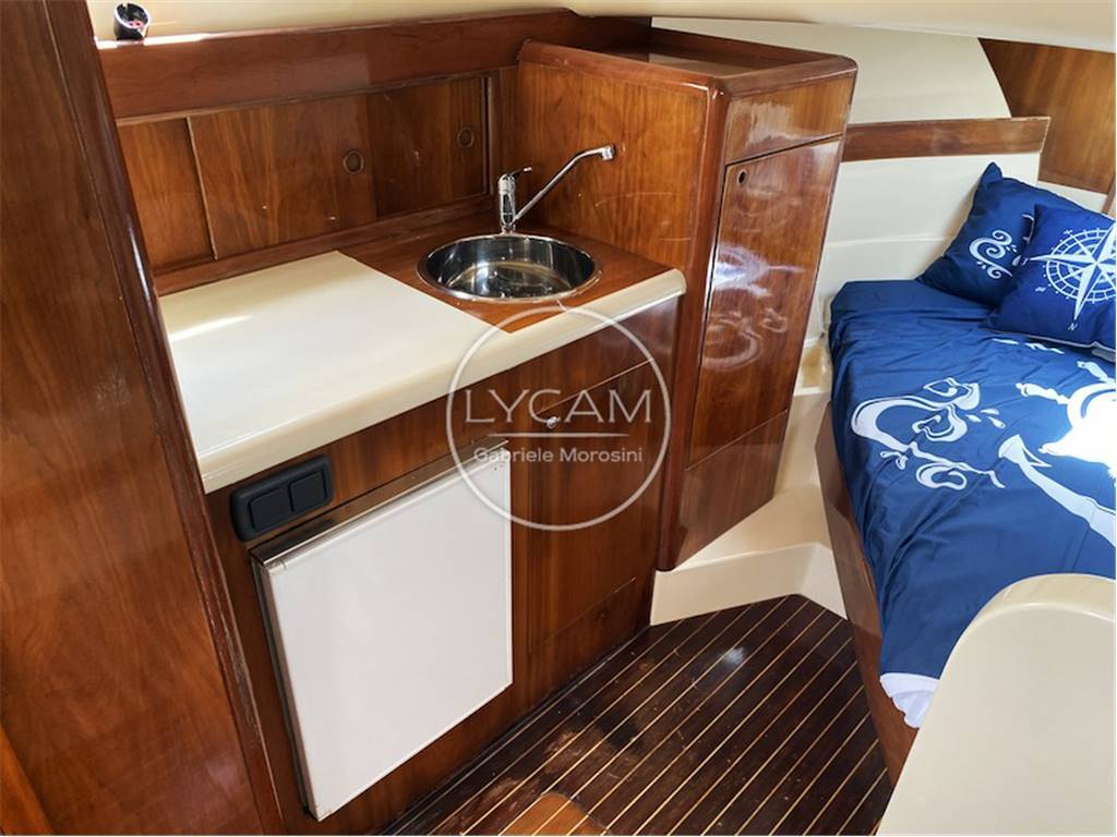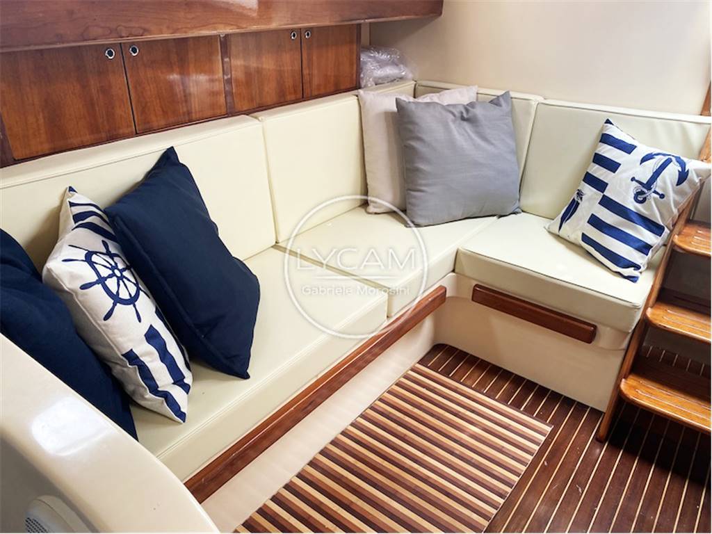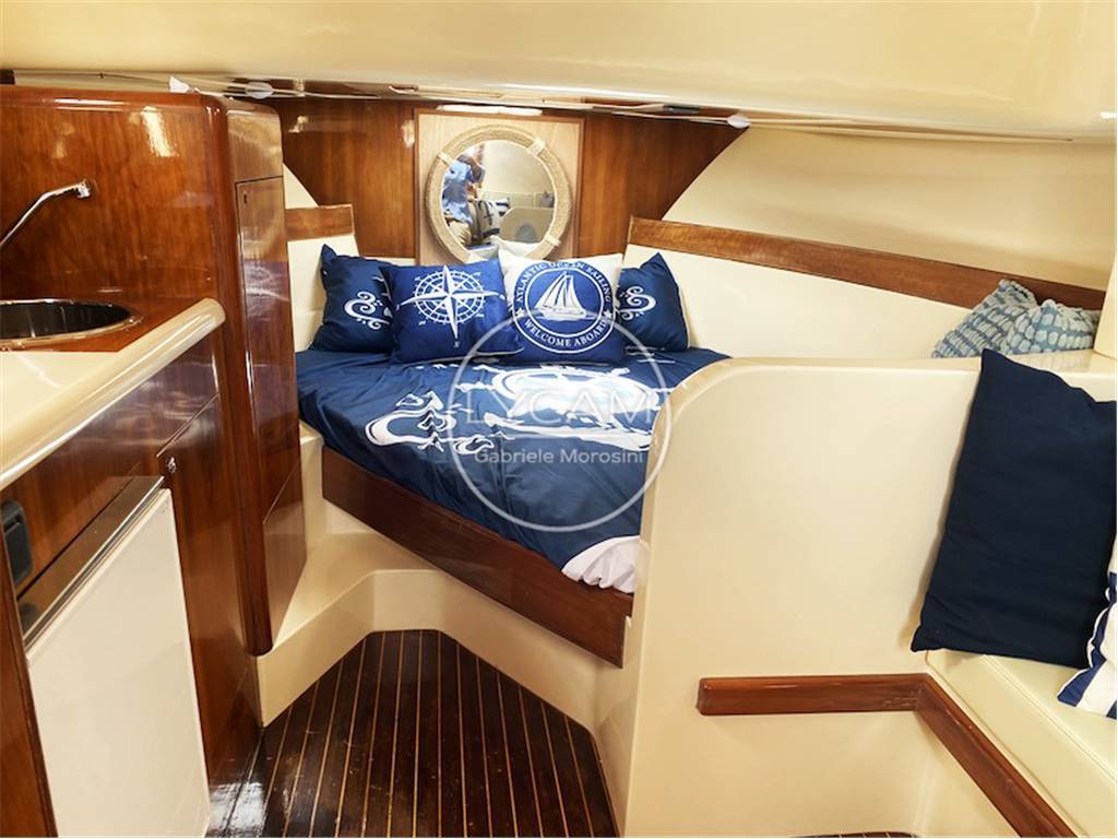 Notas internasAttraverso la comoda plancetta in legno si accede al pozzetto caratterizzato da 2 sedute poste lungo lo specchio poppiero. Procedendo verso prua si trova la plancia di comando sulla dritta e la seduta per il co-pilota su quella di sinistra. La parte prodiera del ponte di coperta è destinato alla zona prendisole. Scendendo sottocoperta dal tambuccio centrale si accede alla dinette con divano L lungo la murata di dritta mentre sul lato opposto vi sono il locale toilette e a seguire il mobile cucina. Proseguendo verso prua si trova il letto armatoriale posto lungo la murata di destra.