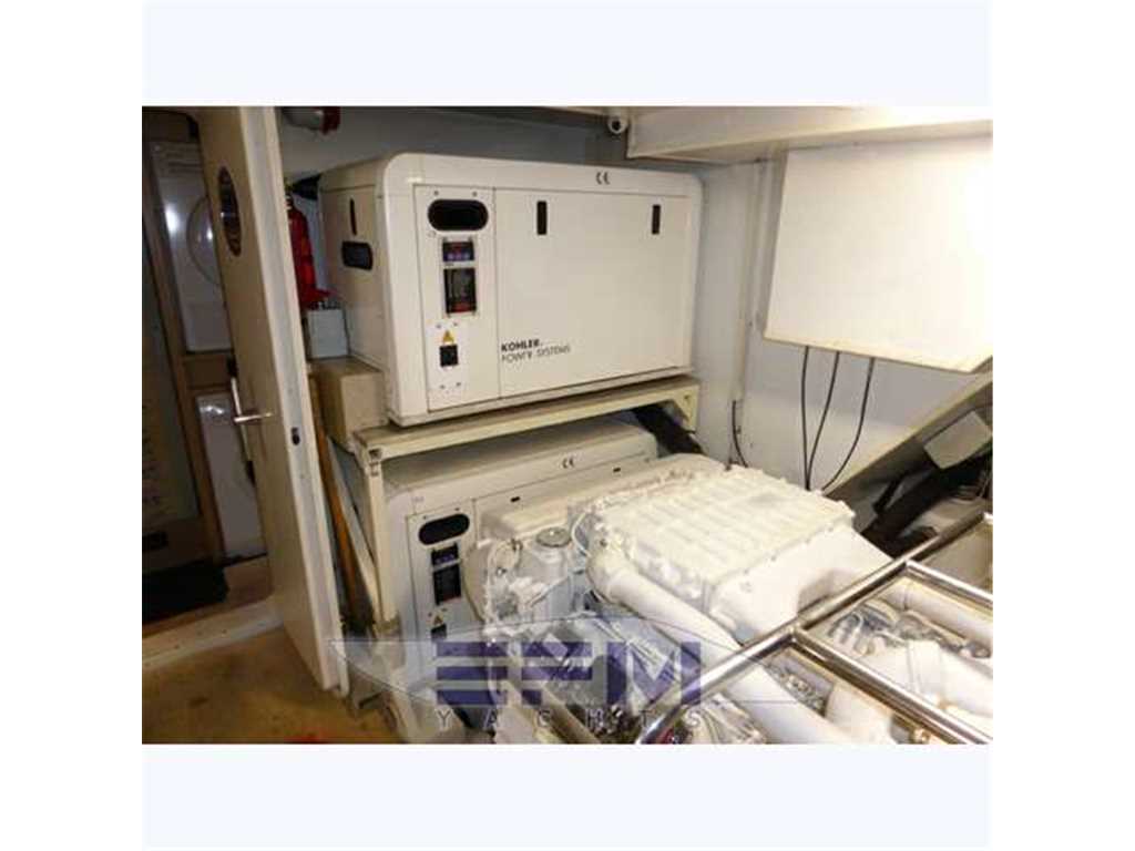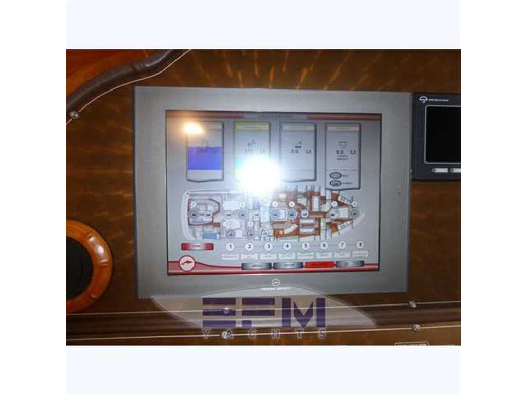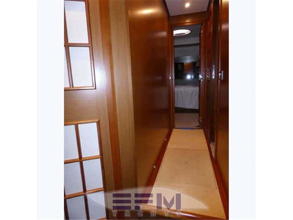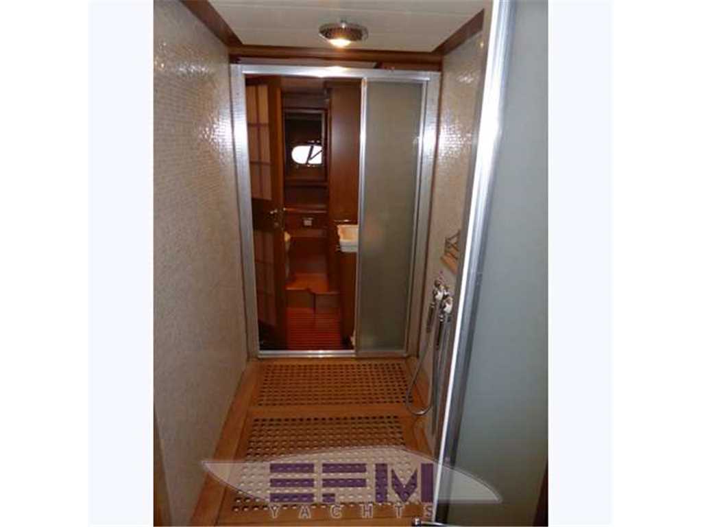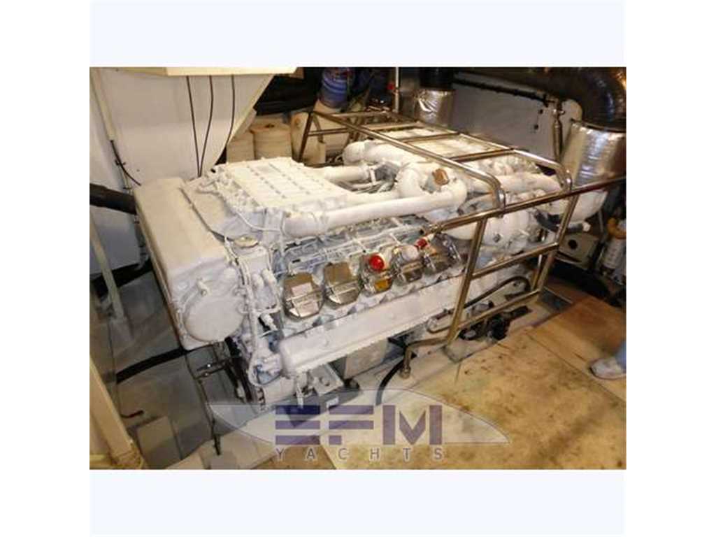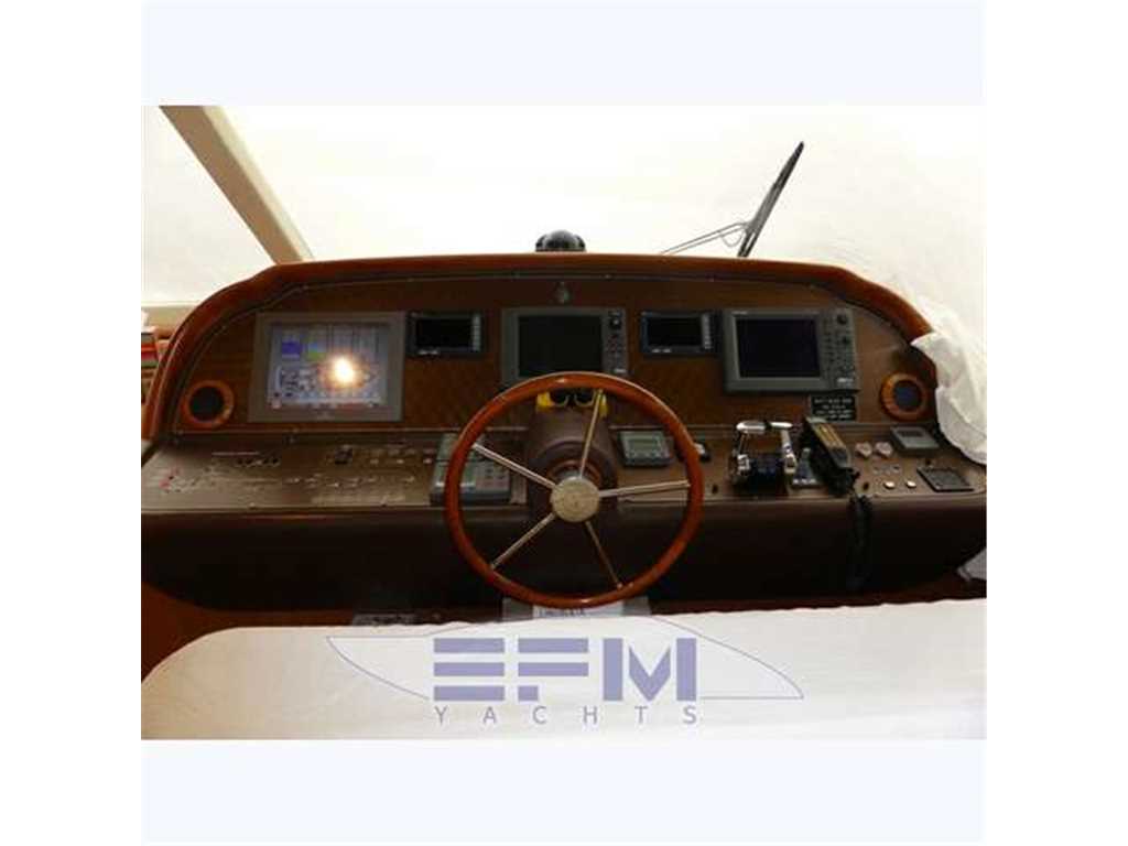 Notas internasMoving up to the cockpit, the decks are teak. There is a teak dining table with fore and aft bench seats with storage beneath that houses two life rafts and cleaning supplies. On the aft port and stbd sides are electric warping winches with foot controls and stainless cleats and chocks. Forward of the dinette to port is an aft deck control station and an upholstered seat. Opposite to stbd is a sink and ice maker with storage cabinet, and teak tread stairs leading up to the flybridge. A sliding door to stbd exposes the stairway to crew quarters with washer and dryer, head and shower and over under bunks, electrical breaker panel, and engine room door. Engine room is also accessed through a deck hatch. There is also a deck hatch giving access to a 3rd crew berth and cabin. Stereo speakers, recessed lighting and throw ring storage are located above cockpit, with an electric retractable sun awning for shade. Moving forward there are teak toe rails and hand rails along the house. Electric doors are located port and stbd. with a black mesh wrap around windshield cover, and electric wipers on the windshield. Stainless stantions and railings surround the deck. The foredeck has a large sunpad and opening hatch. There is a 50 kilo Bruce anchor on a roller, and a Lofrans electric windlass. Two opening anchor lockers house anchor chain, fender storage, manual winch handle, rernote for windlass and wash down spickets. There are opening portholes in the side of the cabin house, and a search light mounted on the top of the brow. Moving up to the Fly bridge, there is a smoked plexiglass wrap around windscreen forward with a cream upholstered dinette just behind. Leafs are removable to create two coffee tables. Just aft is an upholsteres bench seat on front side of helm sation. The helm incoporates an electric pop up dash with nav electronics, and helm seat, and a weblon bimini top with stainless frame above. Bimini will drop and fold forward into a pocket around dinette. Aft of the helm is a winged radar arch with a BBQ grill, sink, and storage cabinet below. A sunpad is located aft to port, and a hatch leading to main deck to stbd. Moving into the main salon, there is a beautiful dining table with brown leather top, and 6 brown leather upholstered chairs to port. A flat screen TV is mounted on the wall and dishware storage cabinets are beneath. Soles are teak and holly with teak cabinetry and bulkheads. Opposite to stbd. is a brown leather upholstered couch with end tables and lamps at each end, as well as two brown leather upholstered arm chairs at each end, and a teak coffee table central. A Bose surround sound system is available for your entertainment pleasures. Forward to port is the fully equipt galley and to stbd is the lower helm station both surrounded by a wrap around windshield providing plenty of natural light to the salon areas. Electric doors for deck access are located port and stbd. Stepping down to the guest areas below, there is a large storage cabinet under the helm to stbd in the staircase. At the landing to port is a guest cabin with a full berth below and pullman above, a hanging locker, and ensuite head. This is a great cabin for kids or a nanny. Soles throughout are teak and holly. Moving down and aft is the beautiful and elegant full beam master cabin with a central queen berth, a mirror and vanity with chair are located on the fwd bulkhead to stbd of the door and to port on the fwd bulkhead is a flatscreen tv with Bose system,. There is a leather upholstered couch to stbd fwd with decorative sconces above, storage cabinets mid stbd, and his head to stbd aft. To port is a large walk in closet fwd, a vanity with chair and cabinets mid, and hers head to port. There is a huge tiled shower and whirlpool tub between the two heads that is accessed from either side. This cabin has large hullside windows located to port and stbd with decorative curtains. Stepping up and fwd, there is a decorative Map on the stbd bulkhead. The main hallway teak and holly sole lifts up to expose a large storage area beneath. To stbd is a guest cabin with twin opposed berths, hanging locker and ensuite head. Moving all the way fwd is the VIP cabin with centerline queen berth, port and stbd upholstered built in chairs, hanging lockers, opening hatch, and ensuite head. Moving up the aft deck ladder to the flybridge, there is am upholstered U shaped dinette forward with twin tables with removable insert, a bimini top above, and windscreen fwd. Just aft is the central helm station with nav electronics and controls, and a bench seat fwd. Aft of the helm is a winged mast with bbq and sink beneath it. A sum pad is located on the aft port side of the flybridge. Deck Equipment: Stainless Railings and Stantions 50 Kilo Stainless Steel Bruce Anchor w/ 3/8 All Chain Rode Double Opening Anchor Lockers Fresh and Salt Water Wash Downs Lofrans Electric Windlass Foredeck Sunpad With Cover Black Mesh Window Covers Docklines and Fenders w/Covers Fender Hangers Life Jackets Flares Ships Bell Foredeck Upholstered Bench Seat Stainless Fore, Mid, and Aft Deck Cleats Opening Hatch Over VIP Teak Decks, Toe Rails, and Hand Rails Navy Blue Awlgripped Hull Electro-Hydraulic Fold Down Transom Teak Beach Tender Garage TENDERJET PROJECT 350 Tender Launch and Retrieve System Aft Deck Teak Dinette w/ Storage Beneath Engine Room Hatch Sliding door to Crew and Engine Room 3rd Crew Hatch (2) 6 Man Liferafts Bose Stereo Speakers Aft Deck Icemaker and Sink Aft Deck Control Station w/ Thruster, Eng Starts, and Raymarine Tri Data Pop Up Salon Aft Window Bimini Top Electro-Hydraulic Cockpit Awning Besenzoni Electro-Hydrauilc Paserelle Electro-Hydraulic Swim Ladder Electric Warping Winches w/Foot Controls Hand Held Fire Extinguishers Teak Tread Ladder To Fly Fold Down Cockpit Gates Port and Stbd Molded Stairs In Transom (Port) Teak Stairs at Transom (Stbd) Overhead Life Ring Storage Smoked Plexi Windscreen Flybridge 220v BBQ Grill F