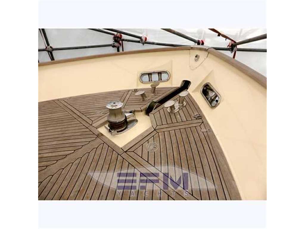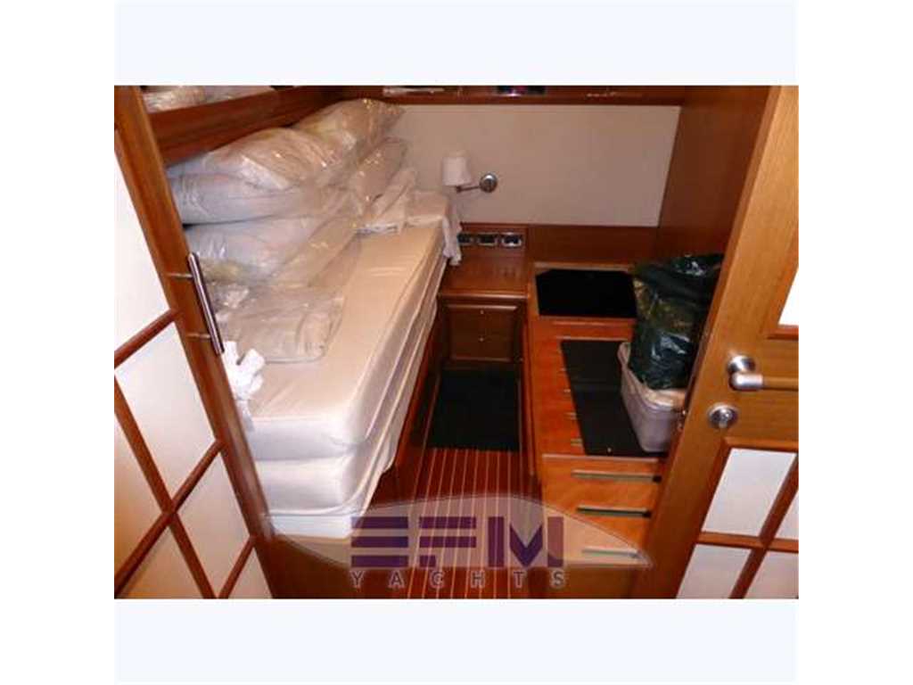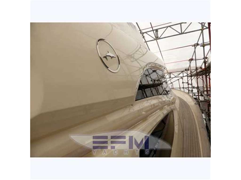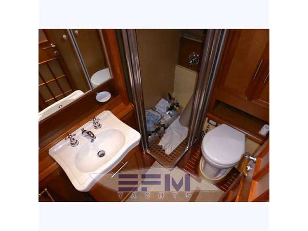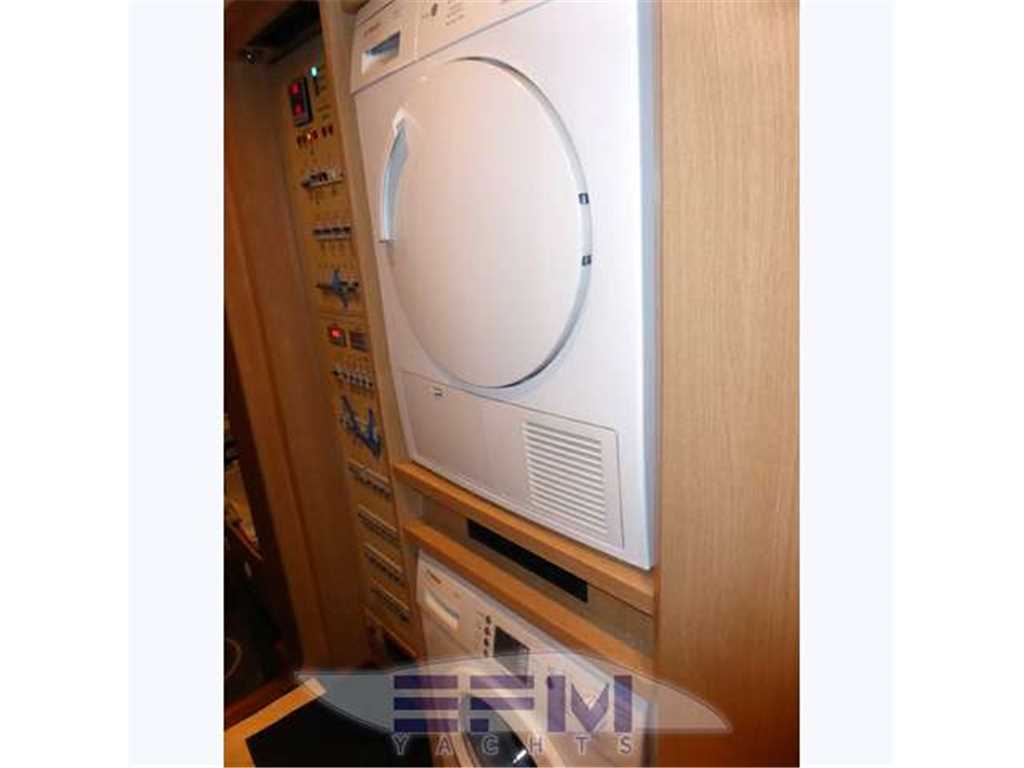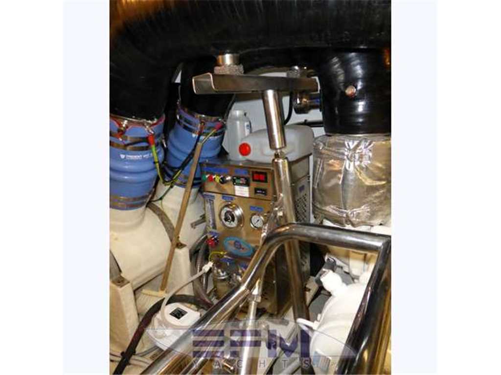Notas internasMoving up to the cockpit, the decks are teak. There is a teak dining table with fore and aft bench seats with storage beneath that houses two life rafts and cleaning supplies. On the aft port and stbd sides are electric warping winches with foot controls and stainless cleats and chocks. Forward of the dinette to port is an aft deck control station and an upholstered seat. Opposite to stbd is a sink and ice maker with storage cabinet, and teak tread stairs leading up to the flybridge. A sliding door to stbd exposes the stairway to crew quarters with washer and dryer, head and shower and over under bunks, electrical breaker panel, and engine room door. Engine room is also accessed through a deck hatch. There is also a deck hatch giving access to a 3rd crew berth and cabin. Stereo speakers, recessed lighting and throw ring storage are located above cockpit, with an electric retractable sun awning for shade. Moving forward there are teak toe rails and hand rails along the house. Electric doors are located port and stbd. with a black mesh wrap around windshield cover, and electric wipers on the windshield. Stainless stantions and railings surround the deck. The foredeck has a large sunpad and opening hatch. There is a 50 kilo Bruce anchor on a roller, and a Lofrans electric windlass. Two opening anchor lockers house anchor chain, fender storage, manual winch handle, rernote for windlass and wash down spickets. There are opening portholes in the side of the cabin house, and a search light mounted on the top of the brow. Moving up to the Fly bridge, there is a smoked plexiglass wrap around windscreen forward with a cream upholstered dinette just behind. Leafs are removable to create two coffee tables. Just aft is an upholsteres bench seat on front side of helm sation. The helm incoporates an electric pop up dash with nav electronics, and helm seat, and a weblon bimini top with stainless frame above. Bimini will drop and fold forward into a pocket around dinette. Aft of the helm is a winged radar arch with a BBQ grill, sink, and storage cabinet below. A sunpad is located aft to port, and a hatch leading to main deck to stbd. Moving into the main salon, there is a beautiful dining table with brown leather top, and 6 brown leather upholstered chairs to port. A flat screen TV is mounted on the wall and dishware storage cabinets are beneath. Soles are teak and holly with teak cabinetry and bulkheads. Opposite to stbd. is a brown leather upholstered couch with end tables and lamps at each end, as well as two brown leather upholstered arm chairs at each end, and a teak coffee table central. A Bose surround sound system is available for your entertainment pleasures. Forward to port is the fully equipt galley and to stbd is the lower helm station both surrounded by a wrap around windshield providing plenty of natural light to the salon areas. Electric doors for deck access are located port and stbd. Stepping down to the guest areas below, there is a large storage cabinet under the helm to stbd in the staircase. At the landing to port is a guest cabin with a full berth below and pullman above, a hanging locker, and ensuite head. This is a great cabin for kids or a nanny. Soles throughout are teak and holly. Moving down and aft is the beautiful and elegant full beam master cabin with a central queen berth, a mirror and vanity with chair are located on the fwd bulkhead to stbd of the door and to port on the fwd bulkhead is a flatscreen tv with Bose system,. There is a leather upholstered couch to stbd fwd with decorative sconces above, storage cabinets mid stbd, and his head to stbd aft. To port is a large walk in closet fwd, a vanity with chair and cabinets mid, and hers head to port. There is a huge tiled shower and whirlpool tub between the two heads that is accessed from either side. This cabin has large hullside windows located to port and stbd with decorative curtains. Stepping up and fwd, there is a decorative Map on the stbd bulkhead. The main hallway teak and holly sole lifts up to expose a large storage area beneath. To stbd is a guest cabin with twin opposed berths, hanging locker and ensuite head. Moving all the way fwd is the VIP cabin with centerline queen berth, port and stbd upholstered built in chairs, hanging lockers, opening hatch, and ensuite head. Moving up the aft deck ladder to the flybridge, there is am upholstered U shaped dinette forward with twin tables with removable insert, a bimini top above, and windscreen fwd. Just aft is the central helm station with nav electronics and controls, and a bench seat fwd. Aft of the helm is a winged mast with bbq and sink beneath it. A sum pad is located on the aft port side of the flybridge. Deck Equipment: Stainless Railings and Stantions 50 Kilo Stainless Steel Bruce Anchor w/ 3/8 All Chain Rode Double Opening Anchor Lockers Fresh and Salt Water Wash Downs Lofrans Electric Windlass Foredeck Sunpad With Cover Black Mesh Window Covers Docklines and Fenders w/Covers Fender Hangers Life Jackets Flares Ships Bell Foredeck Upholstered Bench Seat Stainless Fore, Mid, and Aft Deck Cleats Opening Hatch Over VIP Teak Decks, Toe Rails, and Hand Rails Navy Blue Awlgripped Hull Electro-Hydraulic Fold Down Transom Teak Beach Tender Garage TENDERJET PROJECT 350 Tender Launch and Retrieve System Aft Deck Teak Dinette w/ Storage Beneath Engine Room Hatch Sliding door to Crew and Engine Room 3rd Crew Hatch (2) 6 Man Liferafts Bose Stereo Speakers Aft Deck Icemaker and Sink Aft Deck Control Station w/ Thruster, Eng Starts, and Raymarine Tri Data Pop Up Salon Aft Window Bimini Top Electro-Hydraulic Cockpit Awning Besenzoni Electro-Hydrauilc Paserelle Electro-Hydraulic Swim Ladder Electric Warping Winches w/Foot Controls Hand Held Fire Extinguishers Teak Tread Ladder To Fly Fold Down Cockpit Gates Port and Stbd Molded Stairs In Transom (Port) Teak Stairs at Transom (Stbd) Overhead Life Ring Storage Smoked Plexi Windscreen Flybridge 220v BBQ Grill F
