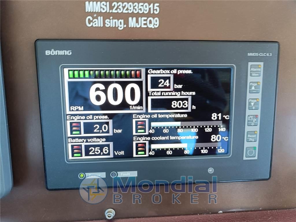 Notas de la instrumentaciónAIS, 2 Allarme motore, Allarme sentina, Ancora (Chain new, 2021), Angolo barra, Antenna radar, Autoclave, Autogonfiabile, Batterie, Bussola, Caricabatterie, Colorazione speciale (bordeaux), Comando motori elettronico, Computer di bordo (Man), Contamiglia (Furuno Navnet), Display, Doccia esterna, Ecoscandaglio (Furuno Kw, 2 - 2021), Elica di poppa - stern thruster, Elica di prua - bow thruster, Fari fissi a poppa, 2 Flap idraulici, Garage per tender (with winch and remote control), GPS (Furuno), Hard top (electrically opening), Impianto antincendio, Joystick (for stern and bow thrusters), Lavaggio catena, Lavandino nel Pozzetto, Luci di cortesia, Luci subacquee, Passerella (Besenzoni, hydraulic), Piattaforma, Pilota automatico (Raymarine), Plotter (Furuno Navnet), 5 Pompa di sentina automatica, Pompa di sentina manuale, Porta ingresso, Pozzetto Teak, Presa 220V banchina, Radar (Furuno), Raddrizzatore, Radio VHF (Icom), Salpa Ancore Elettrico, Scaletta da bagno, Sedile Copilota, Tender (2023, Highfield + Yamaha 4Hp, 4T), Tromba, Winch tonneggio di prua