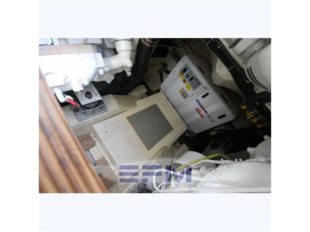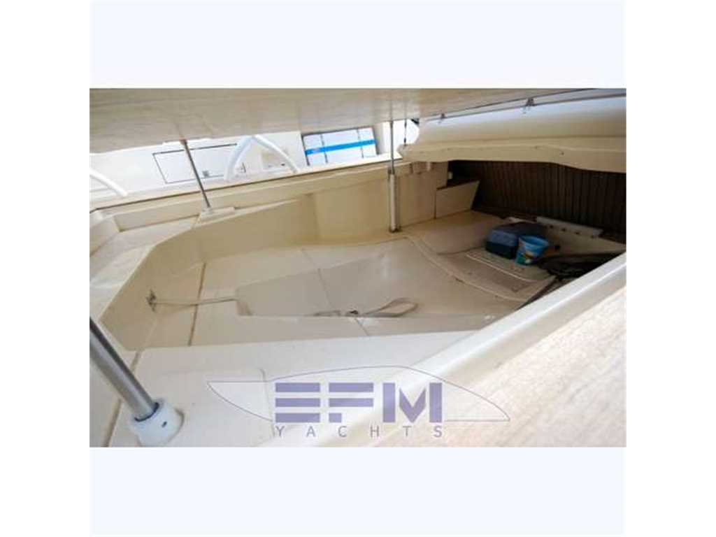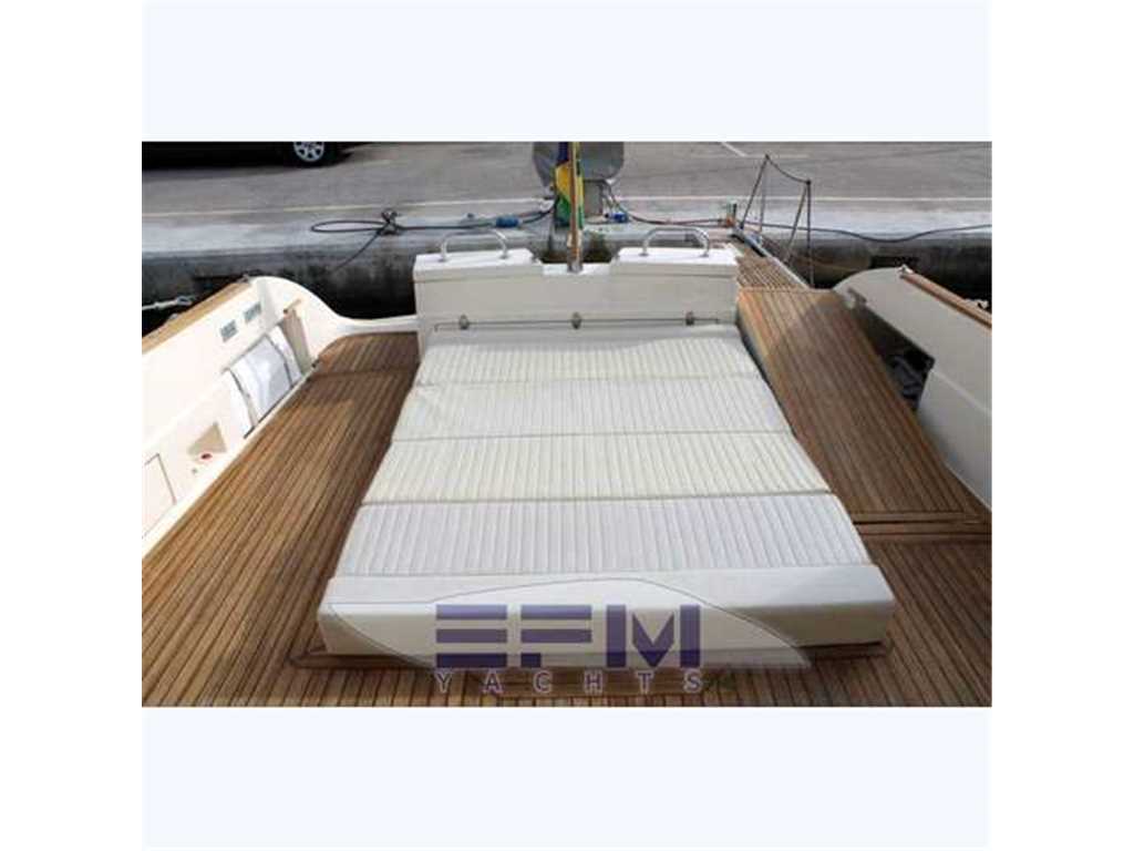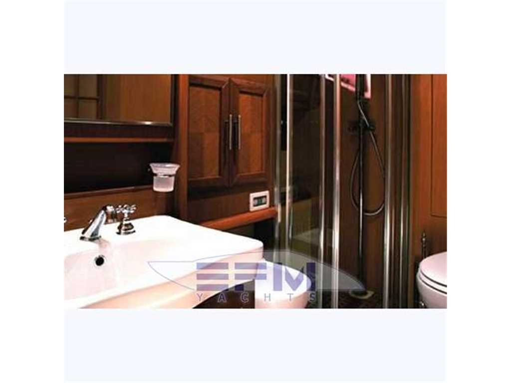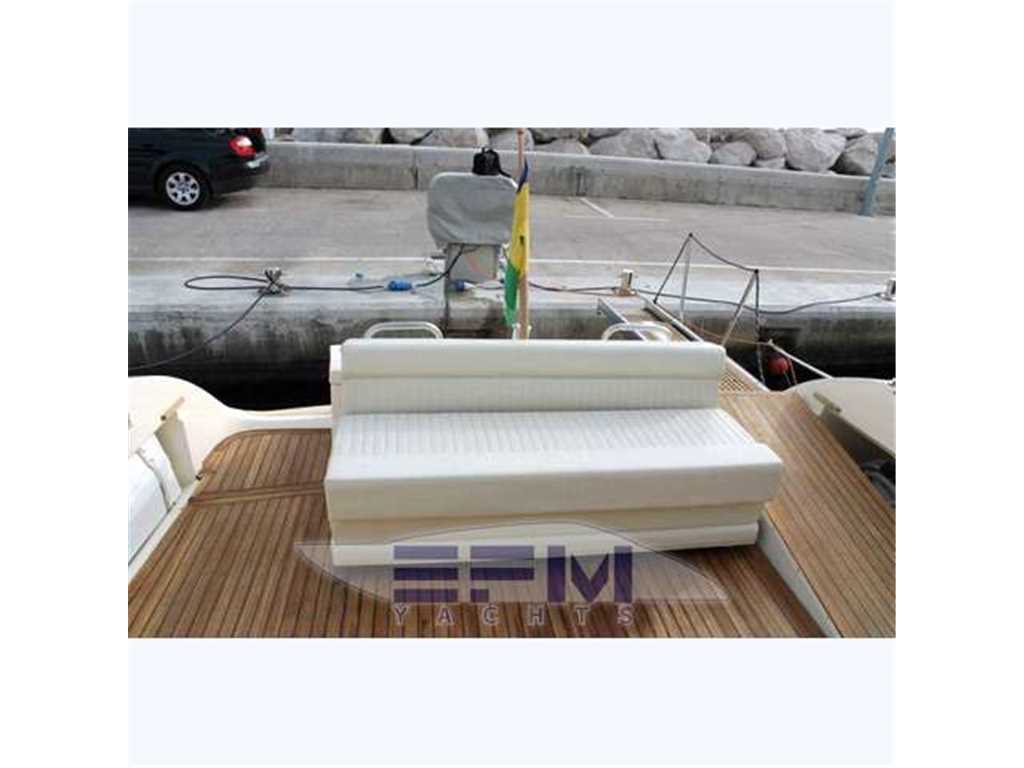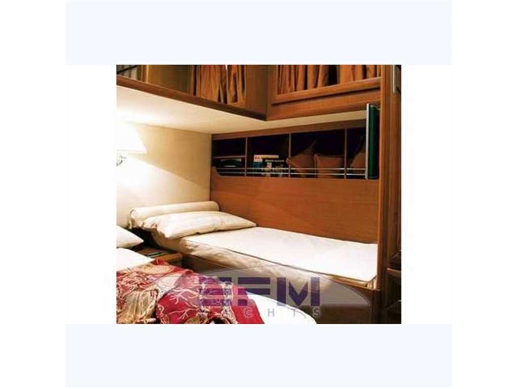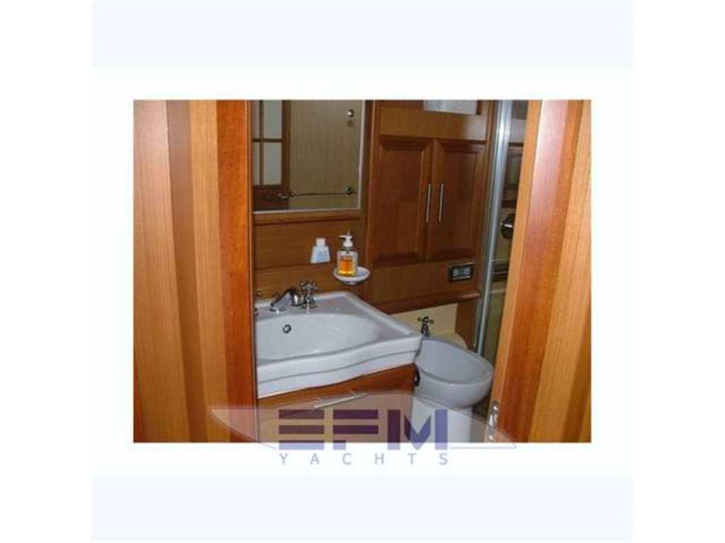Classic interior and very well cared for with high quality finishes throughout in oak wood flooring, teak flooring and leather sofas beige color . 2 cabin version with spacious master stateroom forward with island double bed with 2 drawers, wardrobe , cupboard and a private bathroom with wooden cabinet with sink , cabinets, electric toilet, bidet and separate shower with glass crystal - in the hallway we find the second cocaine guests left with 2 twin beds, wardrobe and cupboards and with private access from the corridor and the second bathroom complete with wood cabinet with sink , cabinets, electric toilet, bidet and separate shower with door - with a separate entrance through the aft cockpit we find the crew cab with a flat bed , cabinet , sink , toilet and shower, and wanting that can ' be used as a laundry room. On the upper deck, separated from the cockpit by a glass door with double opening , and there ' a unique environment composed left by the large C-shaped sofa in leather and the large rectangular table made ??of solid oak , and opposed to the starboard side of the cabinet service with the retractable LCD TV and more 'forward starboard side of the wheelhouse the kitchen area fully equipped kitchen with Ariston plate ceramic hob with 4 burners, fridge with freezer 80 lt Frigoboat , dishwasher, microwave - to the left is the helm with the 2 seater sofa x rider and copilata and comfortable 2 large windows that open stainless steel in the roof. Grande and spacious teak cockpit that serves as outdoor living area is furnished with a 3 seater seat that converts into a comfortable wishing you great sun , tender garage aft hydraulic opening .