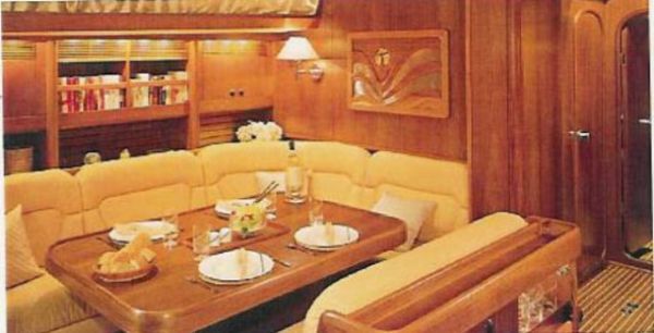 1 grande doble cabina completa viga master con baño de vanidad de esquina de antesala, armario y cajones 1 reservado para el dueño con una ducha cabina 1 doble VIP invitados 1 aseo reservado VIP huéspedes 1 camarote con literas, 1 baño con ducha de 1 arco para baño de cabina marinero con todas las comodidades para el gráfico de marinero elaboró el plan con la electrónica de cocina amuralladalineal con encimera, gas ALPES INOX fuegos nevera 4, doble potencia congelador (220 V-12) de la fuente con primer enjuague del pedal del agua de mar bomba de grupo del mezclador del fregadero de acero inoxidable y pie bomba para microondas de Raritan BI 230 V de refrigerador de agua dulce, sala de estar con sofá, mesa y piso de madera de sillas muebles finos gabinetes