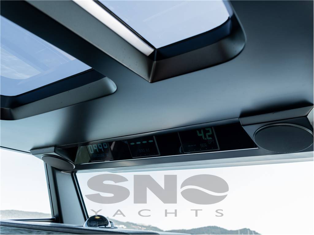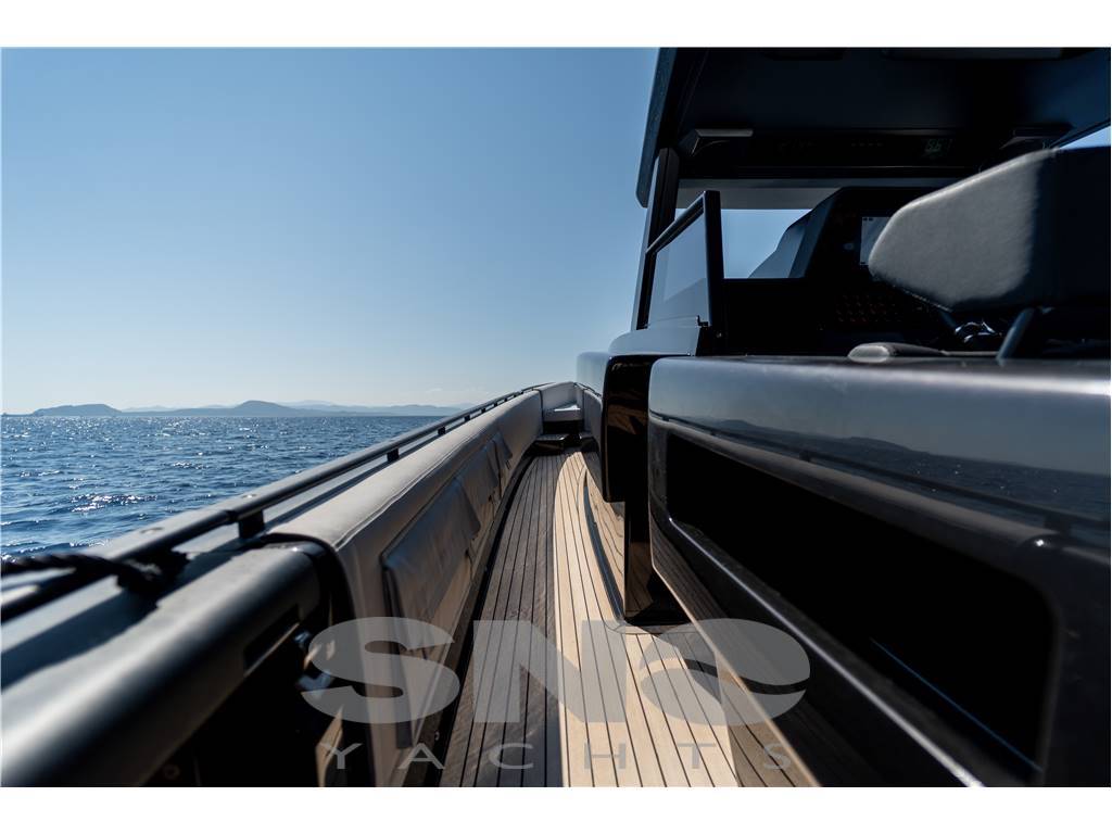 Il layout walk around degli esterni consente di sfruttare al massimo gli spazi di coperta destinandoli agli utilizzi per il giorno. L’area di poppa ospita un grande prendisole in continuità con la dinette del pozzetto, un vero e proprio salotto coperto e riparato in costante contatto con il mare e il cielo grazie all’altezza della visuale sull’acqua e alle trasparenze del tettuccio. Gli accessi al mare sono garantiti dai passaggi laterali e dalla grande plancia di poppa, accessoriata di una comoda scala bagno.