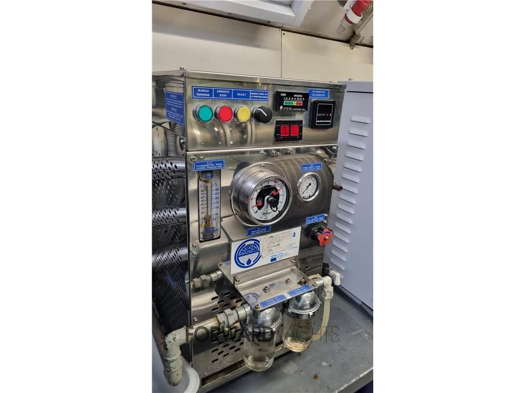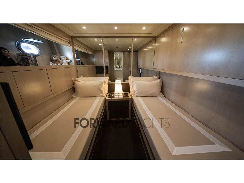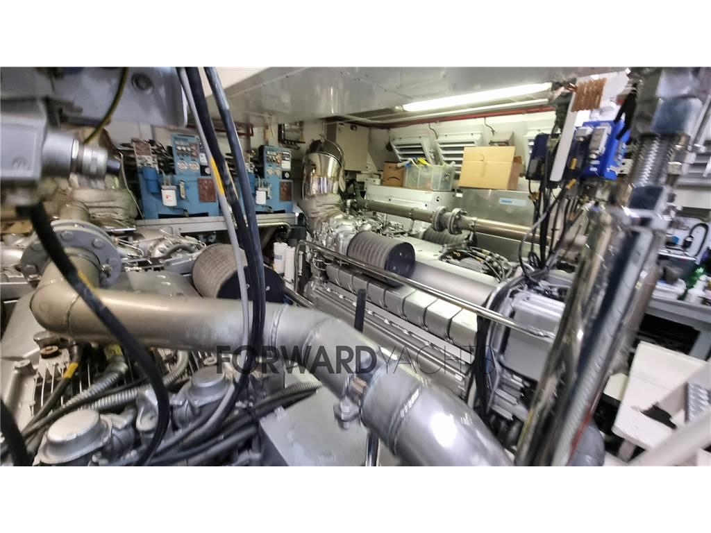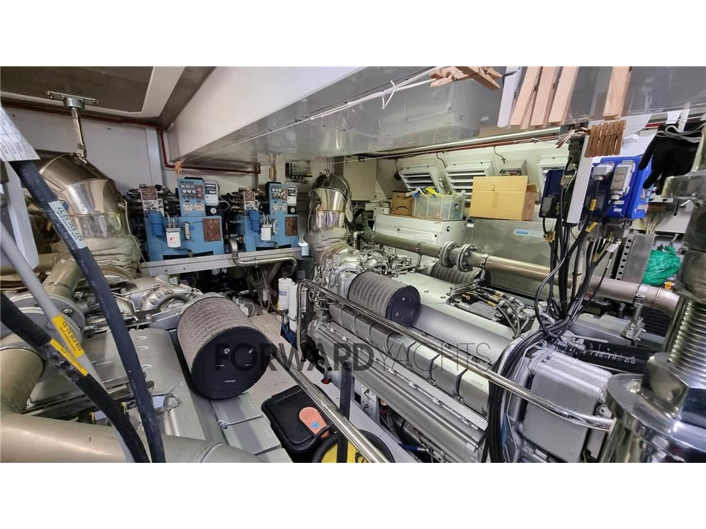 Notas internasUPPER DECK: Large living area with a decor based on a pleasant contrast between light wood and dark shades of leather and wengé flooring, 50’’ smart tv. The finishes are in oak, while walls and ceilings are covered with natural leather. A dining table faces a sofa served by a small table. Bar area with 2 Frigit refrigerators and icemaker. The wheelhouse, continuing towards the bow, provides a comfortable and spacious leather seat. LOWER DECK: The amidiships owner's double cabin is full-beam, a corner vanity on one side and a sofa on the opposite side, a walk-in closet and a large bathroom, 42’’ smart tv + cd/mp3 player. Continuing towards the bow we meet 2 guest cabins with en-suite bathrooms, one double and the other one twin, with smart tv + cd/mp3player. Forward VIP double cabin with en-suite bathroom, smart tv + cd/mp3 player. CREW QUARETER: Completely separate & indipendent: 2 twin cabins with relative bathrooms - Fully equipped galley with Miele oven & microwave, Frigit wine cellar, Miele hot plates x4, 2xFrigit professional refrigerators + freezer, Miele dishwasher & washer&dryer machine, TV Sony & security cam Notas de la instrumentaciónStrumentazioni:? VHF DSC Simrad Handset RS82 ? KVH satphone (disused service) ? PABX Telephone Exchange System 4 + 5 x cordless phones ? Panasonic Channel Cell Station Unit ? Simrad Radar & Black Box ? Radar scanner 4” + display ? Simrad GPS CX33 – Main Simrad Chart Plotter Display RA 83/93 ? Simrad Autopilot AP50 with Kamewa interface AD50, remote QS50 ? 3 Data Repeater Display ? Simrad Compass Interface ? Simrad Speed/Depht Transducer ? 3 x data repeater display Simrad ? pilothouse multi IS20 – galley IS20 – captain cabin IS20 ? MTU Blue Vision CPU - Wiper Control Speach ? Simrad Wind Amplifier - Wind Transducer ? 5 X Cordless phones – 1 x wireless keyboard. Notas de armamentoAccessori:- BCS Hydraulic bowthruster 25kw - KVH SAT System - electric searchlight Sanshine - Security camera in aft deck, engine room, helm, galley and captain quarters CCTV - n. 2x28kw Kohler generators 230/50Hz C FOZ - n. 2xMastervolt battery chargers 24/120 + inverters - Frigit reverse cycle air conditioning 230V AC - Idromar Watermaker MC3J vertical 250 L/H - Fresh water pump: Gianneschi ECOJET B 230V AC + 24V DC - Main engine fuel separator SEPAR - n. 2 x Lofrans Project 1.5kw/24V - 2 x Lofrans Project 2kw/24V vertical anchor windlasses - n.2 x105 kg galvanized anchors + 2x14mm chain lenght of 100mr galvanized - gangway / Tender hoist Sanguineti Pasman 92 max load 480kg - swimming ladder Sanguineti OV.92 - hot/cold deck shower - full emergency equipment – suntop, bow & cockpit sunbed - - Williams 385 jet tender |