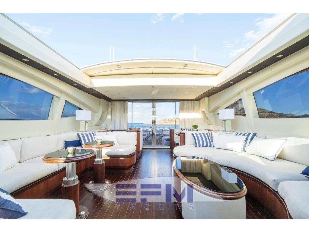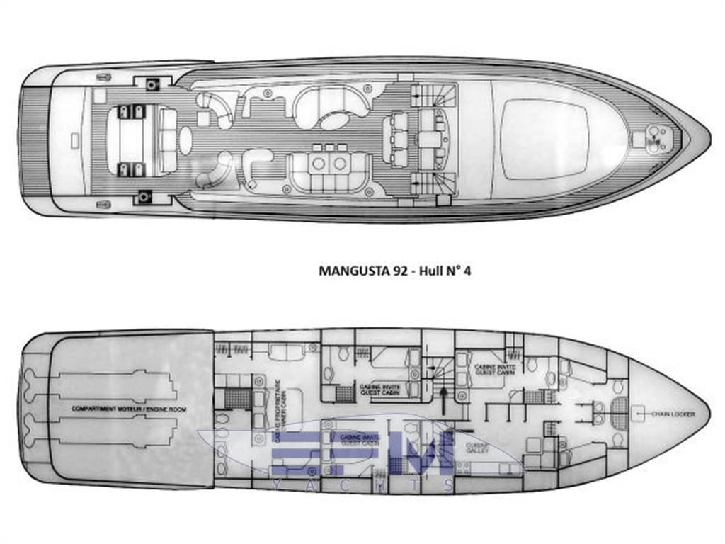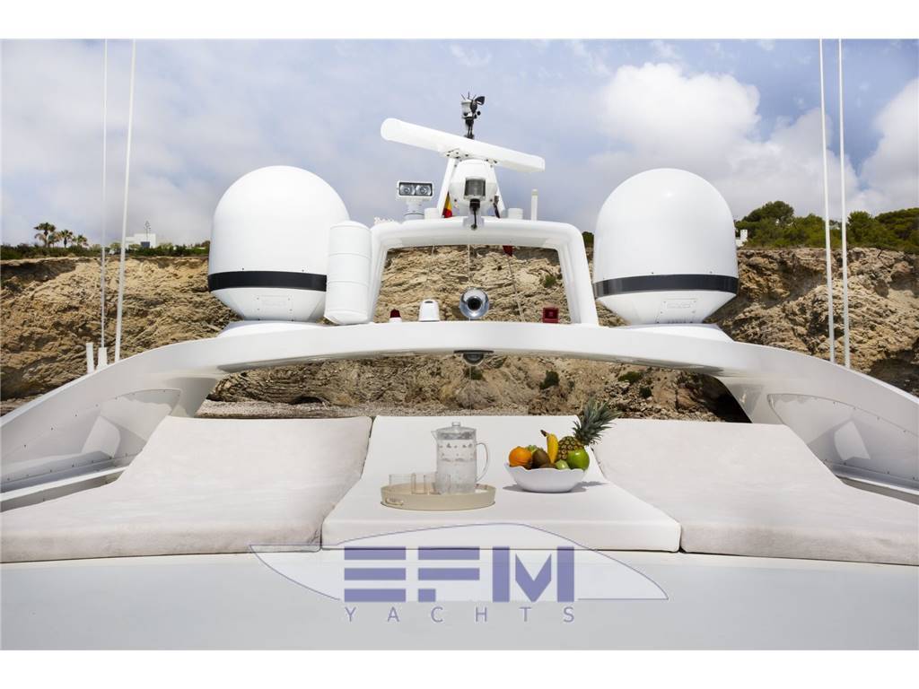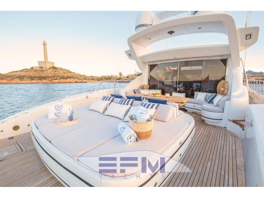 Notas internasOWNER : Master cabin is located amidships, full beam with king size bed, ensuite bathroom with shower and walk-in wardrobe.. GUESTS: Two double cabins with queen size beds and ensuite bathrooms. One twin cabin with Pullman bed and ensuite bathroom CREW : Accommodation for 4 crews in 2 cabins with ensuite bathrooms HER features interiors that are modern yet timeless. The saloon is both spacious and stylish, with a variety of ambiences to be enjoyed across the different spaces. Due starboard, SHE has a couch area with two small tables that can be transformed into a large dining table. Opposite this (due port) is an area with large sofas and a low table with two beanbag chairs, providing the ideal place to relax and watch TV, or to chat with friends. By the entrance are two sofas and a table that has a backgammon board inside of it; this is the perfect place to play tabletop games and to admire the sea views. Opposite this table there is a bar where cocktails and aperitifs will be prepared for you. In addition, the salon has a retractable roof that allows for alfresco dining, but with the touch of the button the roof will retract for a more formal dining experience. SHE sleeps up to nine guests and has 4 bedrooms. These include: a large master cabin; a spacious VIP cabin at the bow; a double cabin on the starboard side; and another cabin on the port side with two single beds and a fold-out bunk bed to accommodate a third guest. All of the bedrooms have an en-suite bathroom. On HER you will be living in sunlight. The spacious outside deck boasts a custom-made table at the stern that can comfortably accommodate eight diners - the perfect place for entertaining in style. The main deck wraps around the yacht, leading to a generous sundeck at the bow and stern, and a third area on top of the roof to sunbathe in absolute privacy beckons the sun worshipers amongst your party. On the very upper deck it is a private screened area with a super comfy sun mattress so you can soak up the sun in total privacy. The wide swim platform ensures easy water access, where an extensive fleet of water toys provide hours of fun, and complete your holiday. Notas de la instrumentaciónNavigation InstrumentsCHART PLOTTER Maxsea GPS Furuno Navigator + Maxsea RADAR SIMRAD AUTOPILOT SIMRAD VHF SIMRAD New in 2018 with new MMS Elettric & Idraulic Sistem GENERATORS 2 x 27 kW 230/50 Hz Kohler GENERATOR HOURS February 2020 Starboard: 10,017 (approx.) - Port: 11,406 (approx.) Overhauled 2018 24 VDC Electrical system with Mastervolt Chargers 220 AC with 2 shore line inlets. 24/220 Volts Inverter for Media system FUEL SEPARATOR SEPAR SWK 2000 SEWAGE TREATMENT Hamann Supermini WATER MAKERS Idromar 180L/h WATER SOFTENER Yes FIRE/BILGE PUMP Gianneschi WC’S Tecma vacumm system AIR CONDITIONING Frigit BOILERS 2 x 100 L (the forward one replaced in 2019) Icemaker Av Equipment Sea Tel satellite TV antenna (*) LG Smart TVs in all cabins (New 2019) Samsung Smart TV in saloon (New 2019) Stereo Denon music system with different areas and iPad control (New 2019) Satellite Smart TV Internet WiFi4G Audio equipment with independent areas Speakers throughout the boat Notas de armamentoDeckANCHORS 2 x 79 Kg ANCHOR WINDLASS 2 x Lofrans PASSERELLE Sanguineti UNDERWATER LIGHTS Blue LED Aqualuma (New 2019) Mooring Lines and Fenders Huge set of covers, winter covers, summer covers, canvas, etc. Teak dining table in cockpit (New 2018) Exterior small cushions (New 2018) Sunbathing cushion on top of roof (New 2019) Bimini top for the aft cockpit (New 2018) Exterior chairs (New 2018) Standing up shower in bathing platform (New 2018) Hard top sundeck Retractable awning at the bow and stern Private screened area on the upper sundeck Domestic Equipment MAIN GALLEY: Fully equipped galley with electric hub, Miele dishwasher machine, oven, wine cellar, etc… LAUNDRY: Two new washing machines in 2020, one of them with dryer option. Safety & Security Equipments All safety equipment to comply with MCA regulations 2 Life raft Fire Extinguisher in each Cabin Fire Extinguisher in kitchen Fire Extinguisher in Salon Full auto/manual FM200 Fire Extinguisher in engine room 14 x Life jakets Hand held VHF Set of Fire flares Set of medical kit CCTV system Tenders Williams turbojet 385 2017 Jet ski available under separated negotiations |