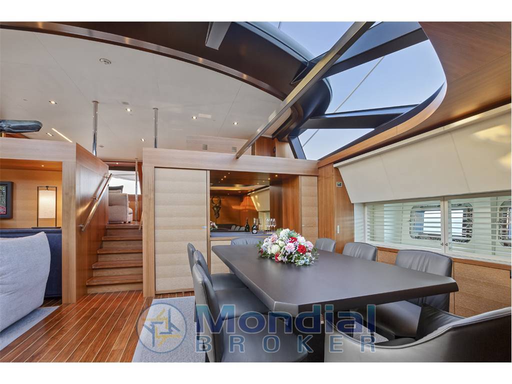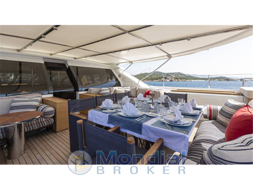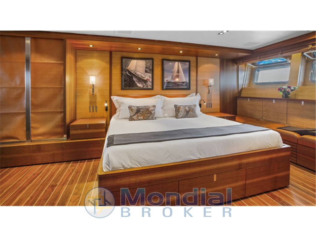 Notas internasSalone superiore dotato di divano a sei posti, poltrona, tavolino e tv a scomparsa; a prua del salone daily toilet; area inferiore con sala da pranzo dotata di tavolo e sedie per 8p., zona relax con divano a L, tavolini, tv e 2 cantinette vini. Suite armatoriale a tutto baglio con letto king size, bagno ensuite con doccia Hammam e macchina per massaggi Therasage e palestra attrezzata; Due cabine ospiti a prua matrimoniali ognuna con bagno e doccia; Cabina di poppa letti in piano convertibile in matrimoniale con 3° letto pullman (max 80kg) e bagno con doccia. Alloggio equipaggio sul ponte inferiore a prua: Mensa e cucina, Cabina comandante con letto matrimoniale + singolo e bagno con doccia; Lavanderia; Due cabine equipaggio con letti a castello, ognuna con bagno con doccia.