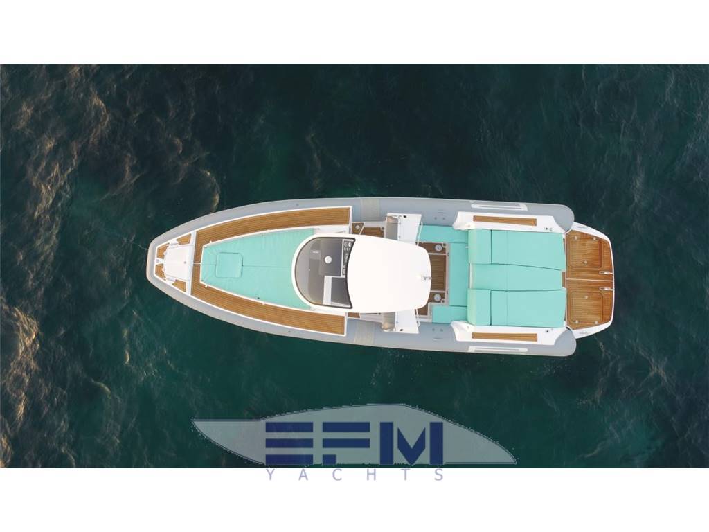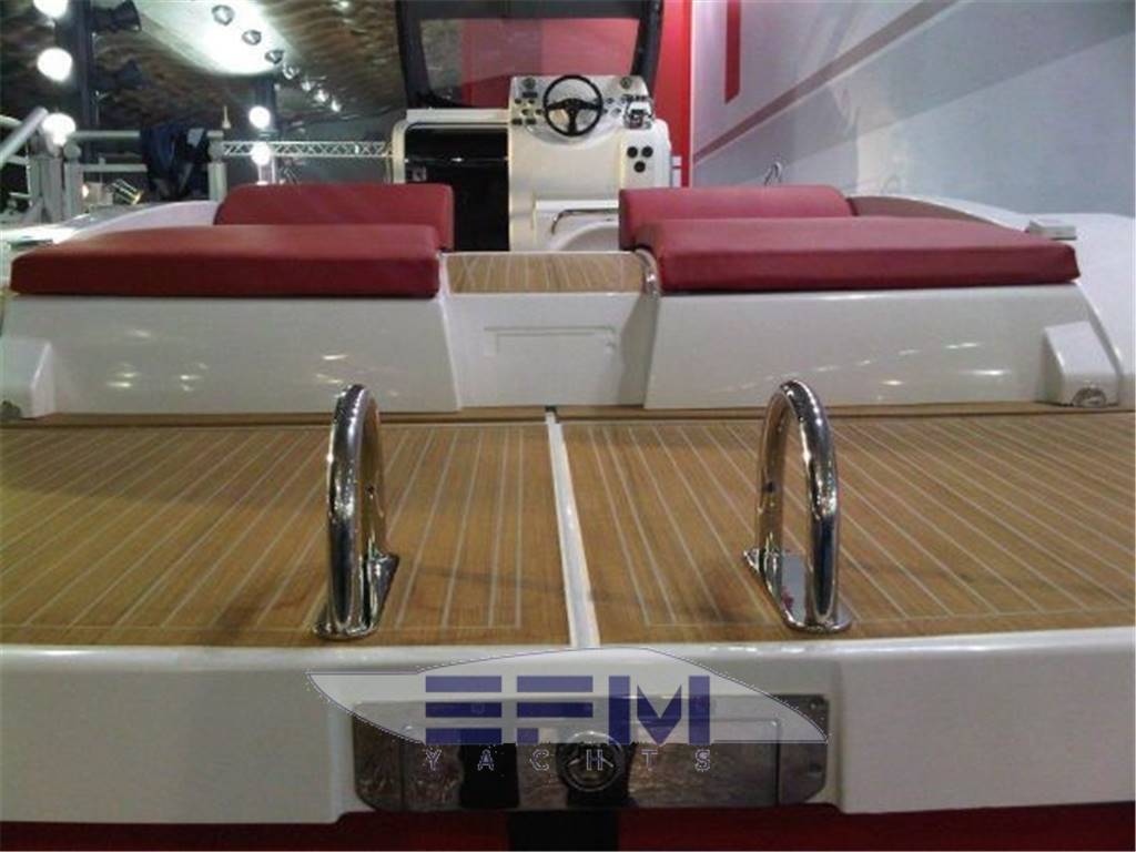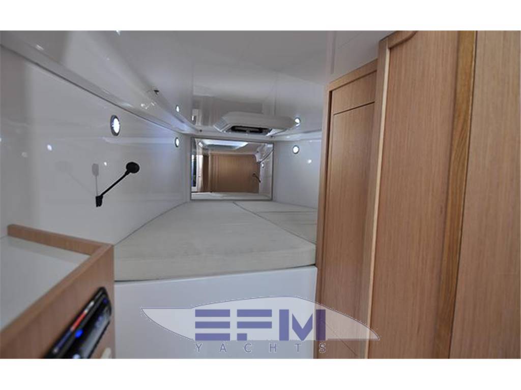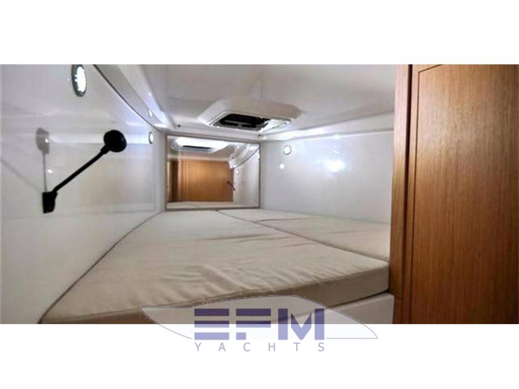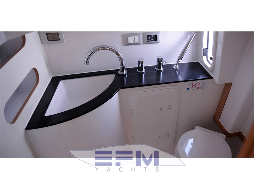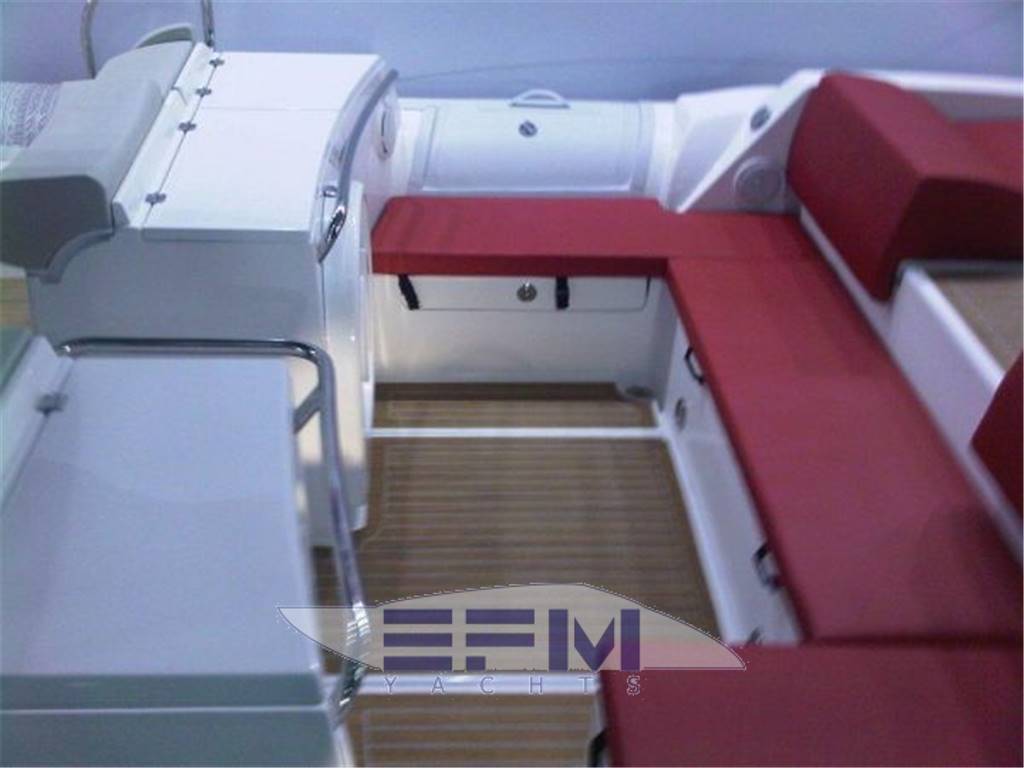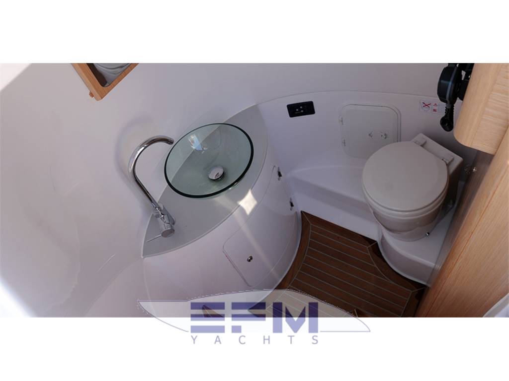 Notas internas• Cabin with double bed • Bathroom with washbasin, shower, toilet and black water tank Notas de la instrumentación• Compass• 12V socket • Dock socket, battery charger, power cord • Horn • Electric windlass with anchor and chain • Inverter • Hydraulic steering gear (efb version) • Raymarine Plotter Hibrid-touch Notas de armamento• Cushions• Central cushion on aft sundeck • Non-motorised ice chest • Electric inflator • White hard top • Shower with fresh water system • Cockpit lights and navigation lights • Cocktail cabinet with fridge and sink • Bilge pumps • Life buoy holder • Teak finish • Digital switching • Battery breaker • Tables complete with feet and stands • Detachable awning • Bracket with retractable boarding ladder (fb version) • Bridge with retractable boarding ladder (efb version) • Automated driver’s seat adjustment |