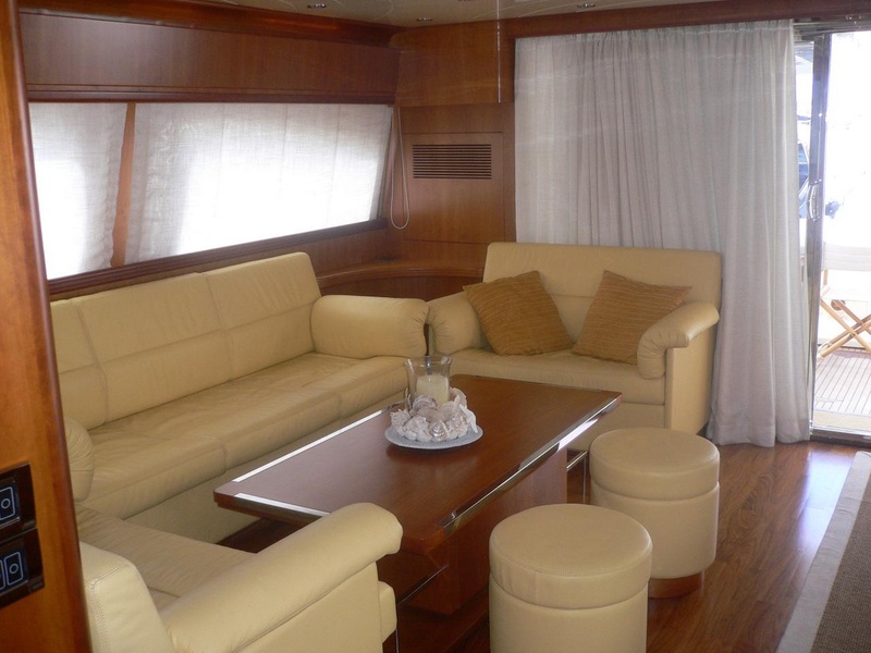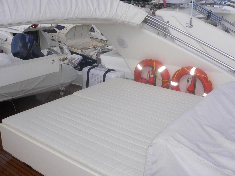 Notas de armamentoincluso el respeto, televisor, un cabestrante en el flybridge, pasarela eléctrico, plataforma de baño de teca, nadar sistema de escalera hidráulica de alta fidelidad Bose Lifestyle 35, bombas de achique, calentadores de agua, aire acondicionado / calefacción, toldo completo cierre cabina, el faro ajustable de la ducha en popa, no 4 decodificador, lavavajillas, potabilizadora lavadora / secadora, 180 l / h, caja fuerte, TV 42 "LCD en el salón, DVD, TV LCD de 32" en el camarote principal, 2 TV LCD de 17 ", 2 TV LCD de 15", disposición de basura, nevera en la cabina, una cámara de máquinas con movimiento horizontal / vertical y fijo en la cabina, antena de TV KVH por satélite G6, teléfono de centralita telefónica, conexión inalámbrica UMTS punto de acceso, sistema de aspiración central, mosquiteros, coprivetri nueva microholed 2010: + cortinas del salón salón, cojines y volar arco