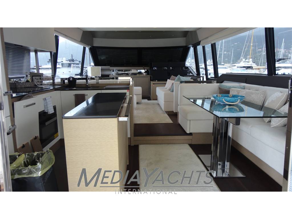 On the Main interior deck, we find a large salon with dinner area with a glass table and "L"-shaped sofa/seats and free standing chairs for a total of 8/10 seats and a Living area area forward with a large "C" -shaped and a cofee table and opposing a sofa and a cabinet with retractable 42' Led TV with electric up-and-down system. The open galley opposite the dinding area on the left side has been equipped with induction hob, sink, fridge with freezer, "combi" oven, and opens towards to external coockpit for maximun conviviality even with guests in the coockpit. Access to the VIP and Guests twins' cabins on the starboard side while the access to the owner's cabin is separate on the left. White leather hupholstery in the salon. Grey Oak decor in 4 cabins version. On the Lower deck with stair access on the salon on the starboard side, we find the VIP cabin amidship with italian-style double bed and ensuite bathroom with sink, toilet and shower box and the two double twins guests cabins and one guests bathroom with sink, toilet and shower. with separate access staircase to the left salon leads to the Owner's cabin forward with italian-style double bed, small sofa, walk-in closet and ensuite bathroom with sink, toilet and separate shower box. Separate exterior stern crew cabin's access with two opposite single bed and separate toilet with shower. "Casamance Platinum" pack for the huphoòstery in the salon and moquette "Vogue 39" in the helm station and in the cabins + curtains "Roman blind" in the salon; Grey Oak wood and parquet Wengè in the entrance and in the salon. On the Upper deck flying bridge a large area with big sofa and dinner table for 8/10 seats in aft side and a second sofa with wet-bar cabinet equipped with sink, fridge and BBQ. The subathing area with cushions forward the helm station. Very great volume for this 68' feet yacht, comparable to a bigger yacht