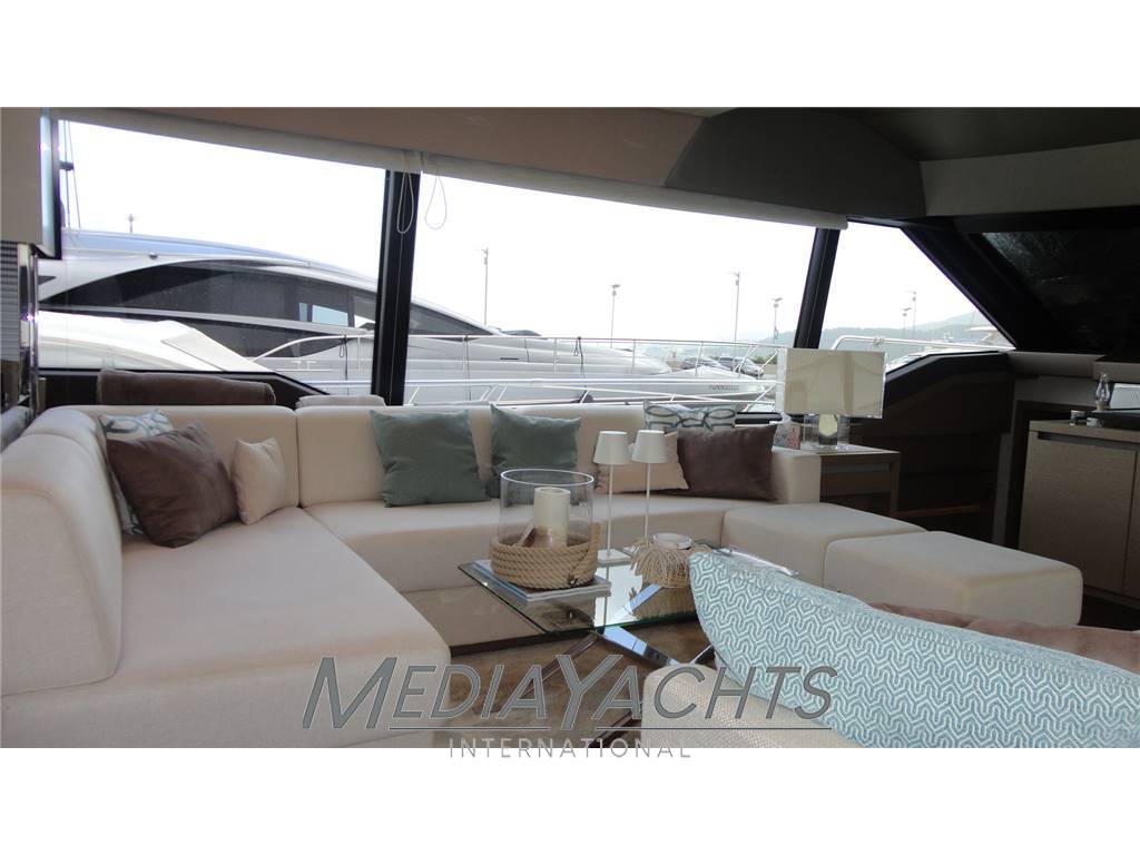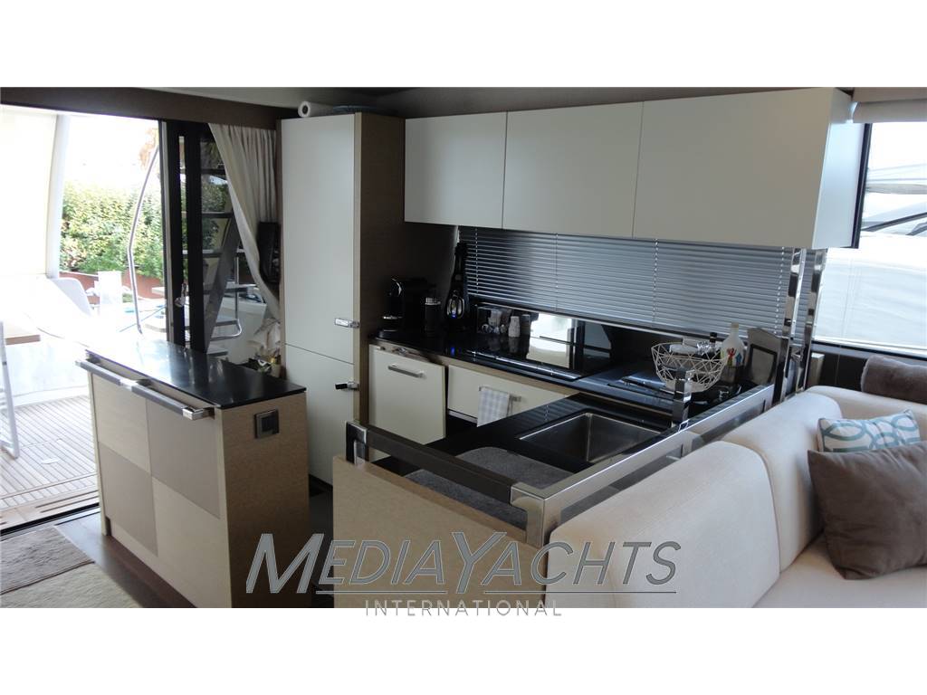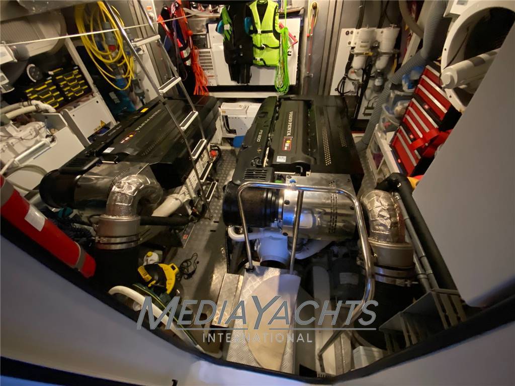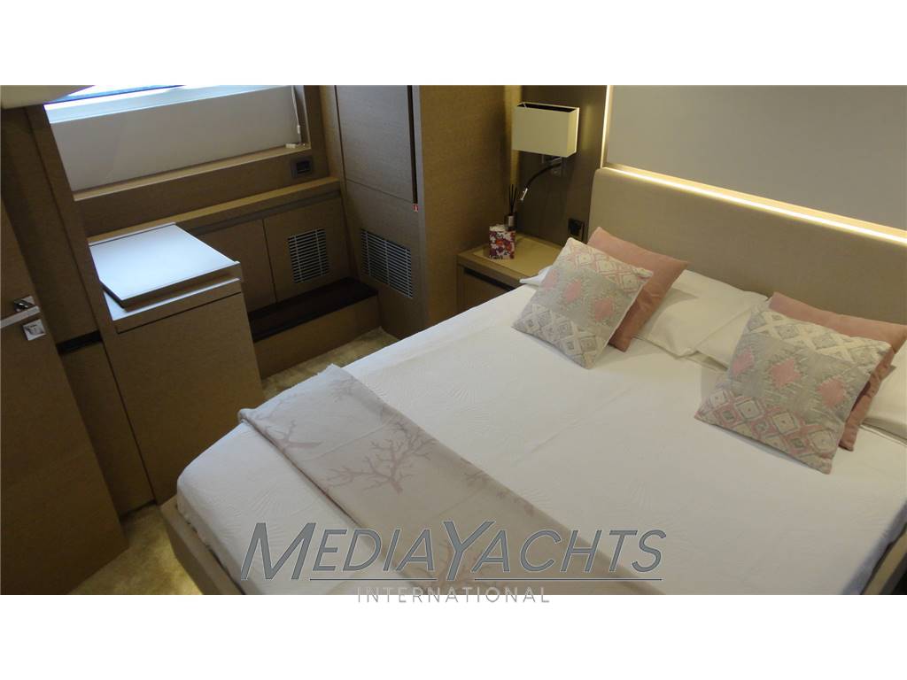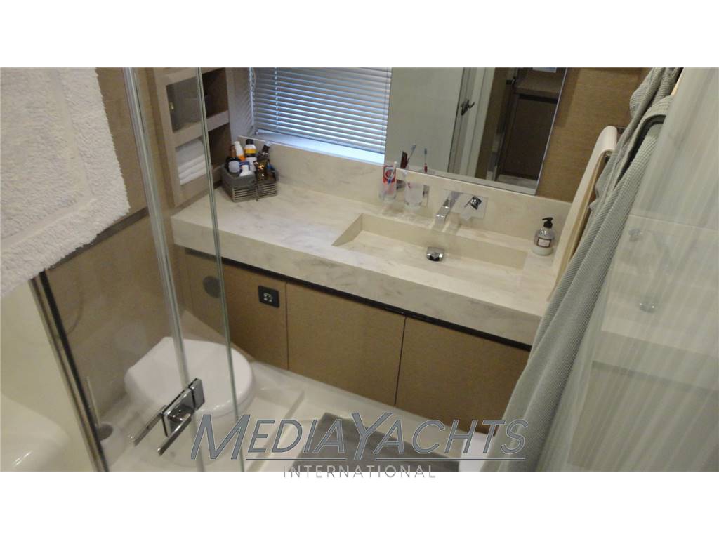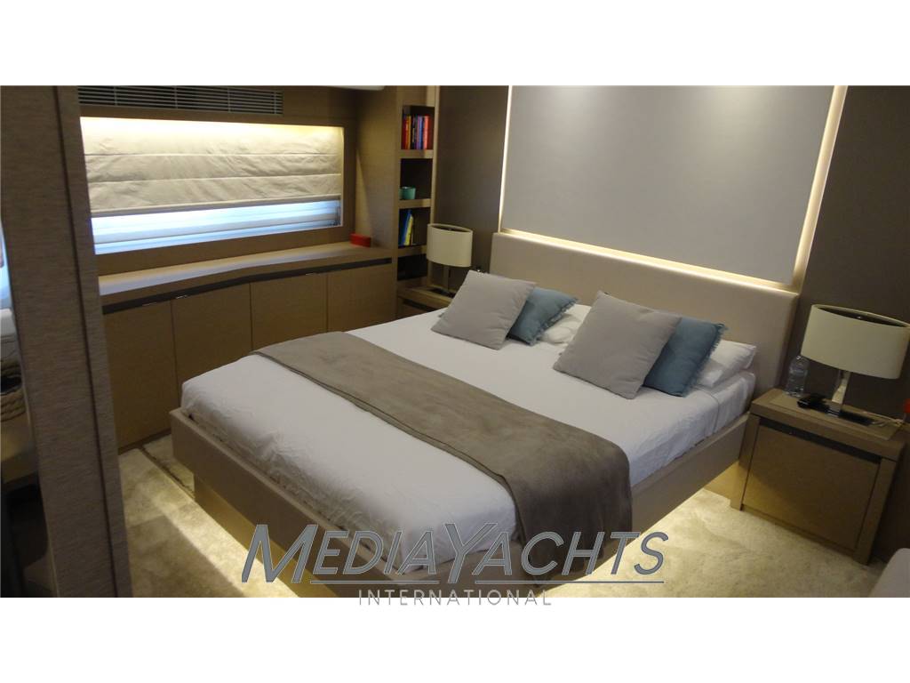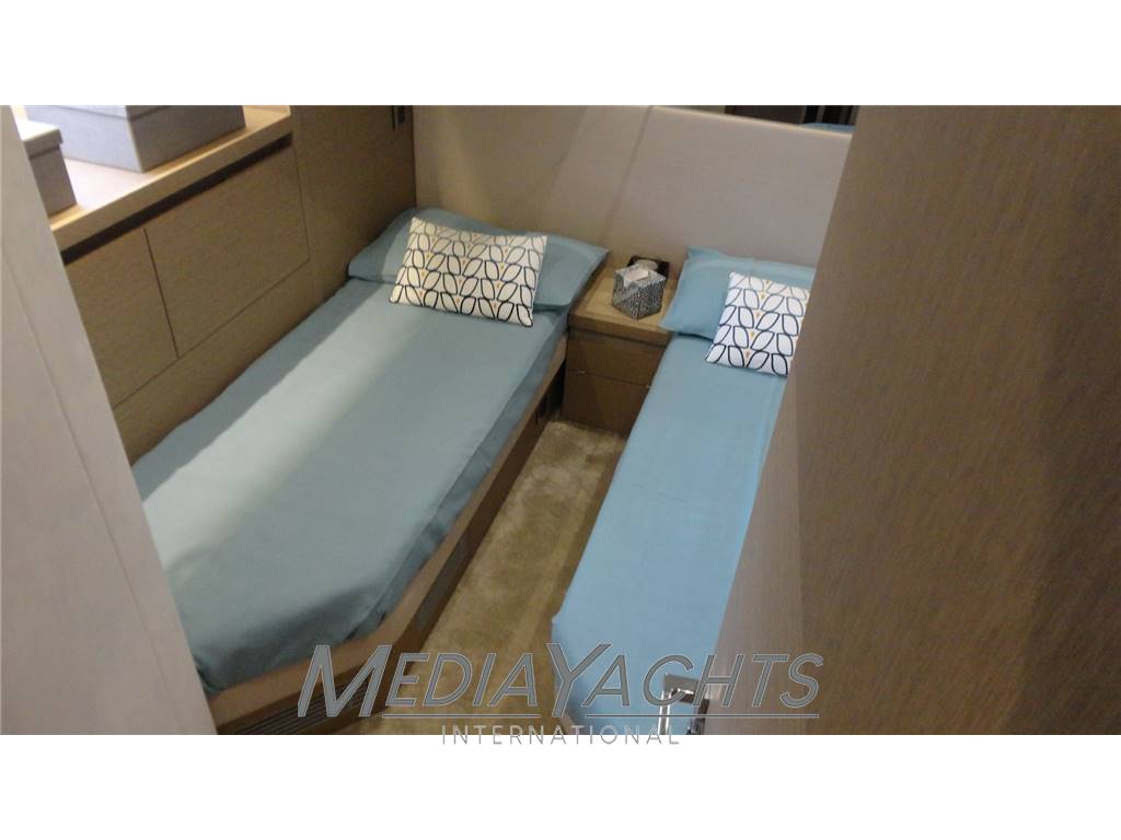 Notas internasSul ponte principale interno troviamo un ampio salone con area dinner con tavolo in vetro con divano/seduta con forma ad "L" e sedie free-standing per un totale di 8/10 posti + una area living a pruavia con ampio divano di forma a "C" + tavolino e divanetto contrapposto e mobile con TV Led 42 a scomparsa con sistema sali-scendi elettrico; la cucina a vista contrapposta all'area pranzo sul lato sx è corredata di piano cottura ad induzione, lavello e frigo, lavastoviglie, forno "combi" ed apre verso il pozzetto esterno per una piacevole e massima convivialità anche con gli ospiti in pozzetto. Accesso cabine ospiti Vip e Twins sul lato di dritta mentre l'accesso alla cabina armatoriale è separato a sinistra. Sul ponte inferiore con accesso scala dal salone lato dritta troviamo la cabina VIP con letto matrimoniale e bagno ensuite con box doccia e le due cabine ospiti con letti gemelli in piano ed un bagno ospiti con box doccia; con accesso separato scala salone lato sx si accede alla cabina armatoriale a pruavia con letto matrimoniale a penisola, divanetto, cabina armadio e bagno ensuite con lavello, wc e box doccia separato - accesso al locale equipaggio separato a poppa per una cabina doppia a poppavia con due letti in piano singoli e bagno privato con lavello, wc e doccia - Tappezzeria in salone pacchetto "Casamance Platinum" + moquette modello "Vogue 39" nella zona timoneria e nelle cabine + tende salone versione "roman blind" - Mobilio interno in rovere grigio con parquet in wenge' area accesso e area salone. Sul ponte superiore grande flying bridge con ampio divano e tavolo in zona poppiera + secondo divano con mobile wet bar allestito con lavello, frigo e grill elettrico - zona prendisole con cuscinerie a pruavia plancia comandi - Ampi volumi per questo yacht ben comparabili con yacht di misura superiore.
