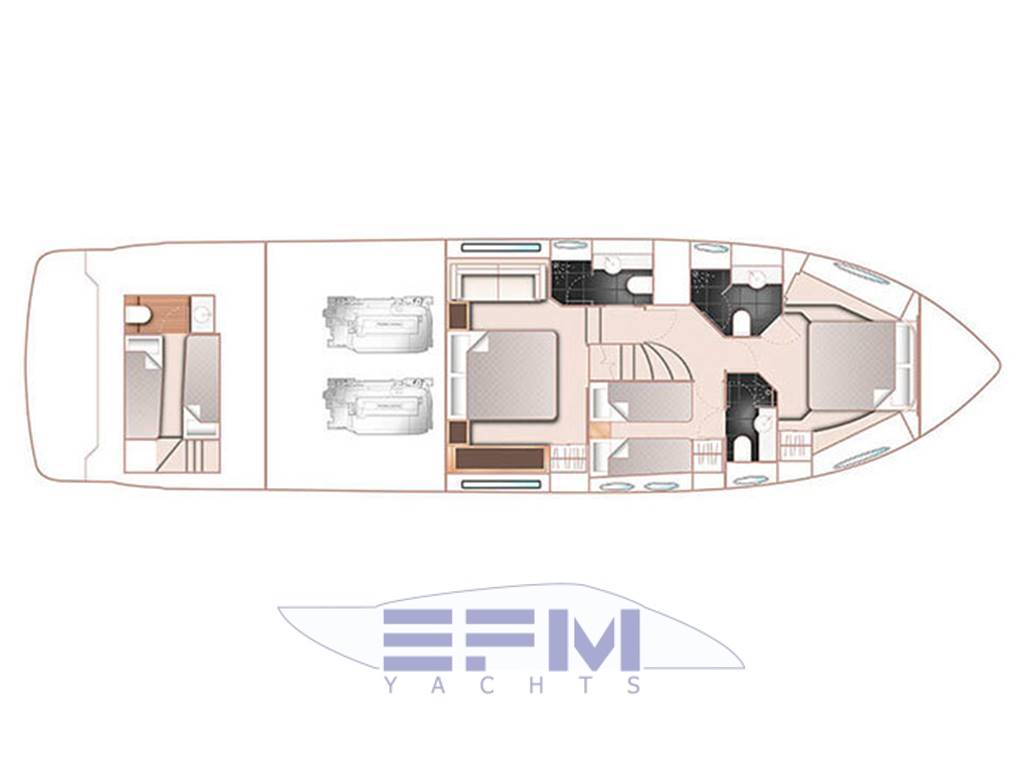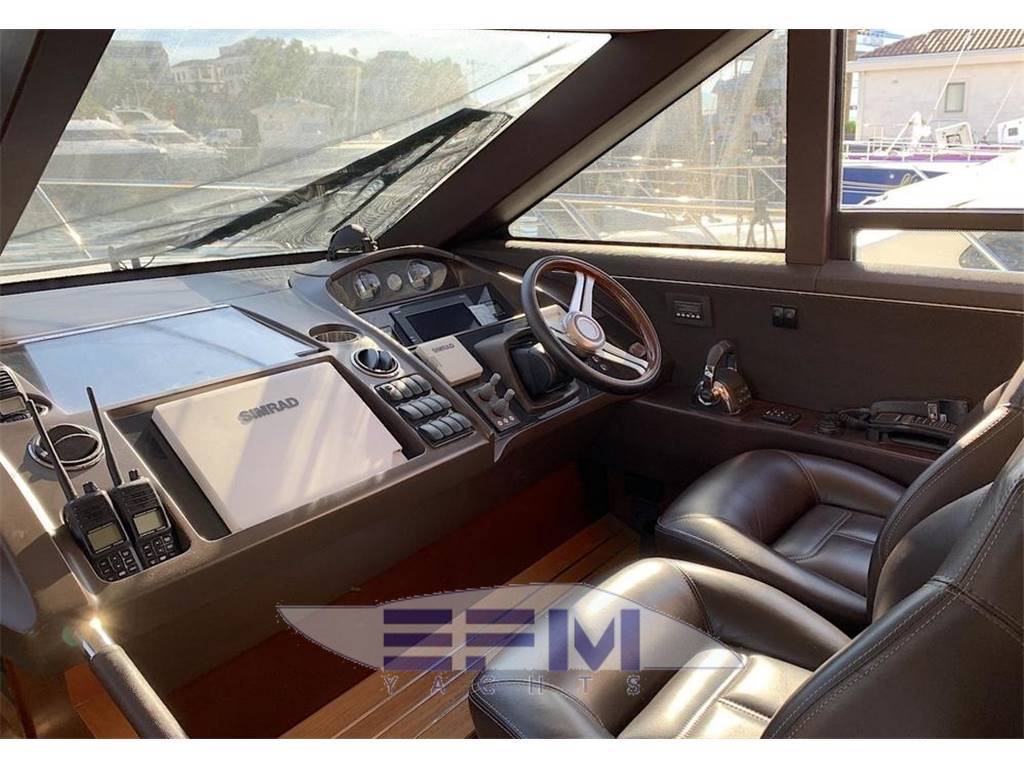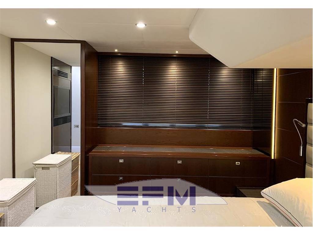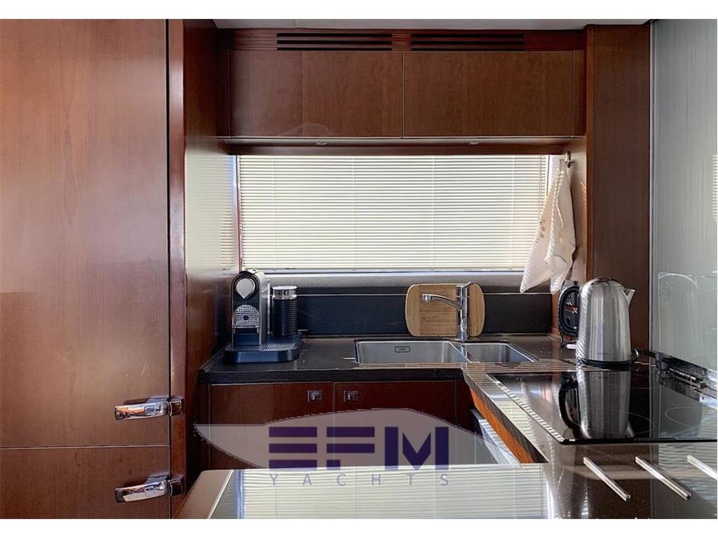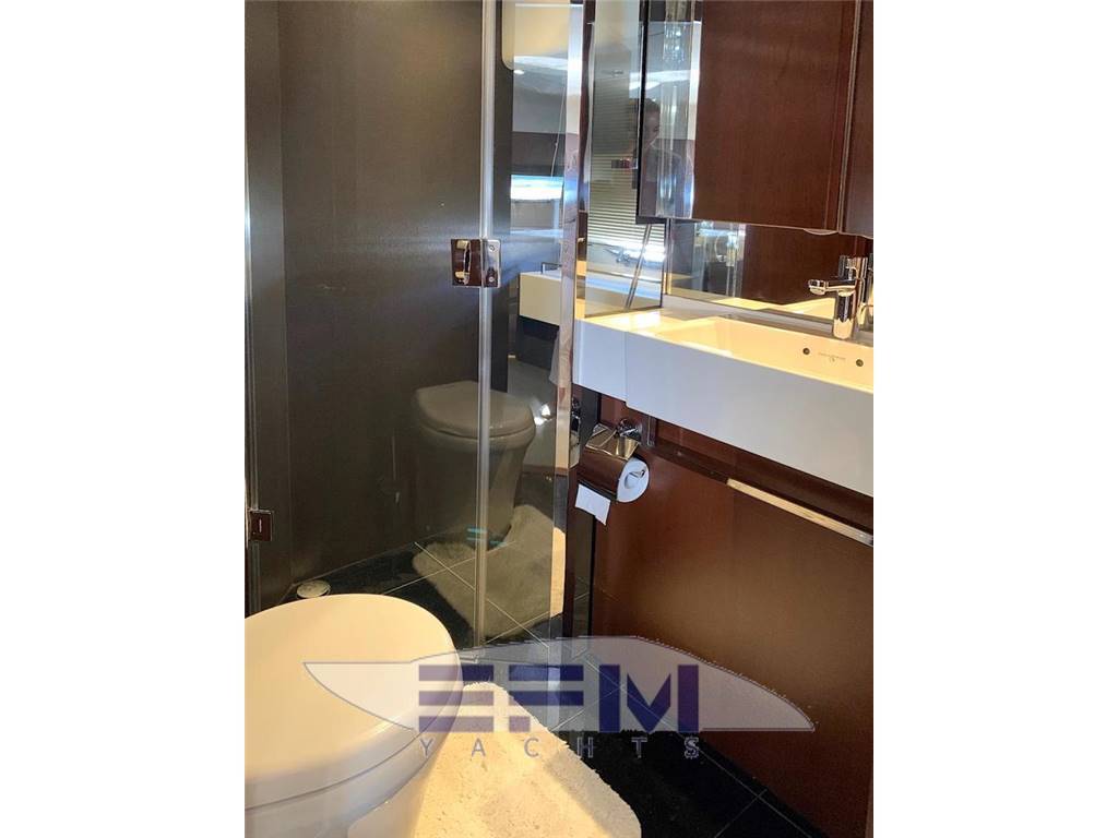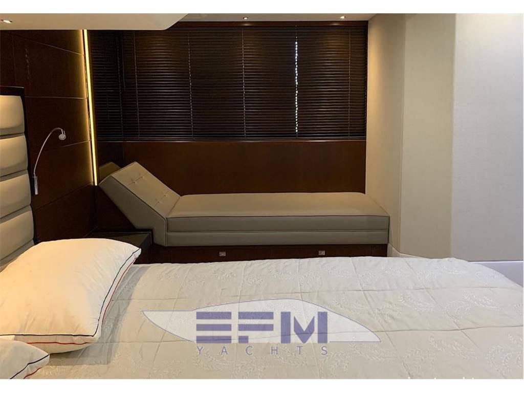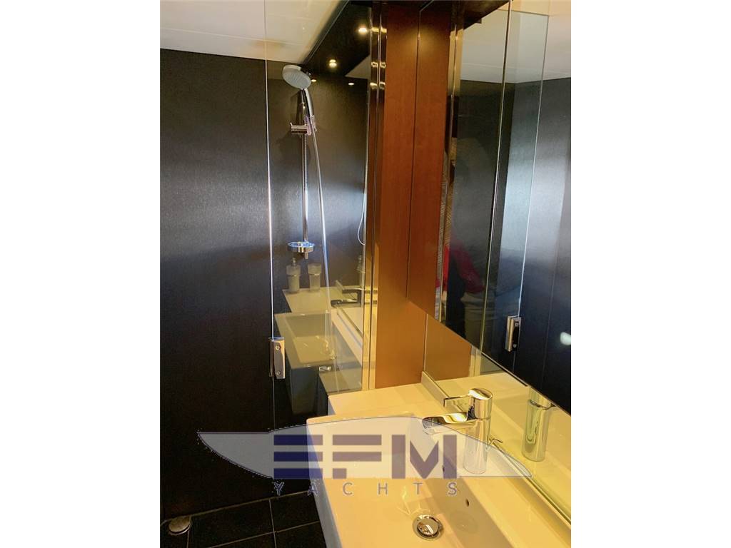 Notas internasHead compartments 3 + 1 CREW 1 MASTER CABIN ENSUITE 1 VIP CABIN ENSUITE 1 GUEST CABIN + 1 DAY HEAD 1 CREW CABIN 2 BEDS + 1 HEAD Notas de la instrumentación• Navigation SIMRAD: NSE12 12'' chart plotter, AP24 Autopilot, IS20 multifunctional display, Boeing AHD 880 TC engine control display, VHF, compass, Bennett trim tabs control, RS87 VHF, open array radar, glommed antenna on flybridge• Generator ONAN Cummins 13,5 KW • Bow and stern thrusters + YACHT CONTROLLER • Watermaker 180 l/h • Boiler 73 lt • Cruisair climate control in all areas • Stereo system with radio / iPod / MP3 player on flybridge • Stereo system Kenwood with 4 waterproof speakers on flybridge • Samsung TV 46" with Hi-Lo system in salon • DVD-player, radio/MP3-player and BOSE 2.1 system in salon • TV Samsung 40", stereo radio/DVD/MP3 player in master cabin • 4 x battery 125A for engine starting (new, replaced in 2017) • 6 x additional service batteries 125A (new, replaced in 2017) • Battery charger 60A for charging both battery packs via automatic charging system • Searchlight with remote control on fly and main helm Notas de armamento• Teak in cockpit, swimming platform, flybridge• Electro-hydraulic gangway Opacmare • Hydraulic swimming platform (shower cold/hot) • Bimini top in cockpit • Anchor Delta with 85m chain • Bimini top in flybridge • Co-pilot seat on flybridge • U-shape sofa with teak table on flybridge • Wet bar with sink, ice maker and grill on flybridge • Sunbathing cushions on bow • Teak table in cockpit • Co-pilot seat on main helm • U-shaped sofa with coffee table • Wet-bar with Waeco refrigerator, place for bottles and glasses and icemaker in salon • Table in salon with storage place inside • Ceran ceramic 4-burner hob, Panasonic microwave/oven with grill • Dishwasher in galley • Waeco full-size refrigerator with separate freezer • Bosch combo washing/drying machine on lower deck • Additional Waeco refrigerator on lower deck • Deck hatch with mosquito net and curtain in VIP cabin • 2 x single beds electrically transformable into a double bed • Crew cabin with air conditioning, 2 single beds, head with toilet • Interior finishing with black cherry wood (matte) with glossy inserts • Blinds for all windows and portholes • Carpet floor (beige) in salon and all cabins • LED lights • Cockpit cover • 2 x electrical winches |