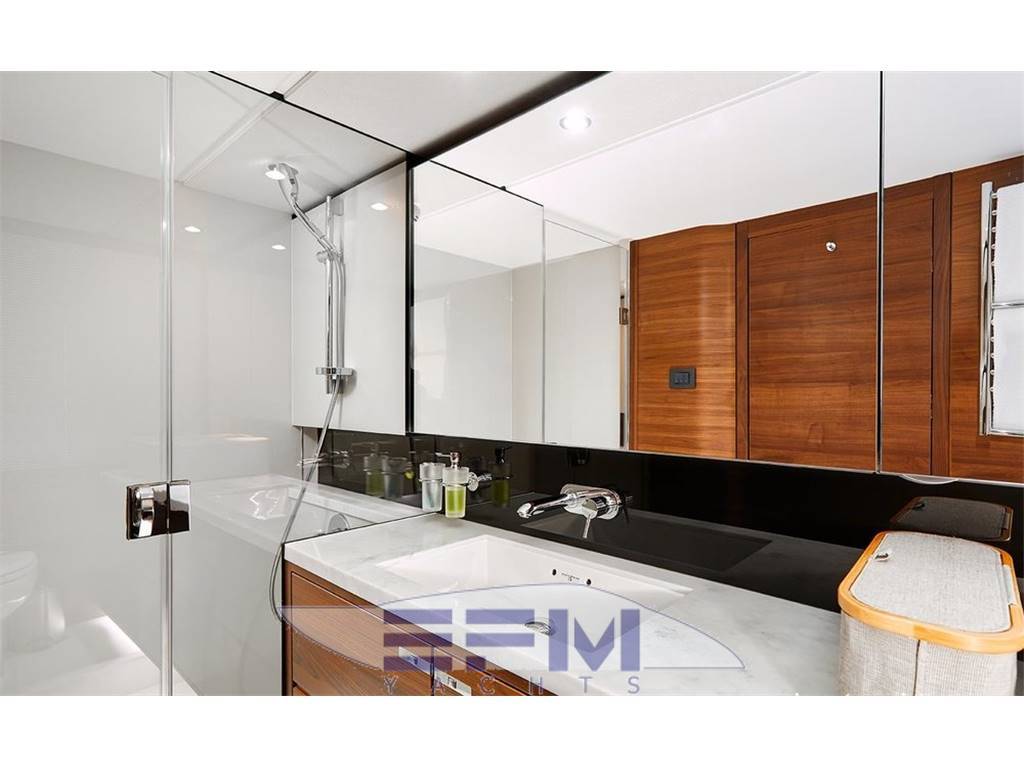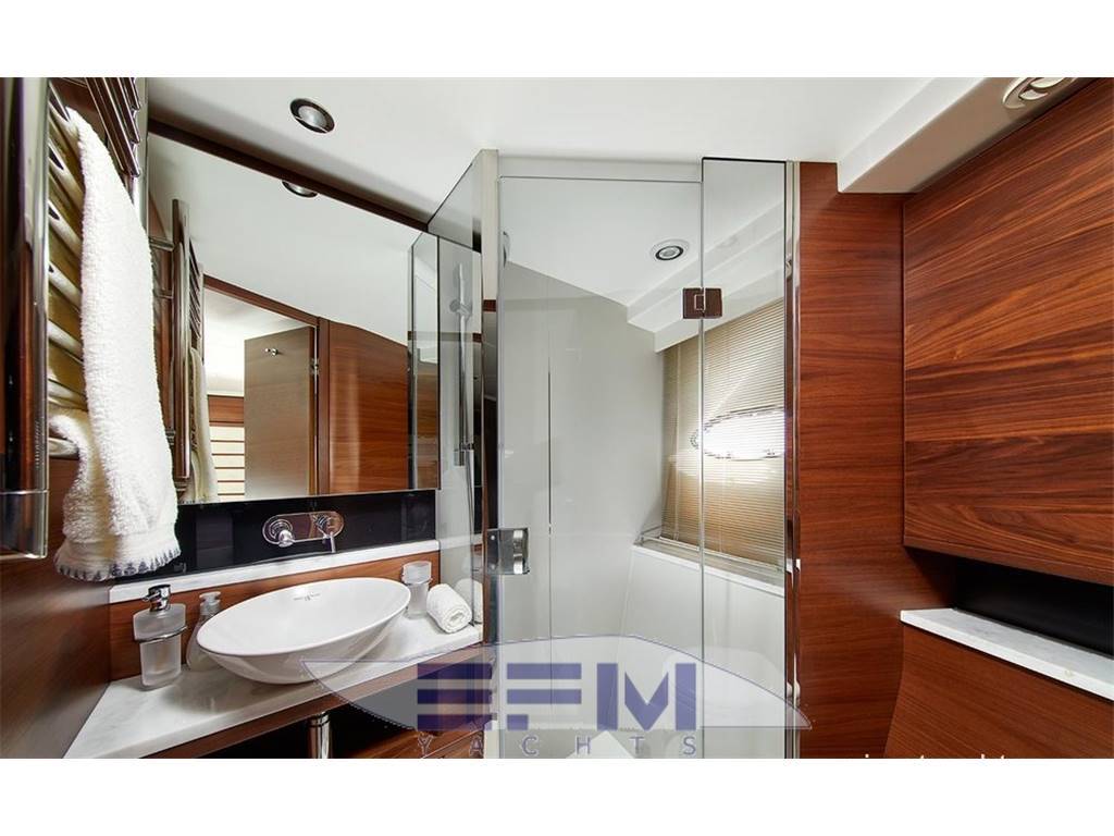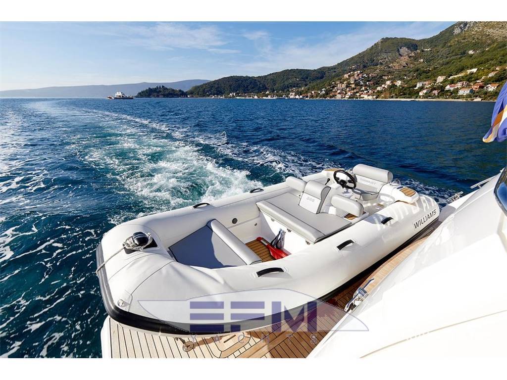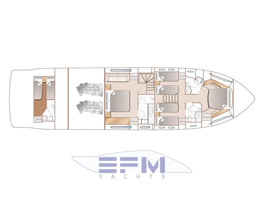 Notas internasBerths 8 + 2 Crew Head compartments 3 + 1 Crew Notas de la instrumentaciónNavigation system:• AIS Raymarine • VHF • 2 x Raymarine GS 165 at lower helm • 2 x Raymarine GS 165 at upper helm • Radar • SAT TV system and empty domm Notas de armamentoAdditional options• Fin stabilization system • Watermaker • Full air conditioning • Two generators ONAN • Electrohydraulic telescopic gangway • Hydraulic swimming platform • Teak on side decks, cockpit, swimming platform and flybridge • Teak table in cockpit • Hydraulic bow and stern thrusters • Guest cabin with sliding two beds • GRP flybridge hardtop with electric opening section • Lighting on flybridge • AUDIO/VIDEO package • External sunbathing cushions • Stainless steel anchor • Stainless steel swimming ladder • Underwater transom lights • Separate washing machine and dryer • Coffee table in salon • Mosquito screens for all opening portlights • Tender Williams 385 turbojet • Separate entrance to the owner cabin from salon • Bow tent with portable poles |
