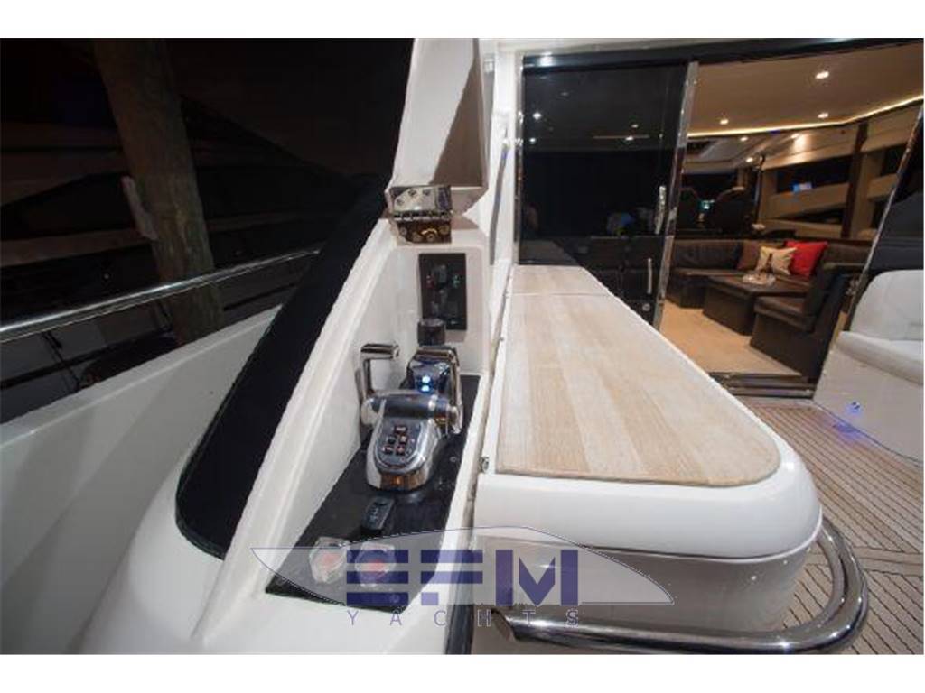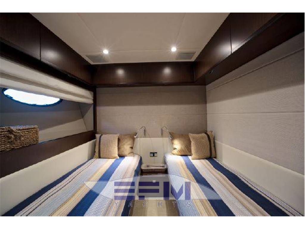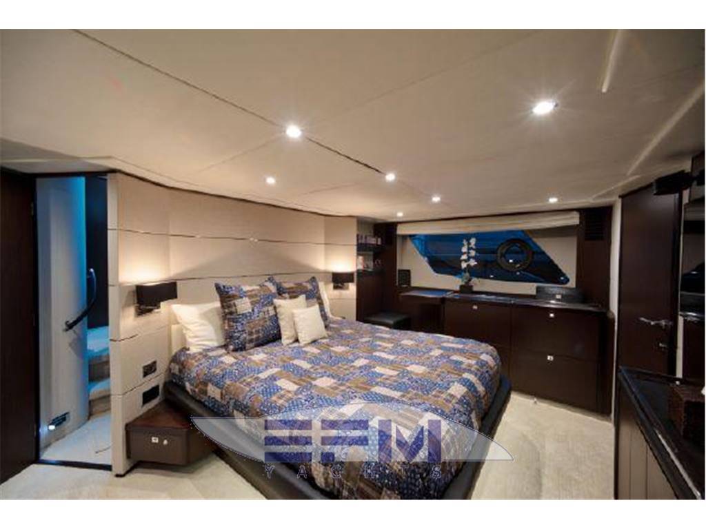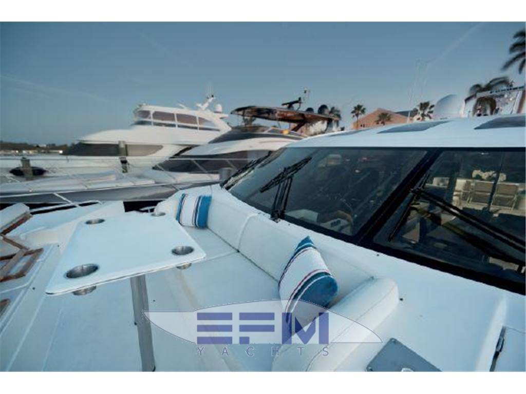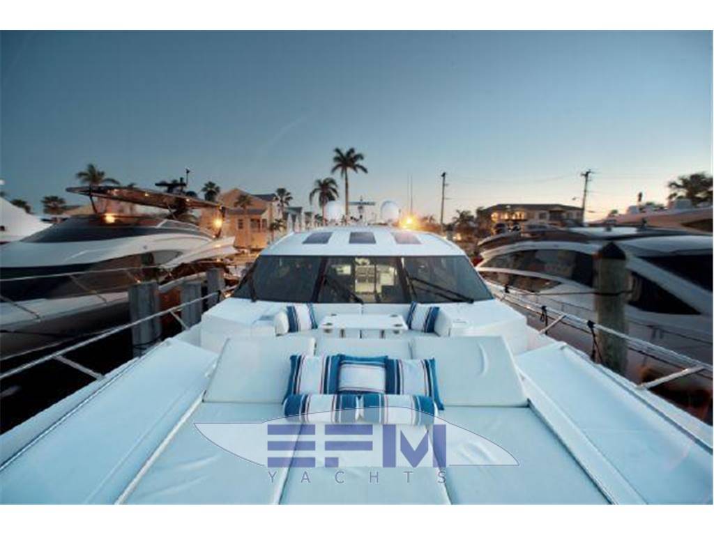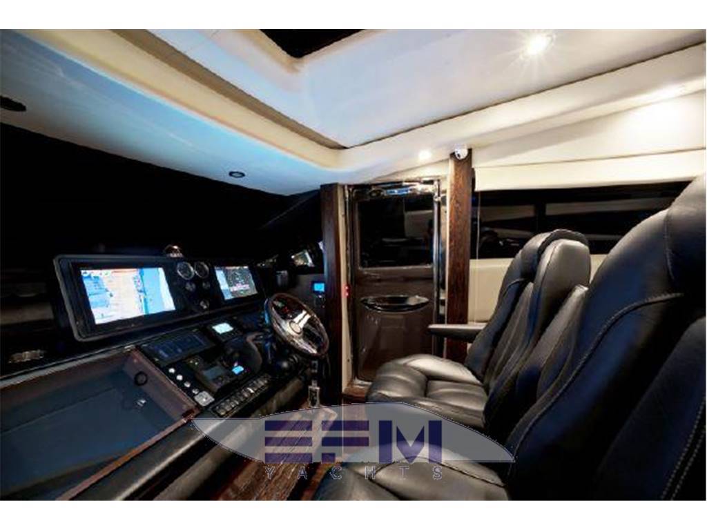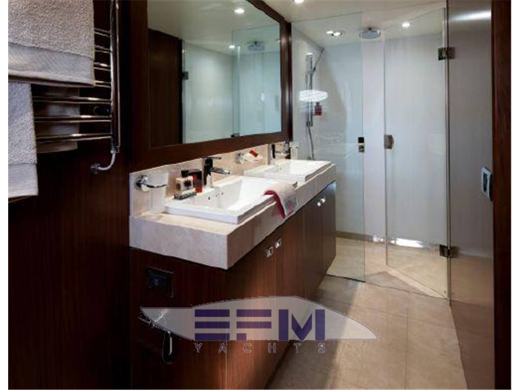 Notas internasNumber of cabins: 4 Number of heads: 4 Master ? Large queen berth looking aft with two reading lights ? Samsung TV ? Xbox 360 ? Sat TV ? Crestron AV ? Panasonic Blu Ray ? Bose surround sound ? Kaleidescope ? Cabinetry to port with large drawers ? Cabinetry with desk/vanity to starboard ? Large walk in wardrobe to port with two safes Master Ensuite Head: ? His and her heads with shared shower ? TV in starboard head ? Large sinks and vanitys Lobby to Master ? Miele washing machine ? Miele Dryer VIP Forward: ? Island Berth ? Twin reading lights ? Storage overhead and closet to starboard ? Samsung TV ? Xbox 360 ? Cruisair AC controller ? Bose Surround sound ? Large overhead skylight and opening hatch ? Port and starboard portholes Ensuite head to starboard: ? Perrin and Rowe large ceramic sink with SS faucet ? Electric head ? Porthole to starboard ? Shower with door Port Stateroom ? Two twin berths ? Reading lights ? Samung TV ? Cruisair controller ? Bose surround sound ? Xbox 360 Guest Head: ? Two entry ways ? Storage below and above ? Electric head ? Ceramic sink with SS faucet ? Shower with door Notas de la instrumentaciónStandard Equipment? Power-assisted electro-hydraulic steering system ? Bow and Stern Thruster ? 22.5kW diesel generator (22.5kW) ? Full air-conditioning ? Remote control electric anchor winch ? Electro-hydraulic trim tabs with indicators ? Autopilot ? VHF with DSC R/T ? Color radar with scanner and GPS/chart plotter (twin displays) ? Speed and distance log ? Echo sounder with alarm ? Remote control searchlight ? Combination microwave/conventional oven/grill ? Full height refrigerator with deep freeze ? Icemaker ? Dishwasher ? Cockpit wetbar with sink, top loading coolbox, electric barbecue, waste bin and stowage ? Electric quietflush toilets with holding tank ? Saloon LED TV/DVD with surround-sound system ? Teak-laid transom platform/cockpit deck/steps to side decks ? Cockpit sunbed and cushions ? Double opening stainless-steel framed saloon door with drop window ? Hard top with electrically operated sliding sunroof ? Electro-hydraulic opening garage with storage for tender or jet ski ? Transom door ? Transom platform with electro-hydraulic raise/lower mechanism ? Hot and cold transom shower ? Tonneau cover Helm ? Black console ? 2 Black Captain's chairs ? Yacht controller ? Sidepower bow and stern thrusters ? Fireboy suppression system display ? Boning displays (tanks, engines, nav, DC and AC controls) ? Xenta joystick control ? ACR spotlight remote ? CAT controls ? Bennett trim tab controls ? Simrad RS87 VHF ? 2 X 14'' Furuno displays (glass panels) ? Furuno autopilot ? Furuno radar ? FLIR control ? Plastimo compass Electronics ? VHF ? Autopilot ? DVD player ? Plotter ? GPS ? Repeater(s) ? Radar ? Computer ? TV set ? CD player Electrical Equipment ? Shore power inlet ? Inverter ? Generator Notas de armamentoSalon? Large Black leather sofa to starboard ? Cabinetry with lots of storage to port (including av storage) ? Panasonic TV ? Large opening sliding glass doors ? Gost Phantom alarm system ? Drawer full of china ? Cruisair A/C controls ? Dimmable light switches ? KVH satellite ? Electric blinds ? Apple TV ? Kaleidescope system ? Crestron ? Panasonic Blu Ray player ? Forward and port side dining table with bench seating plus four chairs ? Wood flooring Settee ? Down below to starboard ? Beige settee ? Dropdown wood table that has filler cushions to become bed and has privacy curtains around ? Samsung TV (32") ? Xbox 360 ? Bose surround sound Galley ? Large standup stainless Whirlpool fridge and freezer ? Ample cabinet storage ? Vitrifrigo icemaker below the steps and next to fridge ? Hansgrohe stainless faucet over SS sink ? Bosch stainless overhead microwave ? Miele Oven Outside Equipment/Extras ? Swimming ladder ? Tender ? Cockpit shower ? Cockpit cushions ? Hydraulic gangway Covers ? Bimini Top ? Cockpit cover Inside Equipment ? Deep freezer ? Marine head ? Battery charger ? Oven ? Air conditioning ? Bow thruster ? Stern thruster ? Heating ? Washing machine ? Sea water pump ? Dishwasher ? Microwave oven ? Refrigerator ? Hot water ? Electric head ? Fresh water maker |