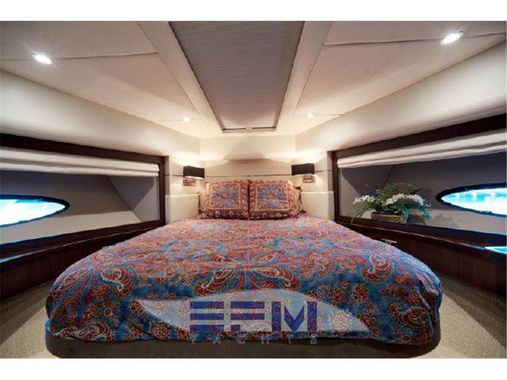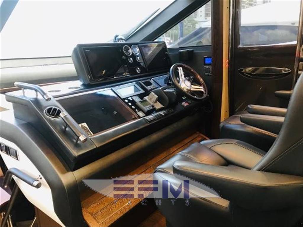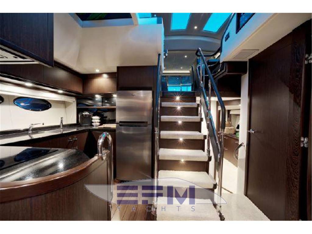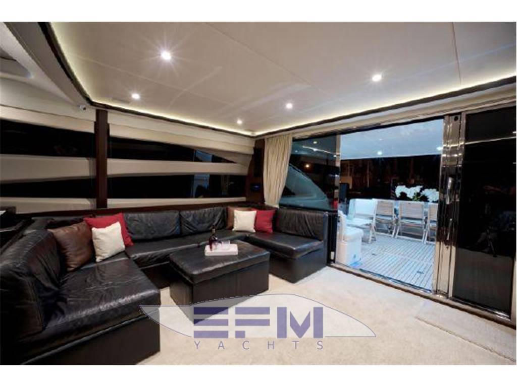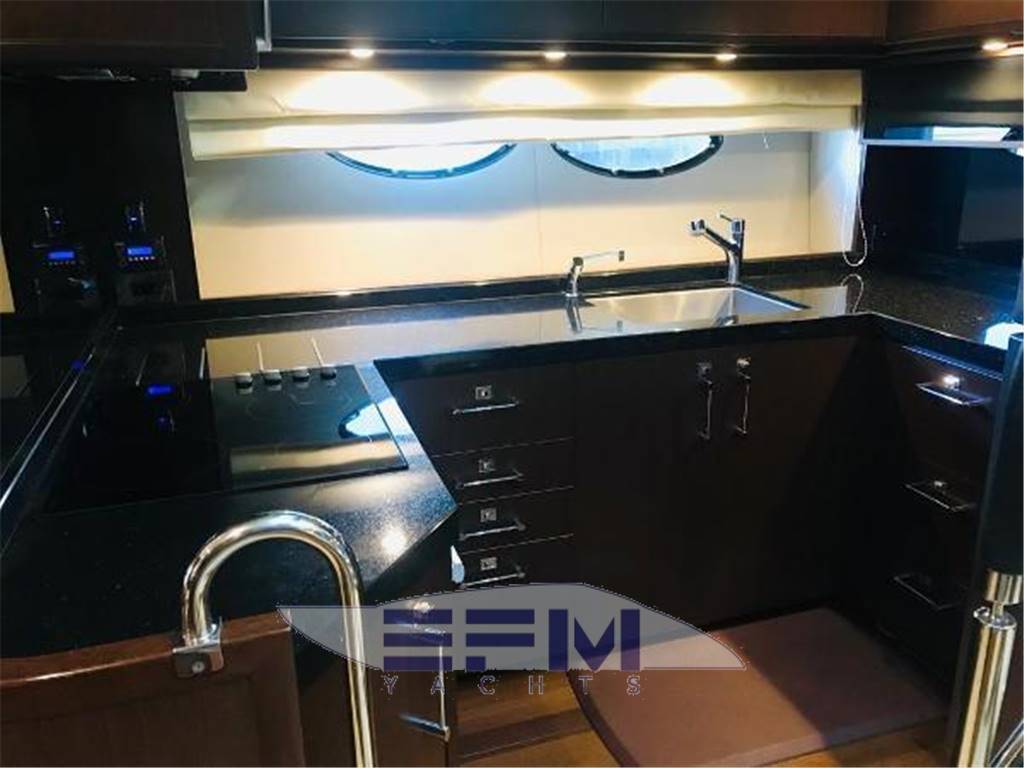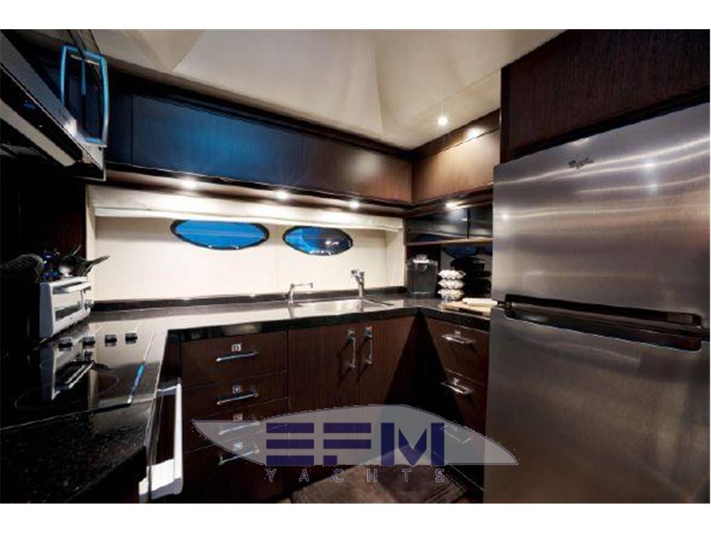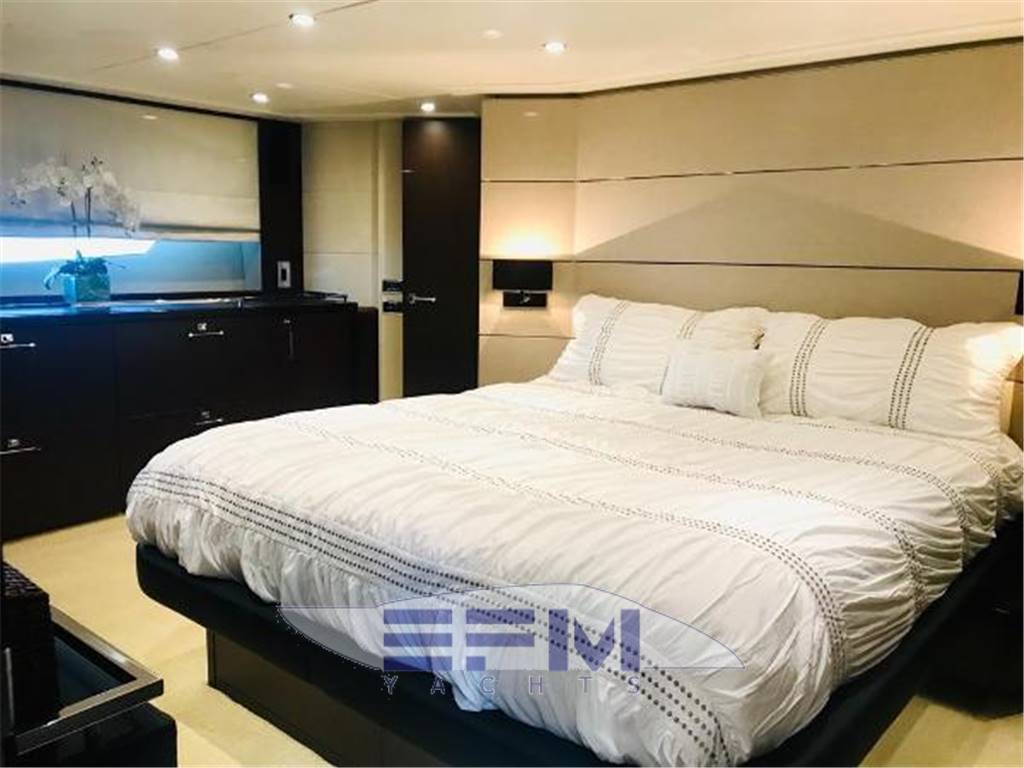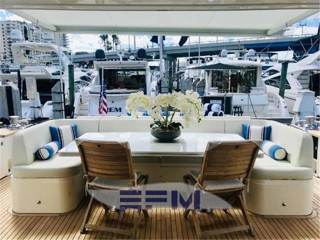Notas internasNumber of cabins: 4 Number of heads: 4 Master ? Large queen berth looking aft with two reading lights ? Samsung TV ? Xbox 360 ? Sat TV ? Crestron AV ? Panasonic Blu Ray ? Bose surround sound ? Kaleidescope ? Cabinetry to port with large drawers ? Cabinetry with desk/vanity to starboard ? Large walk in wardrobe to port with two safes Master Ensuite Head: ? His and her heads with shared shower ? TV in starboard head ? Large sinks and vanitys Lobby to Master ? Miele washing machine ? Miele Dryer VIP Forward: ? Island Berth ? Twin reading lights ? Storage overhead and closet to starboard ? Samsung TV ? Xbox 360 ? Cruisair AC controller ? Bose Surround sound ? Large overhead skylight and opening hatch ? Port and starboard portholes Ensuite head to starboard: ? Perrin and Rowe large ceramic sink with SS faucet ? Electric head ? Porthole to starboard ? Shower with door Port Stateroom ? Two twin berths ? Reading lights ? Samung TV ? Cruisair controller ? Bose surround sound ? Xbox 360 Guest Head: ? Two entry ways ? Storage below and above ? Electric head ? Ceramic sink with SS faucet ? Shower with door Notas de la instrumentaciónStandard Equipment? Power-assisted electro-hydraulic steering system ? Bow and Stern Thruster ? 22.5kW diesel generator (22.5kW) ? Full air-conditioning ? Remote control electric anchor winch ? Electro-hydraulic trim tabs with indicators ? Autopilot ? VHF with DSC R/T ? Color radar with scanner and GPS/chart plotter (twin displays) ? Speed and distance log ? Echo sounder with alarm ? Remote control searchlight ? Combination microwave/conventional oven/grill ? Full height refrigerator with deep freeze ? Icemaker ? Dishwasher ? Cockpit wetbar with sink, top loading coolbox, electric barbecue, waste bin and stowage ? Electric quietflush toilets with holding tank ? Saloon LED TV/DVD with surround-sound system ? Teak-laid transom platform/cockpit deck/steps to side decks ? Cockpit sunbed and cushions ? Double opening stainless-steel framed saloon door with drop window ? Hard top with electrically operated sliding sunroof ? Electro-hydraulic opening garage with storage for tender or jet ski ? Transom door ? Transom platform with electro-hydraulic raise/lower mechanism ? Hot and cold transom shower ? Tonneau cover Helm ? Black console ? 2 Black Captain's chairs ? Yacht controller ? Sidepower bow and stern thrusters ? Fireboy suppression system display ? Boning displays (tanks, engines, nav, DC and AC controls) ? Xenta joystick control ? ACR spotlight remote ? CAT controls ? Bennett trim tab controls ? Simrad RS87 VHF ? 2 X 14'' Furuno displays (glass panels) ? Furuno autopilot ? Furuno radar ? FLIR control ? Plastimo compass Electronics ? VHF ? Autopilot ? DVD player ? Plotter ? GPS ? Repeater(s) ? Radar ? Computer ? TV set ? CD player Electrical Equipment ? Shore power inlet ? Inverter ? Generator Notas de armamentoSalon? Large Black leather sofa to starboard ? Cabinetry with lots of storage to port (including av storage) ? Panasonic TV ? Large opening sliding glass doors ? Gost Phantom alarm system ? Drawer full of china ? Cruisair A/C controls ? Dimmable light switches ? KVH satellite ? Electric blinds ? Apple TV ? Kaleidescope system ? Crestron ? Panasonic Blu Ray player ? Forward and port side dining table with bench seating plus four chairs ? Wood flooring Settee ? Down below to starboard ? Beige settee ? Dropdown wood table that has filler cushions to become bed and has privacy curtains around ? Samsung TV (32") ? Xbox 360 ? Bose surround sound Galley ? Large standup stainless Whirlpool fridge and freezer ? Ample cabinet storage ? Vitrifrigo icemaker below the steps and next to fridge ? Hansgrohe stainless faucet over SS sink ? Bosch stainless overhead microwave ? Miele Oven Outside Equipment/Extras ? Swimming ladder ? Tender ? Cockpit shower ? Cockpit cushions ? Hydraulic gangway Covers ? Bimini Top ? Cockpit cover Inside Equipment ? Deep freezer ? Marine head ? Battery charger ? Oven ? Air conditioning ? Bow thruster ? Stern thruster ? Heating ? Washing machine ? Sea water pump ? Dishwasher ? Microwave oven ? Refrigerator ? Hot water ? Electric head ? Fresh water maker |