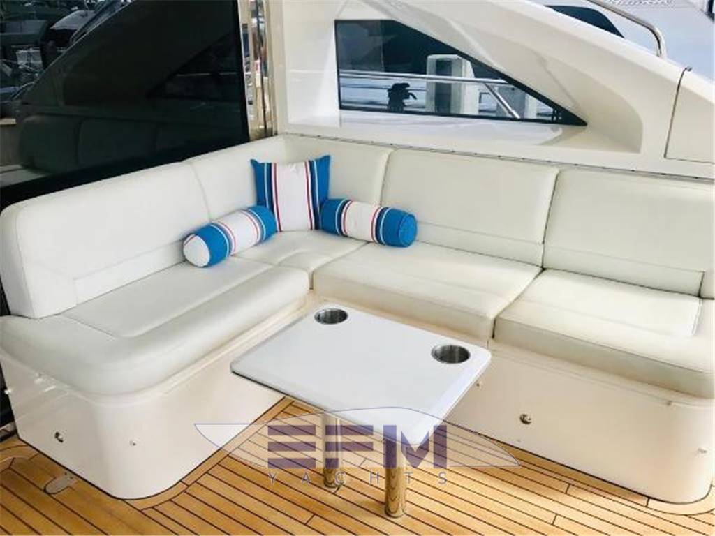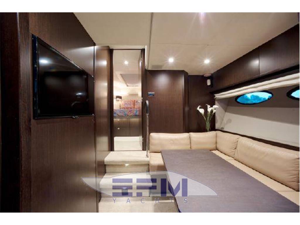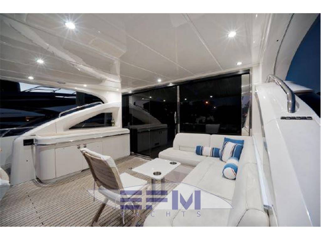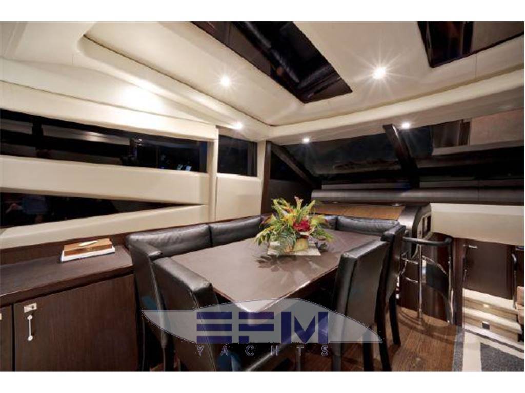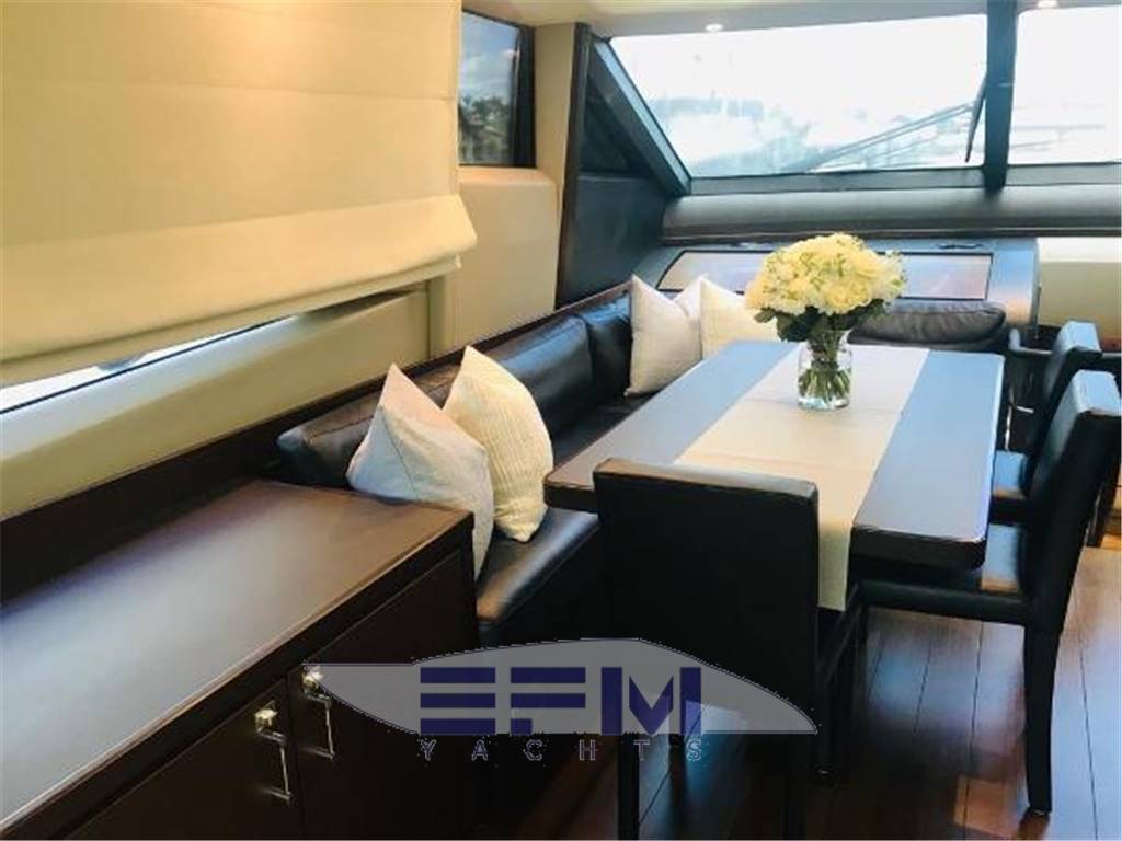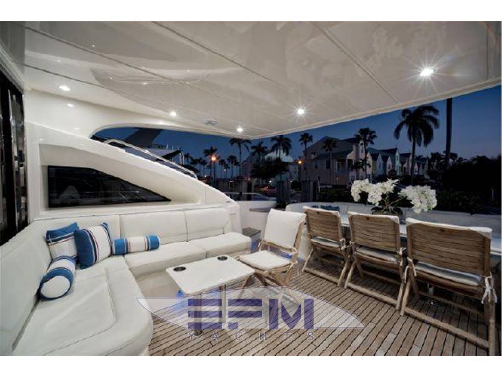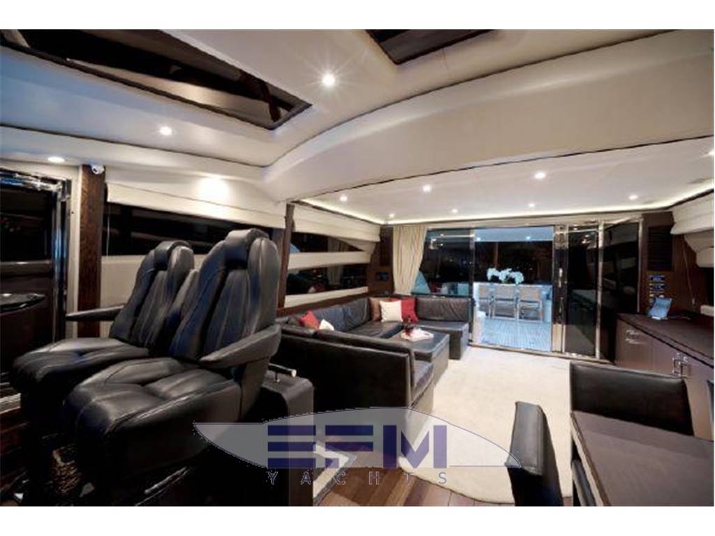 Notas internasNumber of cabins: 4 Number of heads: 4 Master ? Large queen berth looking aft with two reading lights ? Samsung TV ? Xbox 360 ? Sat TV ? Crestron AV ? Panasonic Blu Ray ? Bose surround sound ? Kaleidescope ? Cabinetry to port with large drawers ? Cabinetry with desk/vanity to starboard ? Large walk in wardrobe to port with two safes Master Ensuite Head: ? His and her heads with shared shower ? TV in starboard head ? Large sinks and vanitys Lobby to Master ? Miele washing machine ? Miele Dryer VIP Forward: ? Island Berth ? Twin reading lights ? Storage overhead and closet to starboard ? Samsung TV ? Xbox 360 ? Cruisair AC controller ? Bose Surround sound ? Large overhead skylight and opening hatch ? Port and starboard portholes Ensuite head to starboard: ? Perrin and Rowe large ceramic sink with SS faucet ? Electric head ? Porthole to starboard ? Shower with door Port Stateroom ? Two twin berths ? Reading lights ? Samung TV ? Cruisair controller ? Bose surround sound ? Xbox 360 Guest Head: ? Two entry ways ? Storage below and above ? Electric head ? Ceramic sink with SS faucet ? Shower with door Notas de la instrumentaciónStandard Equipment? Power-assisted electro-hydraulic steering system ? Bow and Stern Thruster ? 22.5kW diesel generator (22.5kW) ? Full air-conditioning ? Remote control electric anchor winch ? Electro-hydraulic trim tabs with indicators ? Autopilot ? VHF with DSC R/T ? Color radar with scanner and GPS/chart plotter (twin displays) ? Speed and distance log ? Echo sounder with alarm ? Remote control searchlight ? Combination microwave/conventional oven/grill ? Full height refrigerator with deep freeze ? Icemaker ? Dishwasher ? Cockpit wetbar with sink, top loading coolbox, electric barbecue, waste bin and stowage ? Electric quietflush toilets with holding tank ? Saloon LED TV/DVD with surround-sound system ? Teak-laid transom platform/cockpit deck/steps to side decks ? Cockpit sunbed and cushions ? Double opening stainless-steel framed saloon door with drop window ? Hard top with electrically operated sliding sunroof ? Electro-hydraulic opening garage with storage for tender or jet ski ? Transom door ? Transom platform with electro-hydraulic raise/lower mechanism ? Hot and cold transom shower ? Tonneau cover Helm ? Black console ? 2 Black Captain's chairs ? Yacht controller ? Sidepower bow and stern thrusters ? Fireboy suppression system display ? Boning displays (tanks, engines, nav, DC and AC controls) ? Xenta joystick control ? ACR spotlight remote ? CAT controls ? Bennett trim tab controls ? Simrad RS87 VHF ? 2 X 14'' Furuno displays (glass panels) ? Furuno autopilot ? Furuno radar ? FLIR control ? Plastimo compass Electronics ? VHF ? Autopilot ? DVD player ? Plotter ? GPS ? Repeater(s) ? Radar ? Computer ? TV set ? CD player Electrical Equipment ? Shore power inlet ? Inverter ? Generator Notas de armamentoSalon? Large Black leather sofa to starboard ? Cabinetry with lots of storage to port (including av storage) ? Panasonic TV ? Large opening sliding glass doors ? Gost Phantom alarm system ? Drawer full of china ? Cruisair A/C controls ? Dimmable light switches ? KVH satellite ? Electric blinds ? Apple TV ? Kaleidescope system ? Crestron ? Panasonic Blu Ray player ? Forward and port side dining table with bench seating plus four chairs ? Wood flooring Settee ? Down below to starboard ? Beige settee ? Dropdown wood table that has filler cushions to become bed and has privacy curtains around ? Samsung TV (32") ? Xbox 360 ? Bose surround sound Galley ? Large standup stainless Whirlpool fridge and freezer ? Ample cabinet storage ? Vitrifrigo icemaker below the steps and next to fridge ? Hansgrohe stainless faucet over SS sink ? Bosch stainless overhead microwave ? Miele Oven Outside Equipment/Extras ? Swimming ladder ? Tender ? Cockpit shower ? Cockpit cushions ? Hydraulic gangway Covers ? Bimini Top ? Cockpit cover Inside Equipment ? Deep freezer ? Marine head ? Battery charger ? Oven ? Air conditioning ? Bow thruster ? Stern thruster ? Heating ? Washing machine ? Sea water pump ? Dishwasher ? Microwave oven ? Refrigerator ? Hot water ? Electric head ? Fresh water maker |