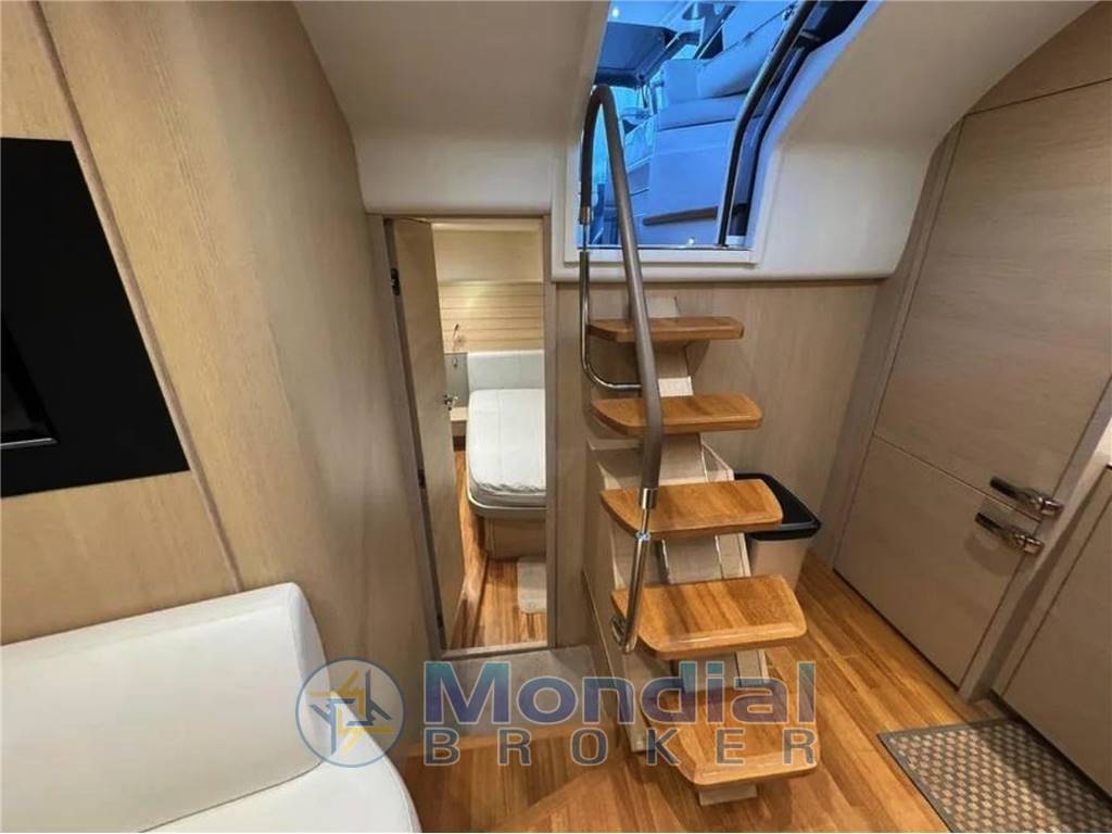 Notas internasBoat with en-suite bathroom – VIP cabin at the front with double bed – guest bathroom with double access: Fore cabin with double berth En suite head with separate shower ,Wc and washbasin to port side Access to head via fore cabin and saloon Saloon with U shaped Sofa to starboard and galley to port side Access to central master cabin Full beam master cabin with double berth En suite head with separate shower, WC and washbasin to starboard side Stairs to cockpit Helm to starboard side with pilot and co pilot's seats Chaise longue to port side Large U shaped cockpit lounge to starboard Opening hard top Aft sun deck on garage roof Hydraulic hi lo swim platform Fore deck with sun pad Notas de la instrumentaciónaymarine Axiom XL 16 (15.6") Chartplotter/GPS with multifunction display - European version plotter - International VHF - AutopilotNotas de armamentoBow thruster (120 kgf) - Interior in Alba oak with satin finishes - Parquet flooring in all interiors - Kitchen countertop in white Sylmar - Convertible dinette table into double bed -Second door in the front bathroom - Blackout skylight in the salon - Upgrade for Milan IX and Ultraleather fabric - Gangway with dual control - Telescopic gangway - Continental sockets 220v/240v – Barbecue in the cockpit bar area - Adjustable dinette lights - Adjustable lights in the cockpit - Chain counter in the console - In the dinette: 32" HD LED TV with Fusion MS-AV755 with Radio/DVD/MP3 with Bluetooth - Dishwasher in the kitchen - Hot/cold air conditioning 32,000 BTU - Mosquito nets in all opening portholes - Electric black water drainage system - Grey canvas exterior coverings - Sunbathing cushions by bow in Comfort Exterior III Met ICE with MET STERLING contrasts - Cockpit seats in Comfort Exterior III Met ICE with MET STERLING contrasts - Telescopic awning in the cockpit - Sounder - Package exterior lights - Underwater lights at the rear (2 lumishore SMX53 white) Electro-hydraulic swimming platform ONAN generator 11kw/50Hz R |