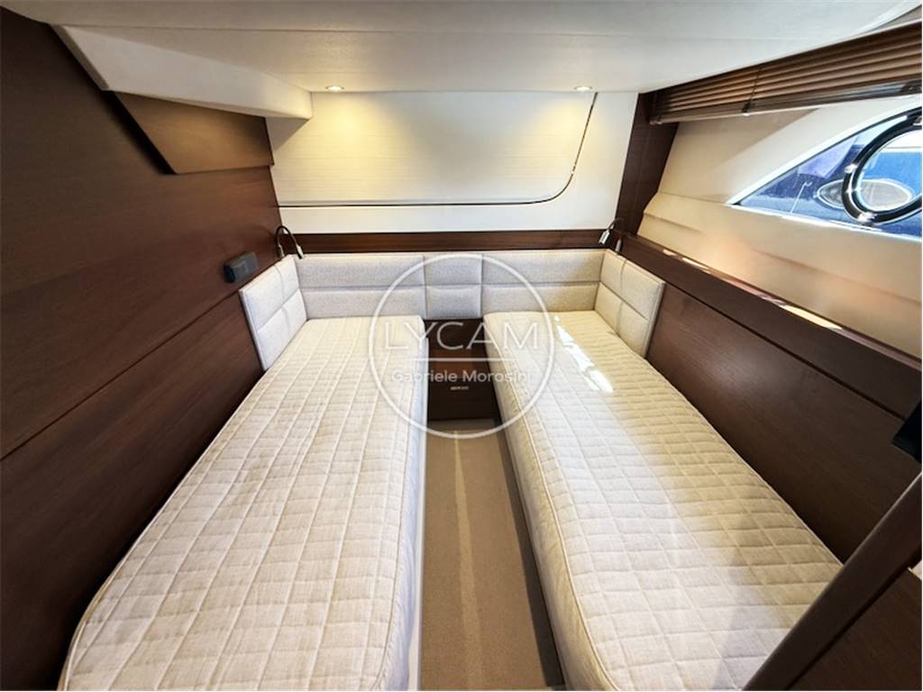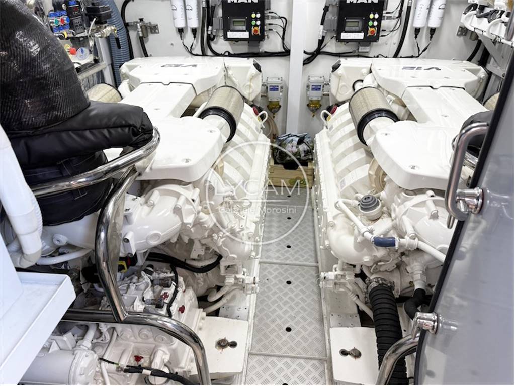 Notas internasAttraverso la grande plancietta poppiera è possibile accedere al pozzetto protetto dal fly e caratterizzato da ampio divano a U con tavolo per i pranzi all’aria aperta. Il ponte principale è quasi esclusivamente dedicato alla zona giorno e al salone. Infatti, entrando all’interno della sovrastruttura, si trova sulla sinistra un’attrezzata cucina che serve la zona pranzo sulla parte opposta. Procedendo verso prua, a centro barca, vi è la spaziosa dinette con divano a C e poltrone con mobile contenente TV a scomparsa. Oltre questa zona vi è la timoneria collocata sulla murata di destra mentre sul lato opposto un comodo e funzionale divanetto. Nella zona prodiera della coperta è stato ricavato un grande prendisole. INTERNI: Scendendo sottocoperta attraverso l’accesso a lato della timoneria si trovano le cabine doppie con letti in piano servite da un bagno in comune mentre a prua la cabina VIP con locale toilette en-suite. La cabina armatoriale ha un accesso riservato dalla zona della dinette principale ed è dotata di divanetto panoramico sulla murata di sinistra e locale bagno en-suite. A poppa estrema vi è il locale equipaggio con cabina con letti doppi in piano e locale bagno annesso. Il fly ha un allestimento funzionale con area living, tavolo, sedute e plancia di comando protette dal soft top. Notas de la instrumentaciónPilota automatico; Ecoscandaglio; Anemometro Raymarine; GPS/Plotter Raymarine; Manette motori elettroniche; Flaps; VHF; Bussola; Stabilizzatori Seakeeper mod. 16 (290 ore); Radar; Radio Hi-fiNotas de armamentoLuci di navigazione; luce di fonda; Aria condizionata; Generatore Cummins Onan 1 (2338 ore); Generatore Cummins Onan 2 (933 ore); Boiler; Caricabatterie; Batterie; Presa 220V; Stacca-batterie; Microonde; Lavatrice; Asciugatrice; 2 Congelatori; Forno; Lavastoviglie; 2 Frighi; Pompe sentina automatiche; Pompa acque grigie; Salpa ancore elettrico; Winch tonneggio pozzetto; Tavolo pozzetto in legno; Pozzetto in teak; Plancetta poppiera in teak; Scaletta bagno; Passerella idraulica; Doccia pozzetto; Sirena; Tergicristalli; Tv; Impianto Tv-sat; Cuscinerie esterne; Griglia BBQ; Passavanti in teak; Mezzomarinaio |