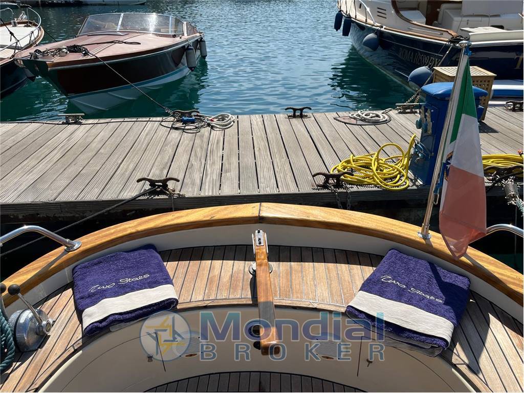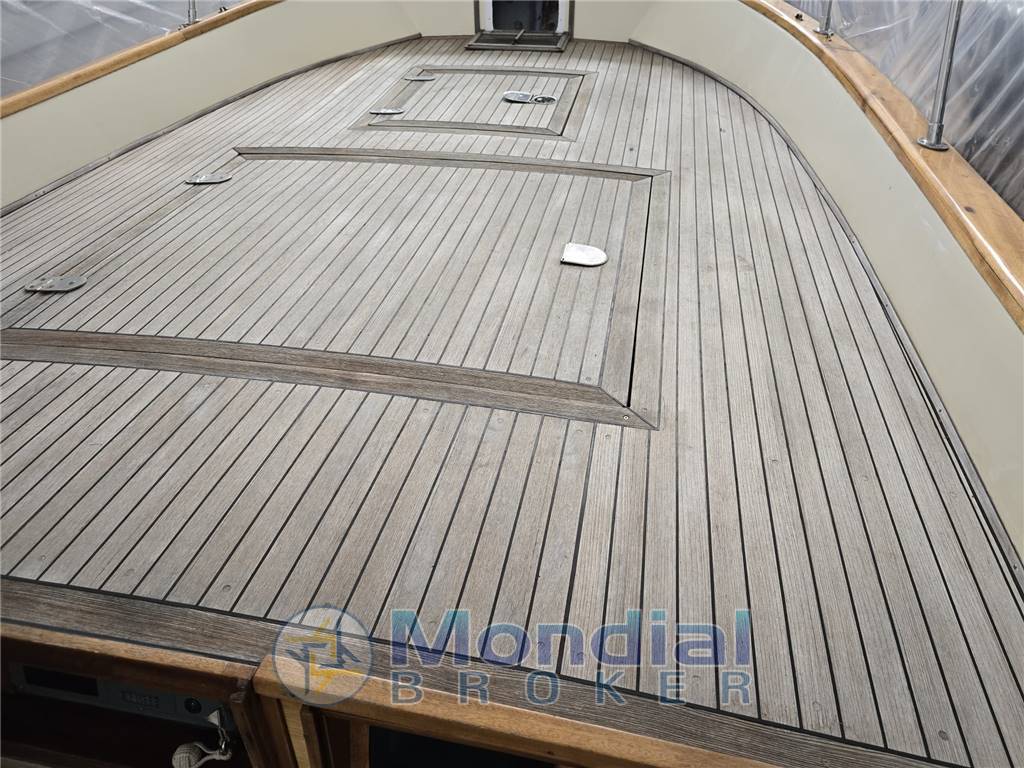 Timoneria a BARRA, Scafo blu, Rifinitura del capo di banda in mogano verniciato a coppale ( in buone condizioni) , Coperta e Pozzetto in teak, Marmitta silenziatrice, Baderna anti-goccia. |