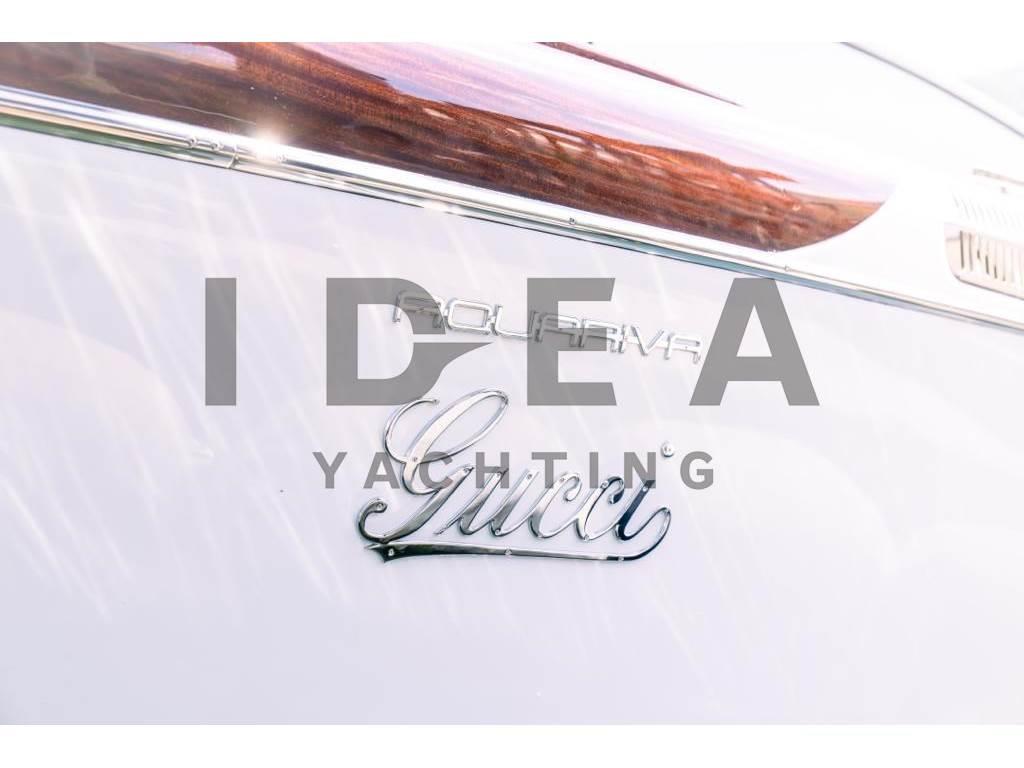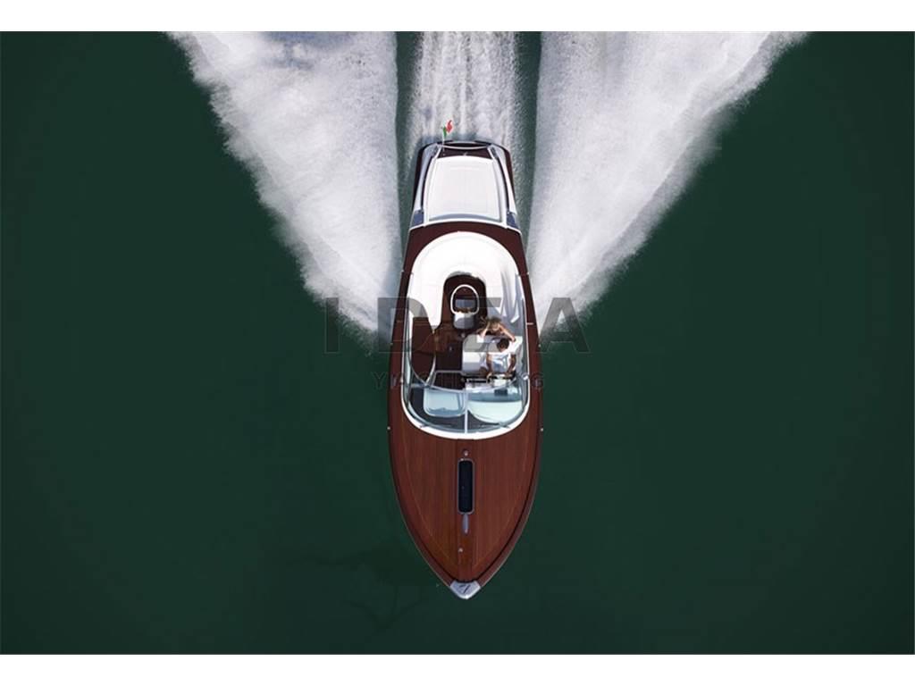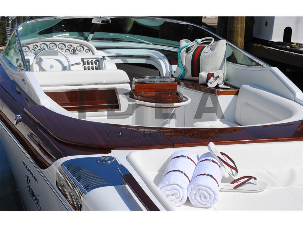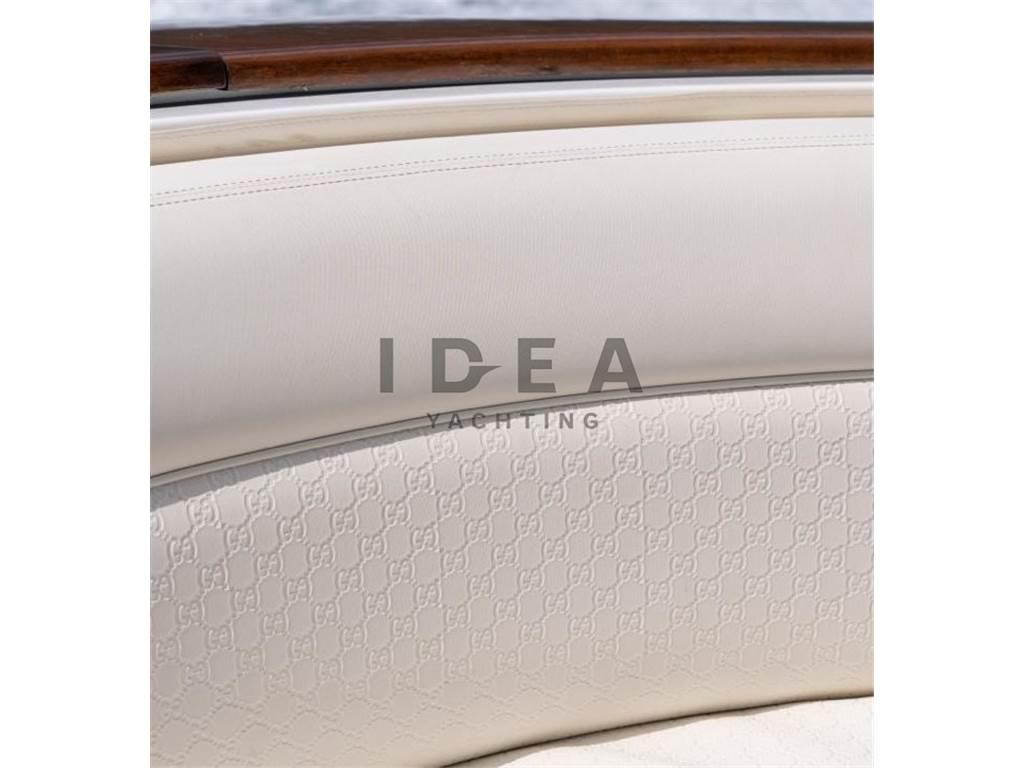 La barca consiste in uno scafo in vetroresina verniciato nella tonalità di bianco lucido di Gucci, mentre il mogano di Riva con la sua magistrale fini |