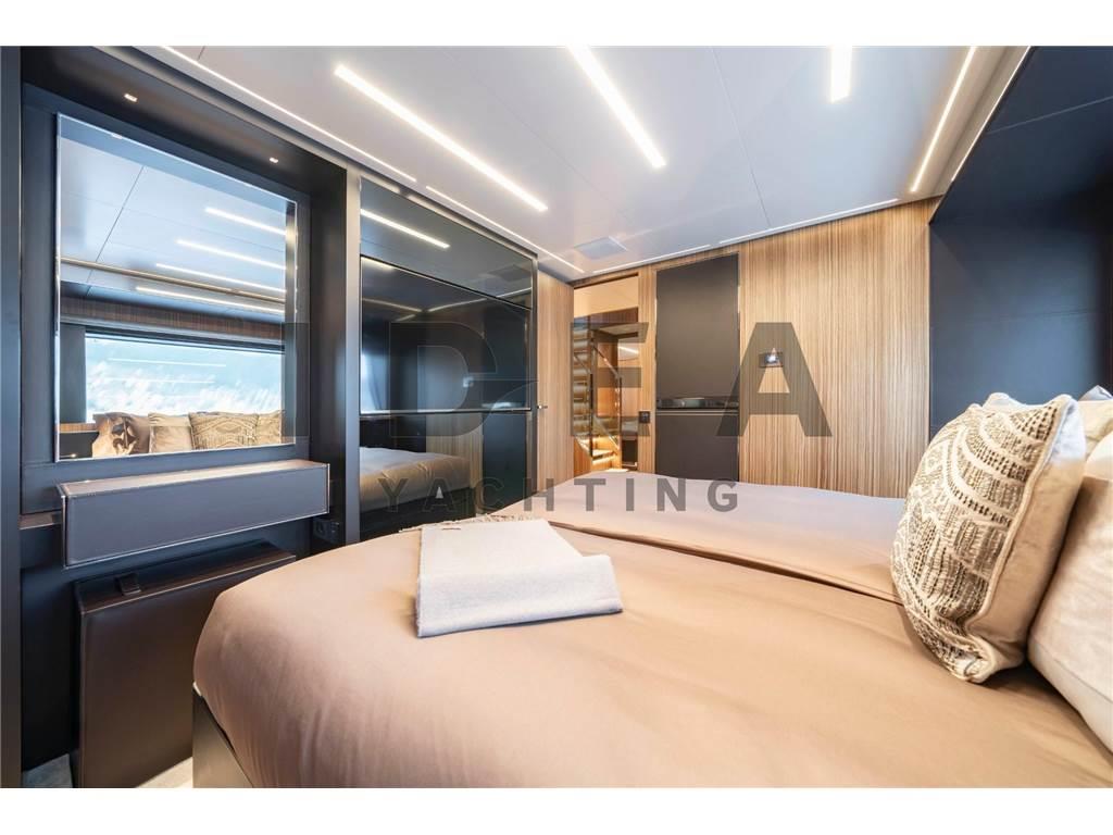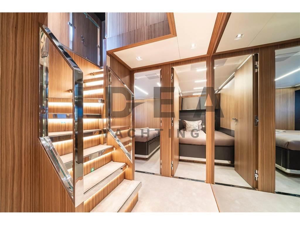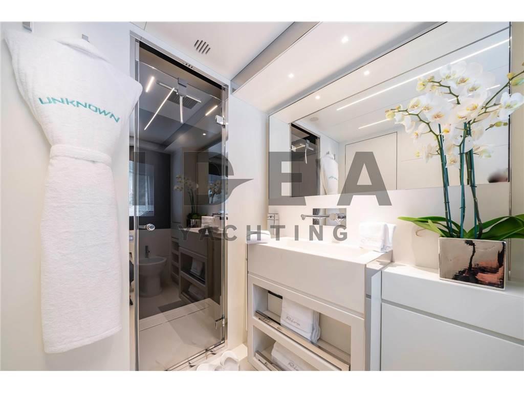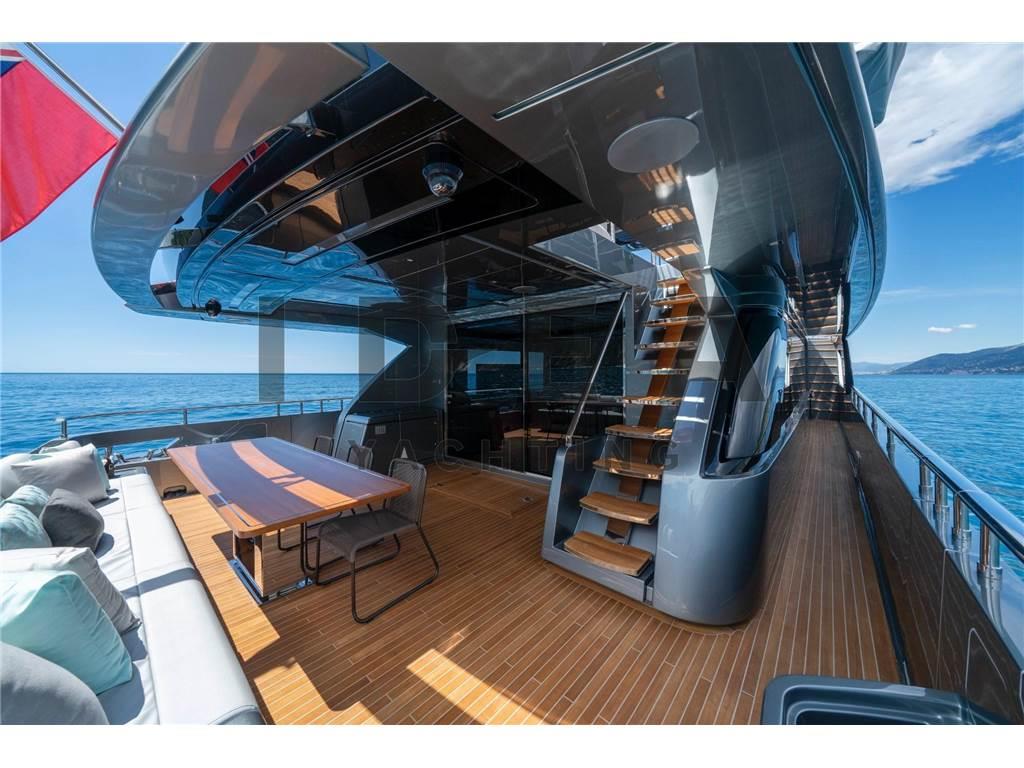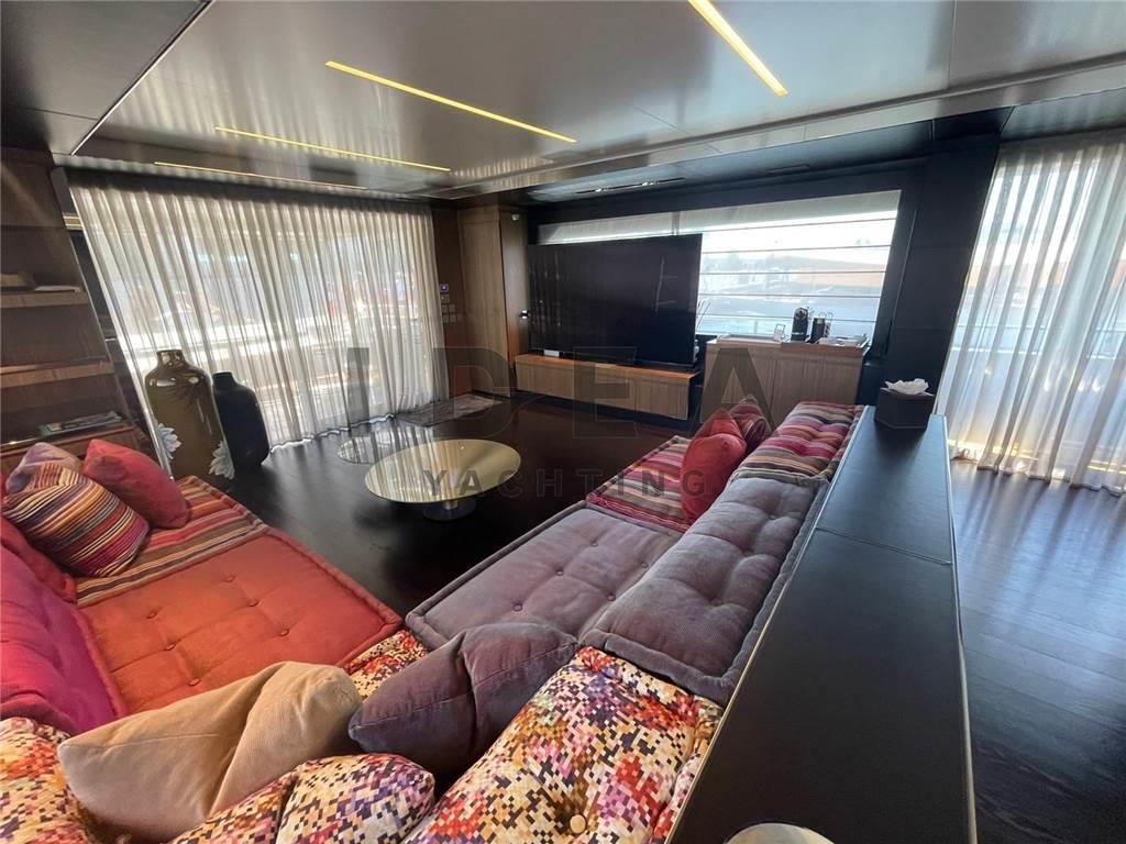 Notas de armamentoAllestimento tecnico e di coperta: Allarme fumo/gas, Allarme motore, Allarme sentina, Ancora, Camminamenti laterali in teak, Caricabatterie (Automatic for generators), Doccia esterna, Doppia timoneria, Elica di poppa - stern thruster (Side Power 32hp), Elica di prua - bow thruster (Side Power 32hp), Faro orientabile, Garage per tender, Hard top, Luci di cortesia, Passerella (Hydraulic), Piattaforma, Pompa di sentina automatica, Pompa di sentina elettrica, Pompa di sentina manuale, Porta ingresso, Pozzetto Teak, Presa 220V banchina, Presa acqua banchina, Ripetitore strumentazione (N°4 Simrad IS42), Salpa Ancore Elettrico, Scaletta da bagno, 2 Stabilizzatori (Seakeeper), Tavolo pozzetto, Tender (Williams Sportjet 435), Tromba, Winch Elettrico, 2 Winch tonneggio di poppa, 2 Winch tonneggio di prua.