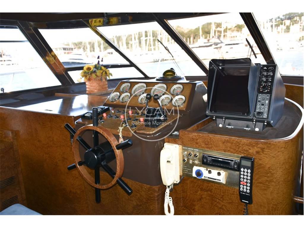 Notas de la instrumentaciónDoppia stazione di comando - fly e interno - con strumentazione motori originale, angolo barra, bussole 2, contamiglia, radar Furuno, VHF, autoradio con altoparlanti salone ,pozzetto e fly, autoradio in ogni camera, faro navigazione notturna con controllo doppio, antenna tv.