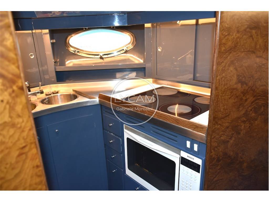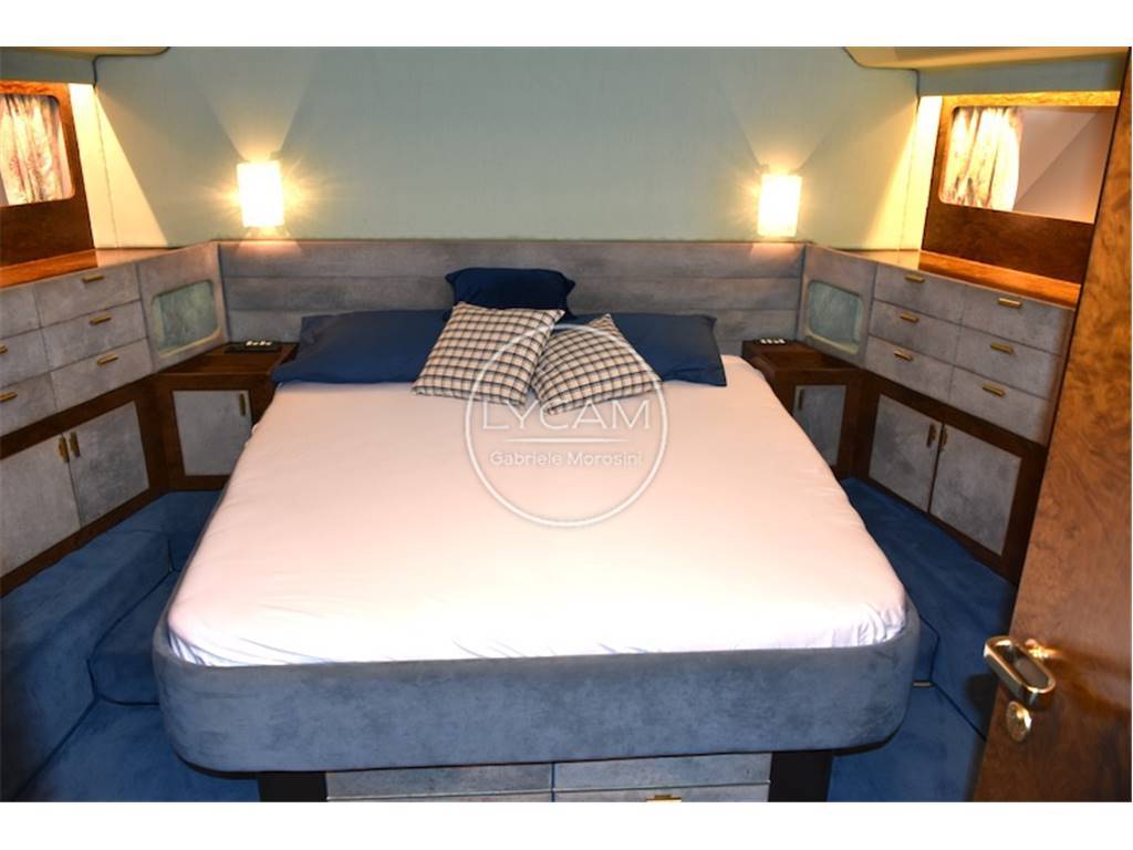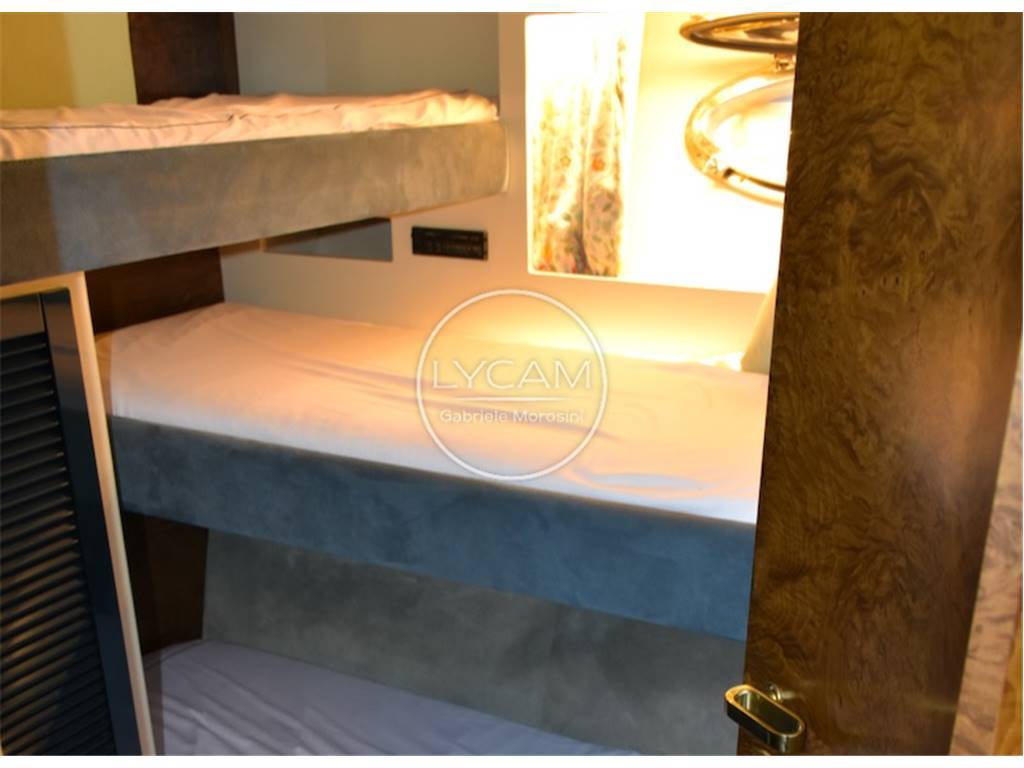 Notas de armamentoAria condizionata freddo /caldo regolabile in ogni ambiente; Cassaforte; Pompe sentina automatiche; Caribatteria doppio uno per il circuito 12v ed uno per 24v; Stacca batterie; Impianto antincendio automatico; Generatore Onan 25kw; Dissalatore; Autoclave; Boiler; Salpa ancora elettrico con funzione winch; Frigoriferi; Elica di prua; Cabina equipaggio; Tergicristalli; Plancetta di poppa con scaletta bagno e doccia; doppio boiler con controllo indipendente uno da 40 lt. Ed uno da 60 lt; Cassaforte; impianto acque nere; inverter, prese elettriche 220v 12v 24v; wc elettrici; congelatore cucina; frigorifero cucina; frigobar salone; frigo salone; piastra in vetroceramica Bosch; Forno multiuso tradizionale e microonde Bosch; doccia esterna pozzetto, doccia esterna prendisole prua; flap idraulici; due gruette elettriche per sollevamento tender in acciaio inox; lavaggio catena; passerella idraulica Besenzoni Futura; Piattaforma; pompe di sentina manuali e automatiche; prese a mare nuove; porta ingresso inox, pozzetto teak; presa acqua banchina; winch a poppa.