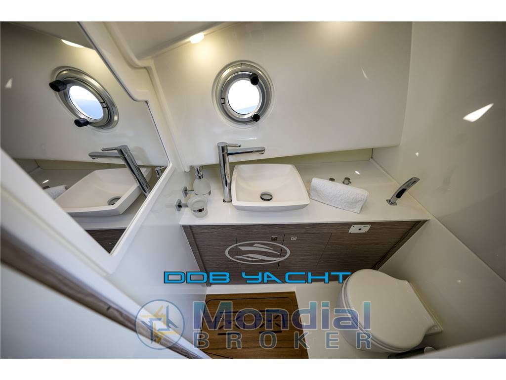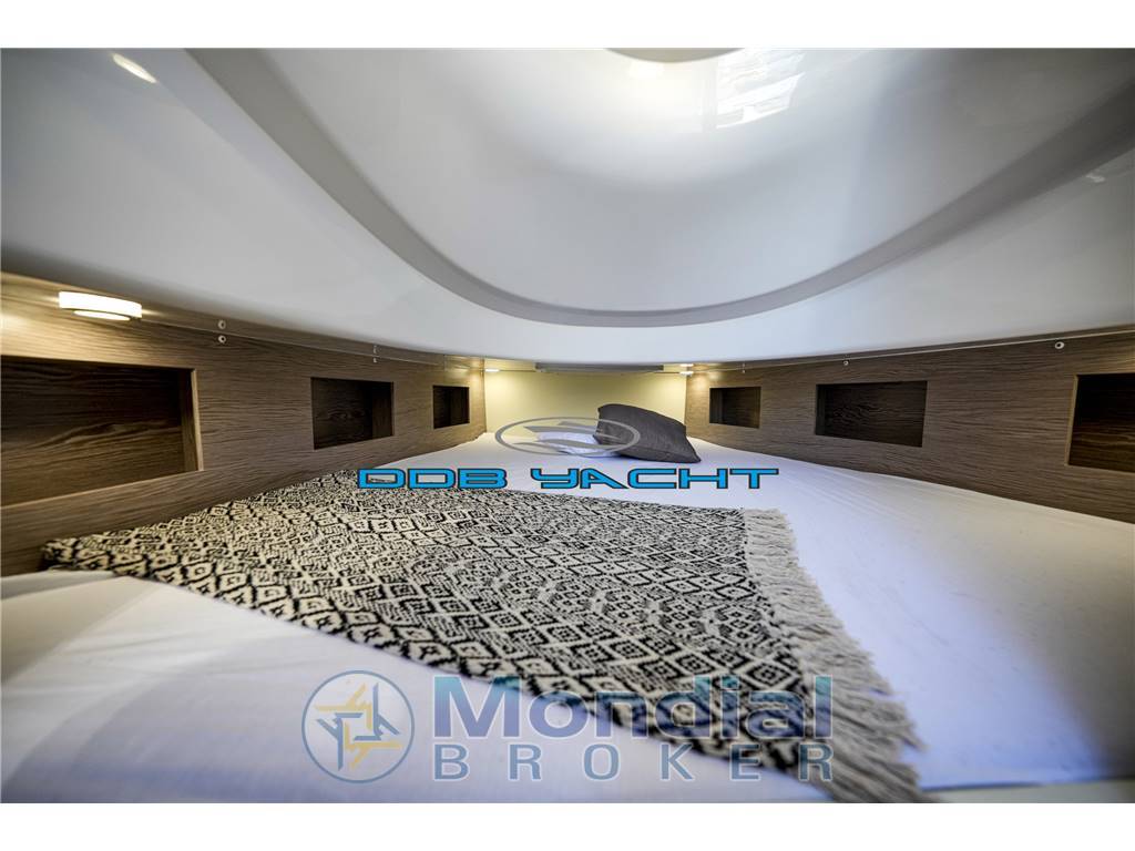 Notas internascabina open space con letto a V a prua, WC separato; ampio prendisole di poppa con divani corredati di tappezzerie e con tavolo, plancia comando con seduta pilota e co pilota, mobile con lavabo, tagliere e doppio frigo, prendisole di prua.
